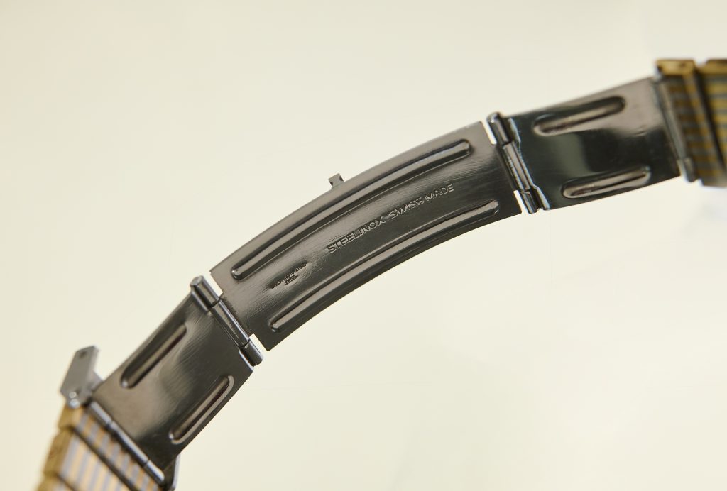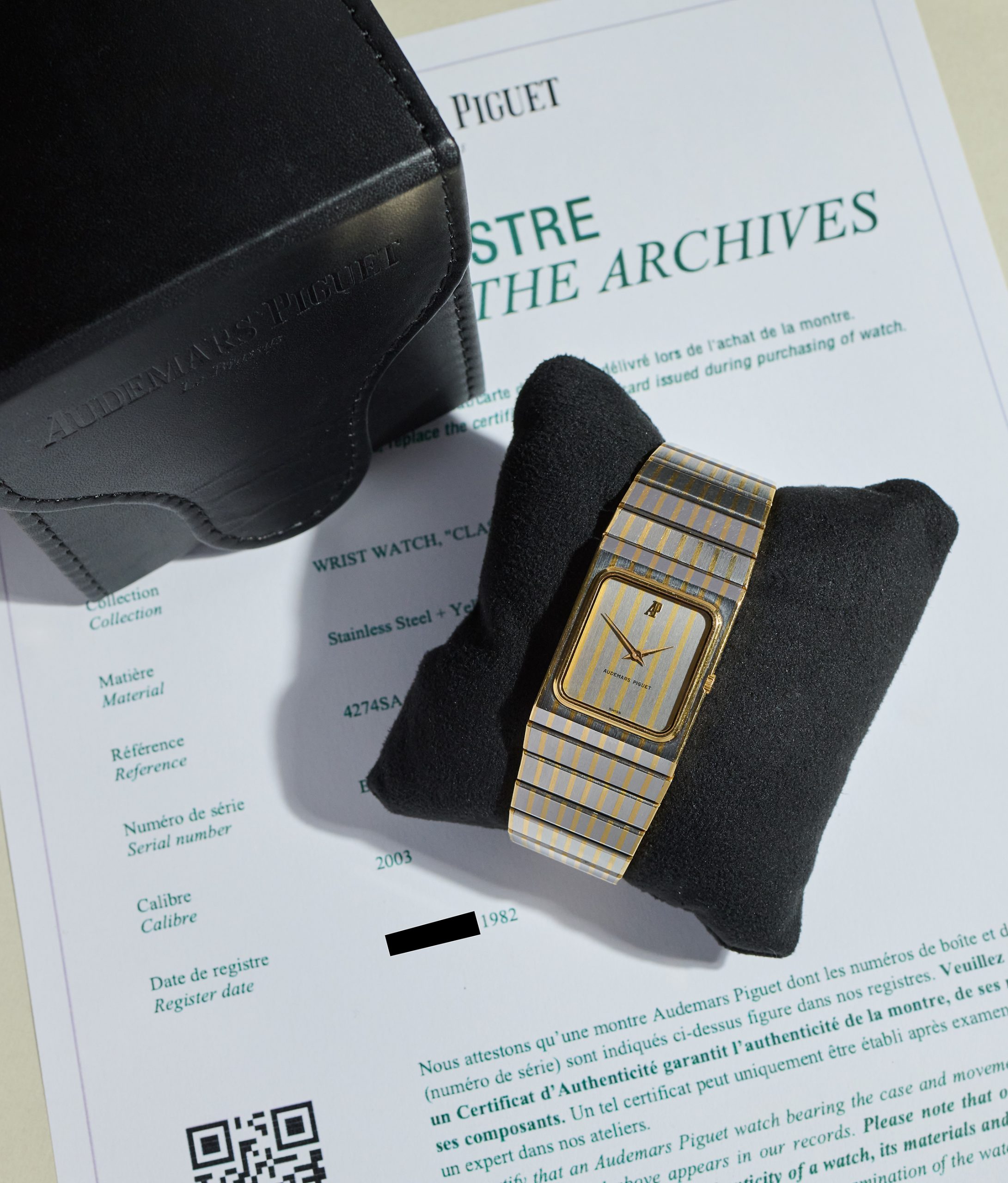 The 25 x 32,5 mm steel & 18k gold case with integrated bracelet (serial number B6xxxx) has never been polished before. The AP from 1982 will currently fit wrists up to a circumference of 18 cm. Links can easily be taken out for smaller wrists. One more link will be added, so it could even fit wrists up to a size of 18,5 cm. The handwinding AP caliber 2003 was checked through and runs exactly, not being in the need for a service in the near future. The watch is in full original condition and very well preserved, with only minor signs of wear. It comes with a freshly made extract from the AP archives and an AP leather travel box.