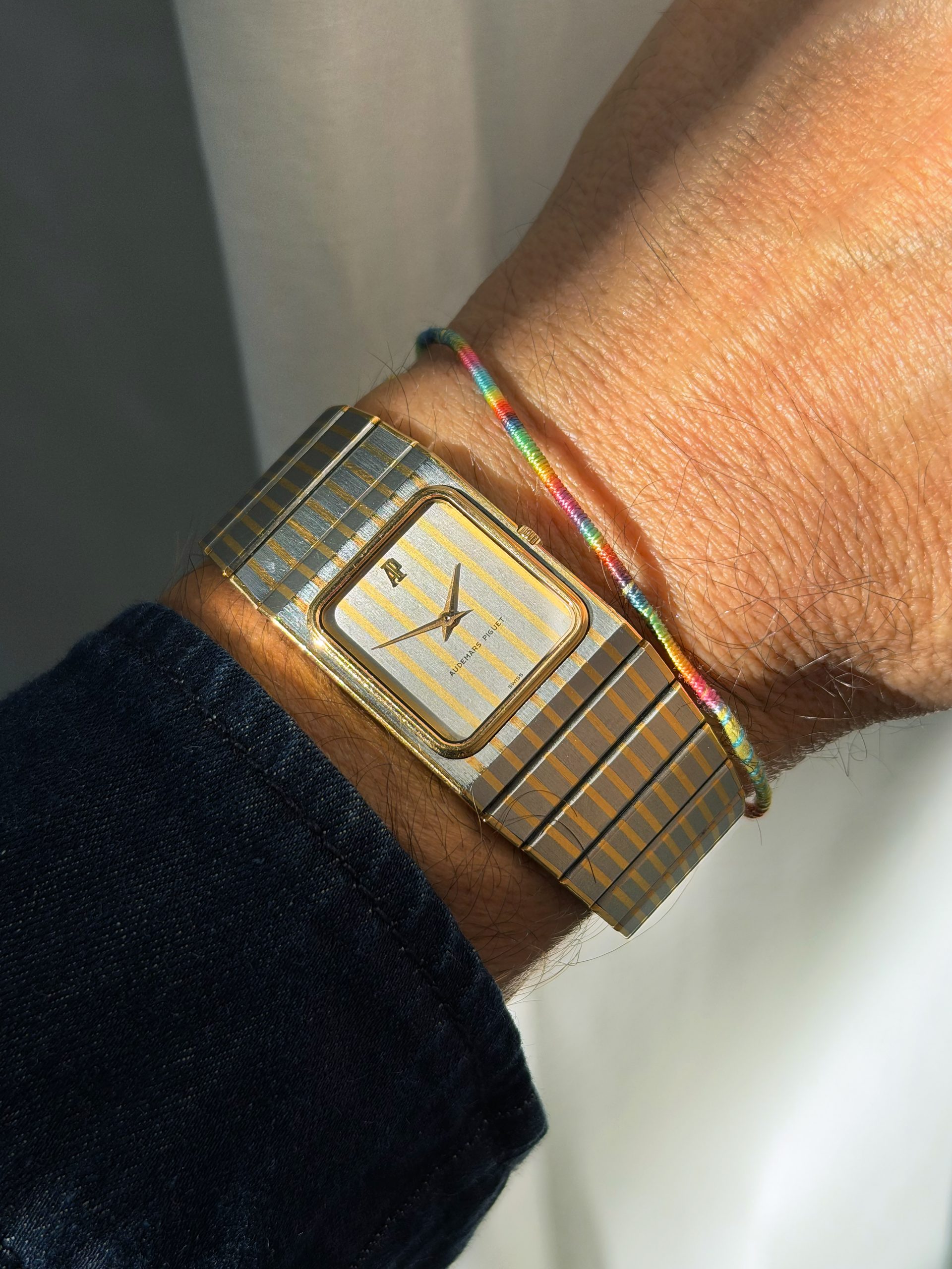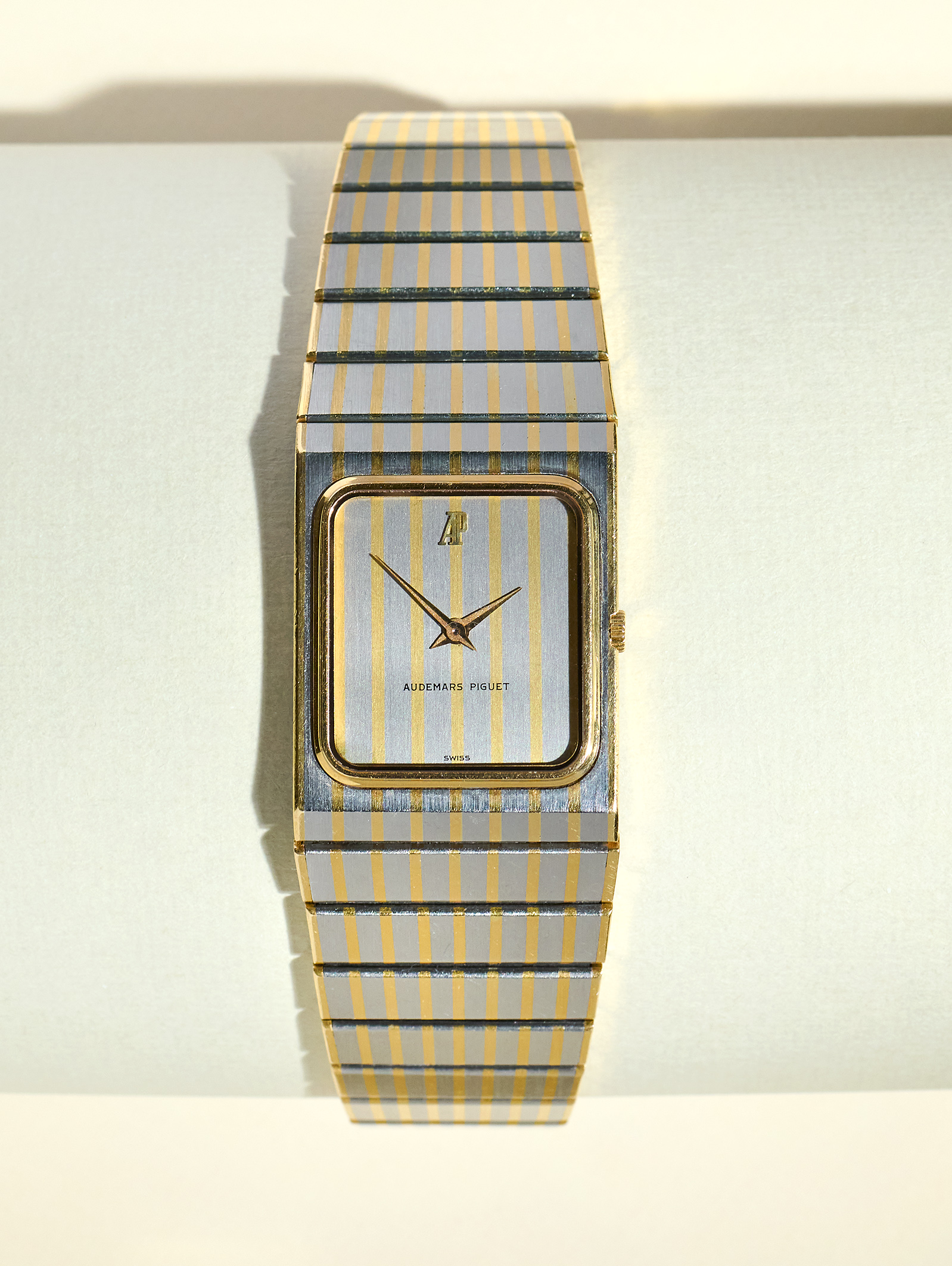 This is the very rare and exclusive Audemars Piguet ‘Pyjamas’ or ‘Zebra’ Jumbo version, reference 4274, which is immediately recognisable by its nine gold lines, instead of the seven found on the smaller version. It´s one of only 300, in the early 1980s produced, pieces. The reference is also exhibited in the Audemars Piguet museum (see this nice video from the AP instagram channel).