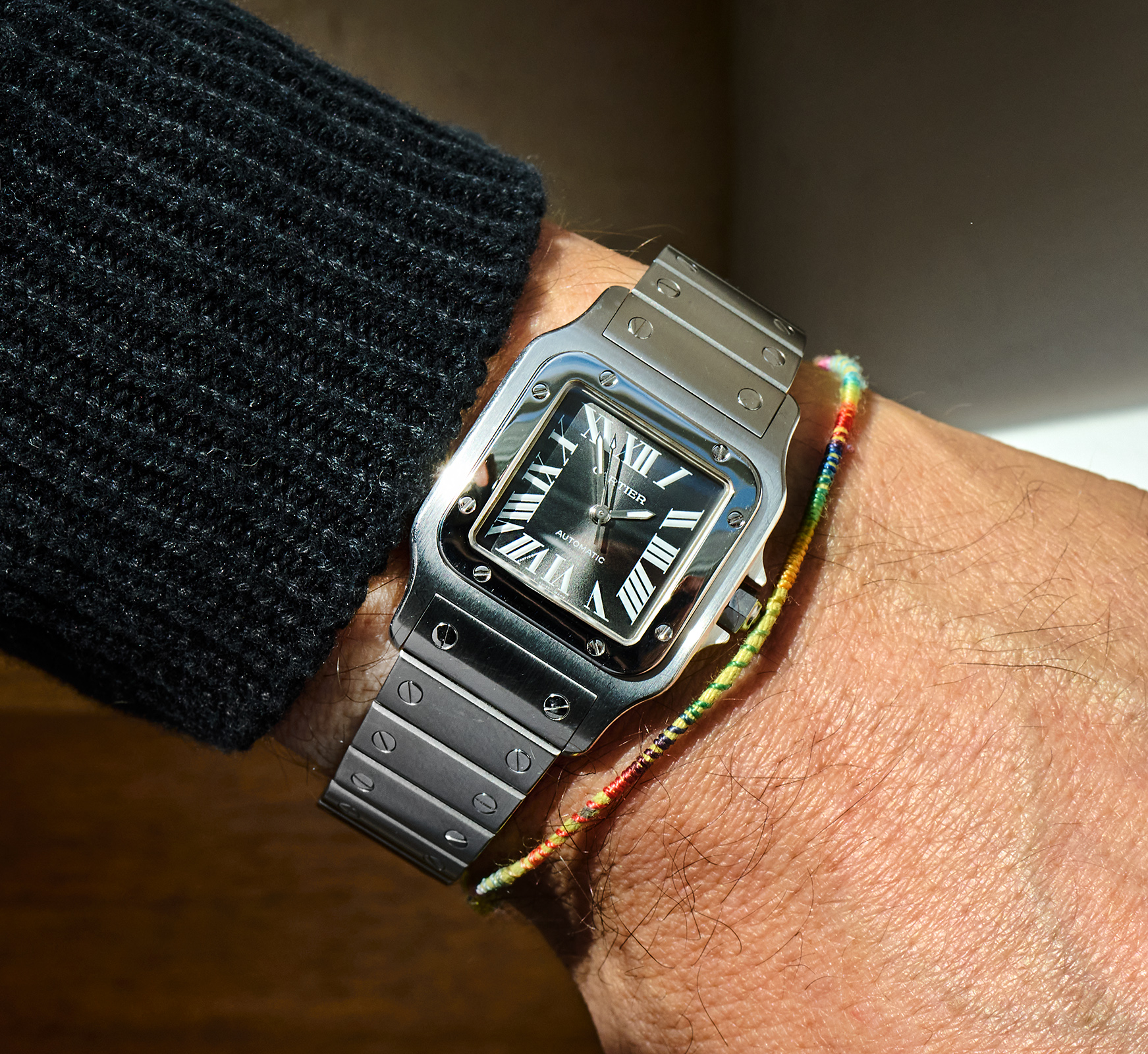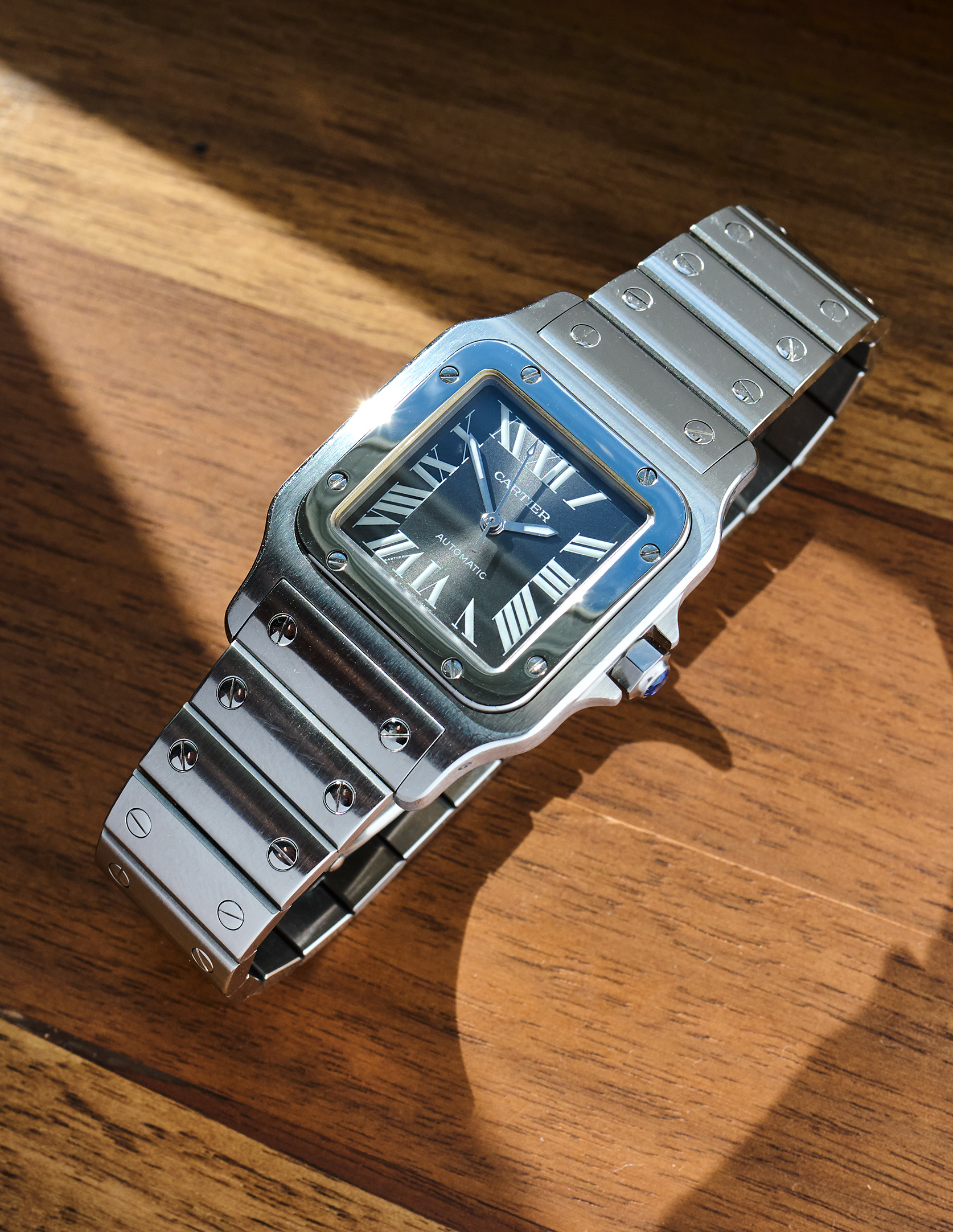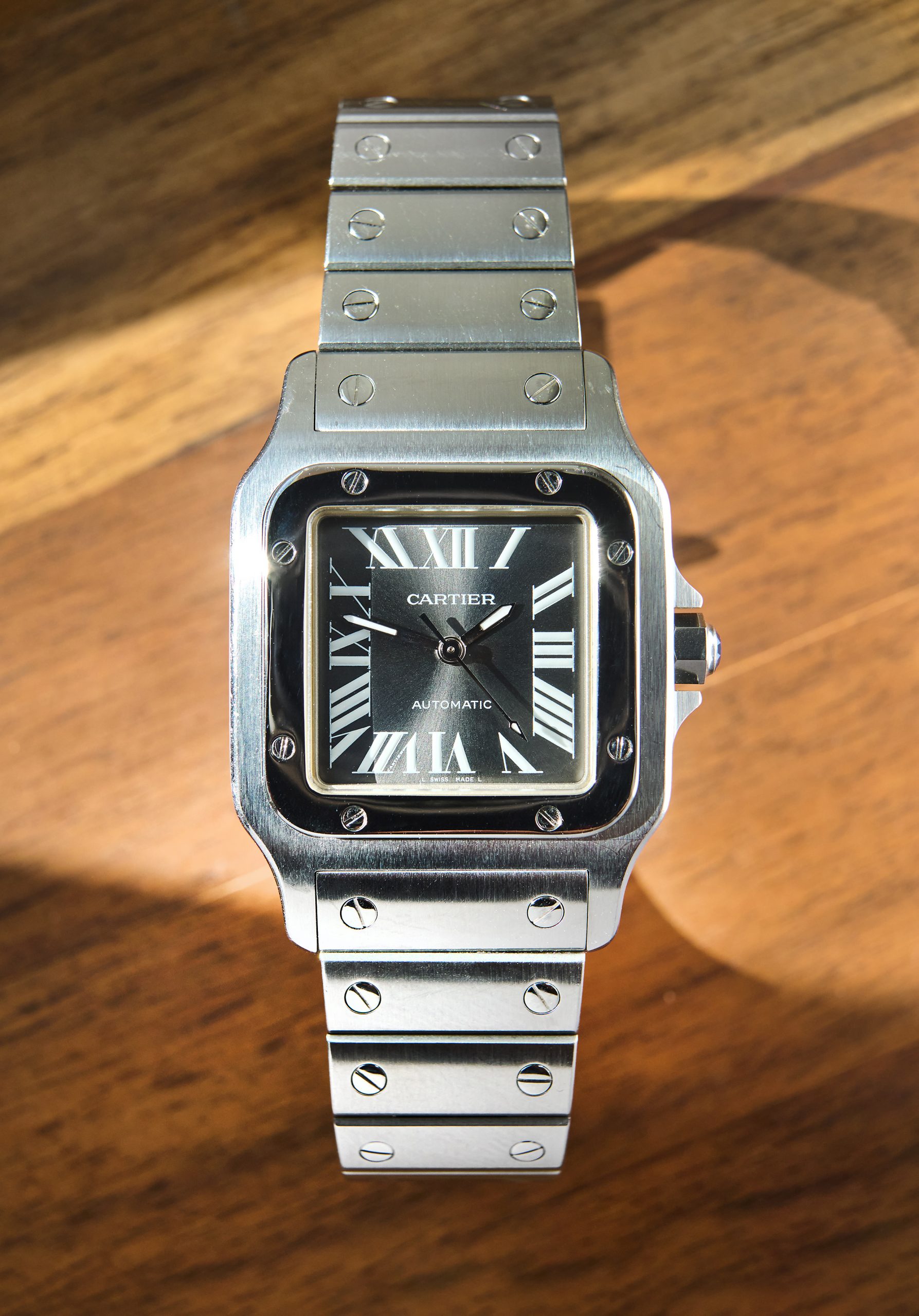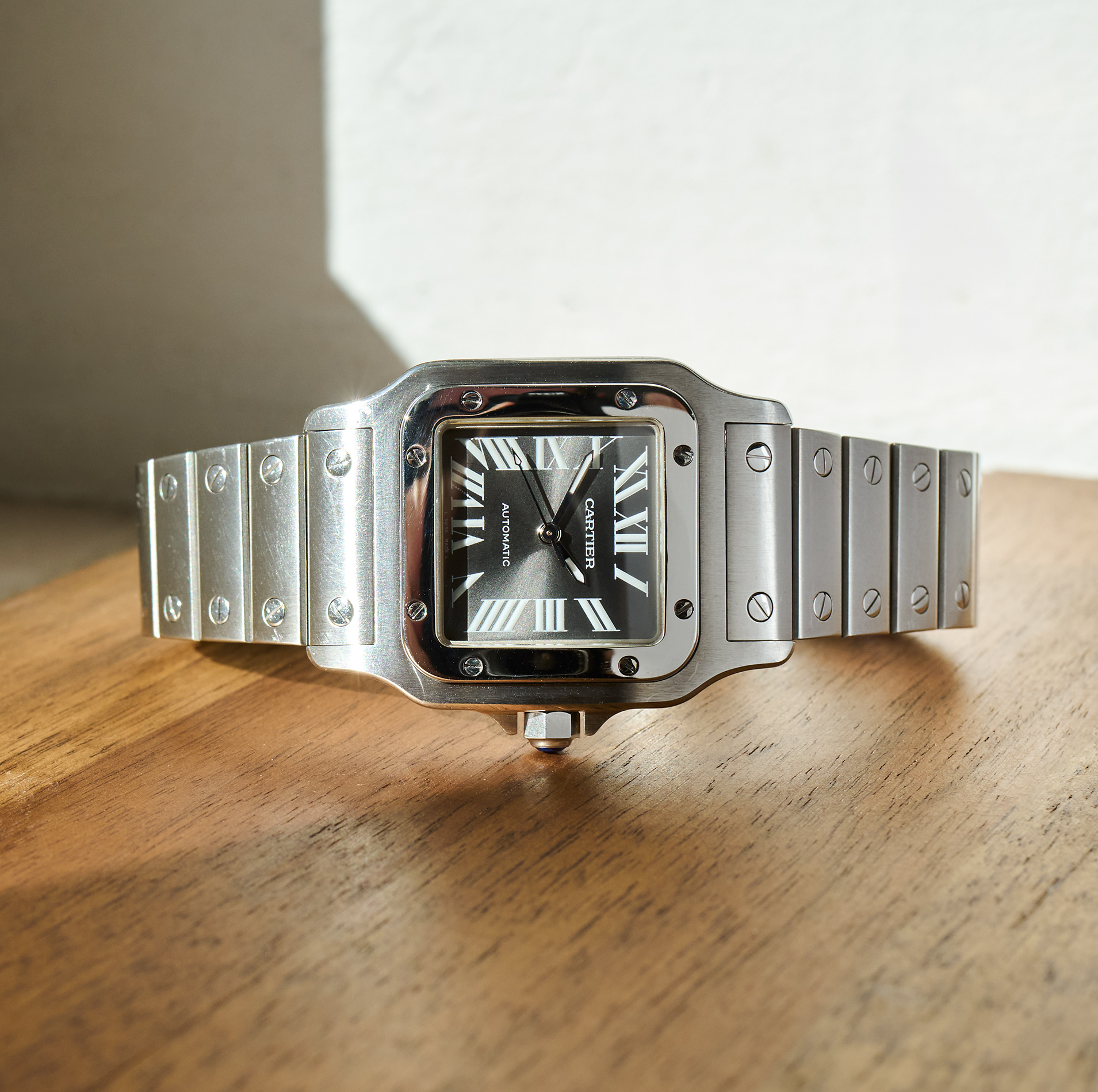 this is a rare Cartier Santos Galbée SIHH Limited Edition with darkgrey dial. The automatic reference 2319 SIHH with it´s 29 x 41mm steel case was produced in a limited run of only 2,000 pieces for the Salon International de la Haute Horlogerie (SIHH) in 2002. Our example is the most beautiful execution without the date window. It has never been polished before and shows only minor signs of wearing. The Cartier automatic caliber 381A has freshly been serviced and runs perfectly and even in chronometer norm. The watch will currently fit wrists up to 18.3 cm circumference and comes with a red Cartier pouche. This is one of those „one piece collection“ -watches. It is rare and coveted, elegant and sporty at the same time, making it suitable for any occasion. And with its automatic movement, it is even perfect for everyday use.