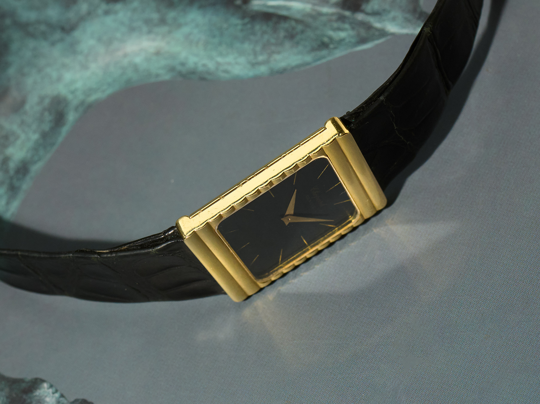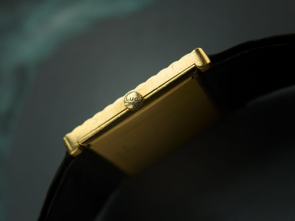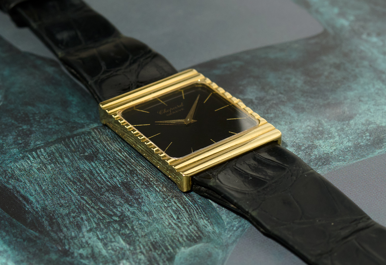 this is a very beautiful and rare Chopard Tank from the 1970s in 18k yellowgold. The unpolished 23 x 31mm case, featuring a ribbed design, shows both numbers and a hallmark engraved and stamped on the caseback and also several signs of wearing. The original crown is signed L.U.C. as well as the buckle. At Chopard, the initials L.U.C stand for the company founder Louis-Ulysse Chopard and denote the brand’s most exclusive watch line, representing the pinnacle of Swiss watchmaking, the ‘Haute Horlogerie’. The used croco-leatherband is also still the original one by Chopard and will fit wrists up to 18cm circumference. There is already a small tear at the bottom. Please be aware that for shippings to outside of the European Union this band needs to be exchanged to a generic one in cowleather regarding customs reasons. The glossy black dial with golden indicies and hands is in untouched and damagefree condition. It´s handwinding caliber is running very well and accurately, not being in the need for a service soon.