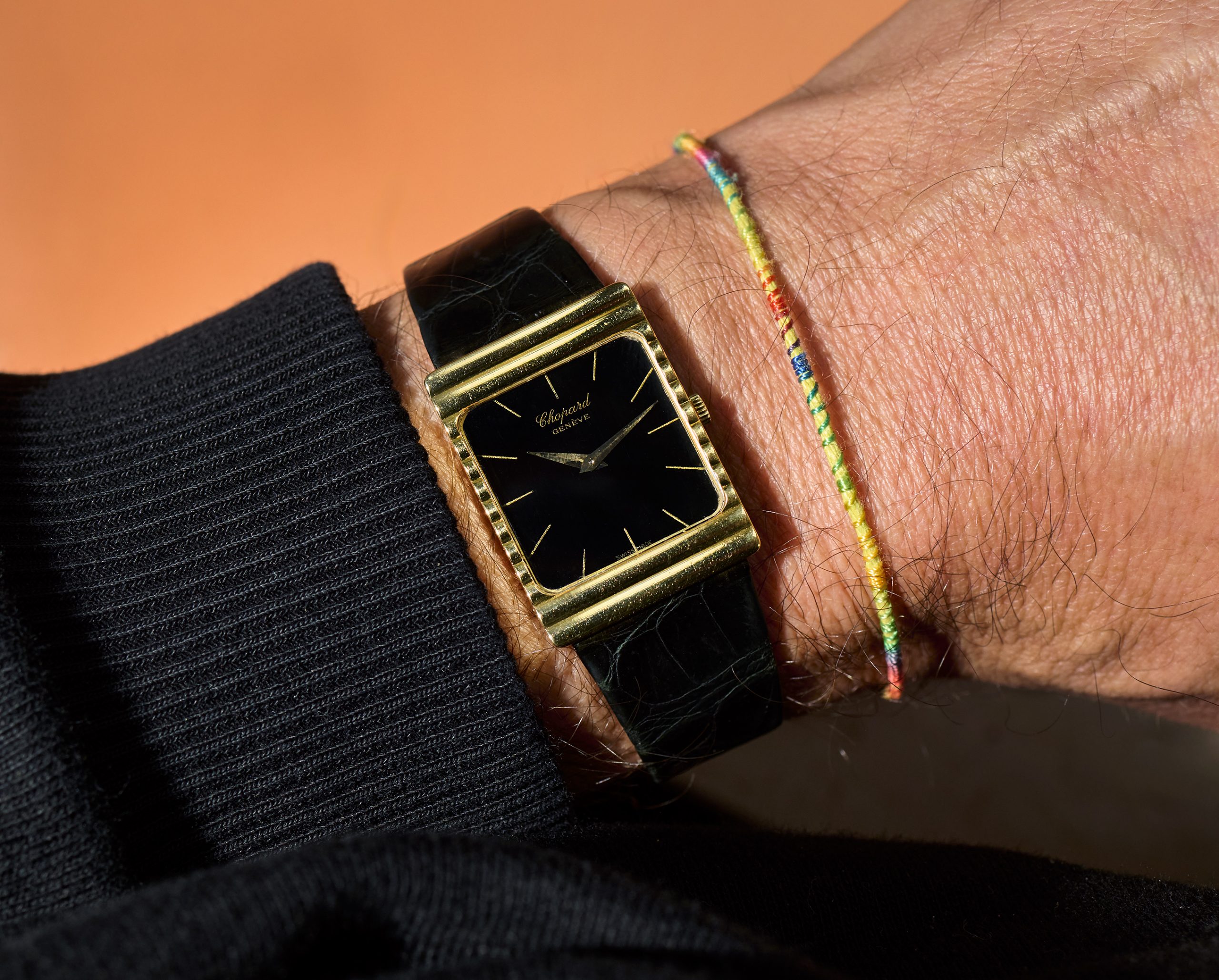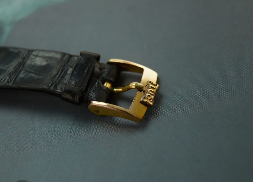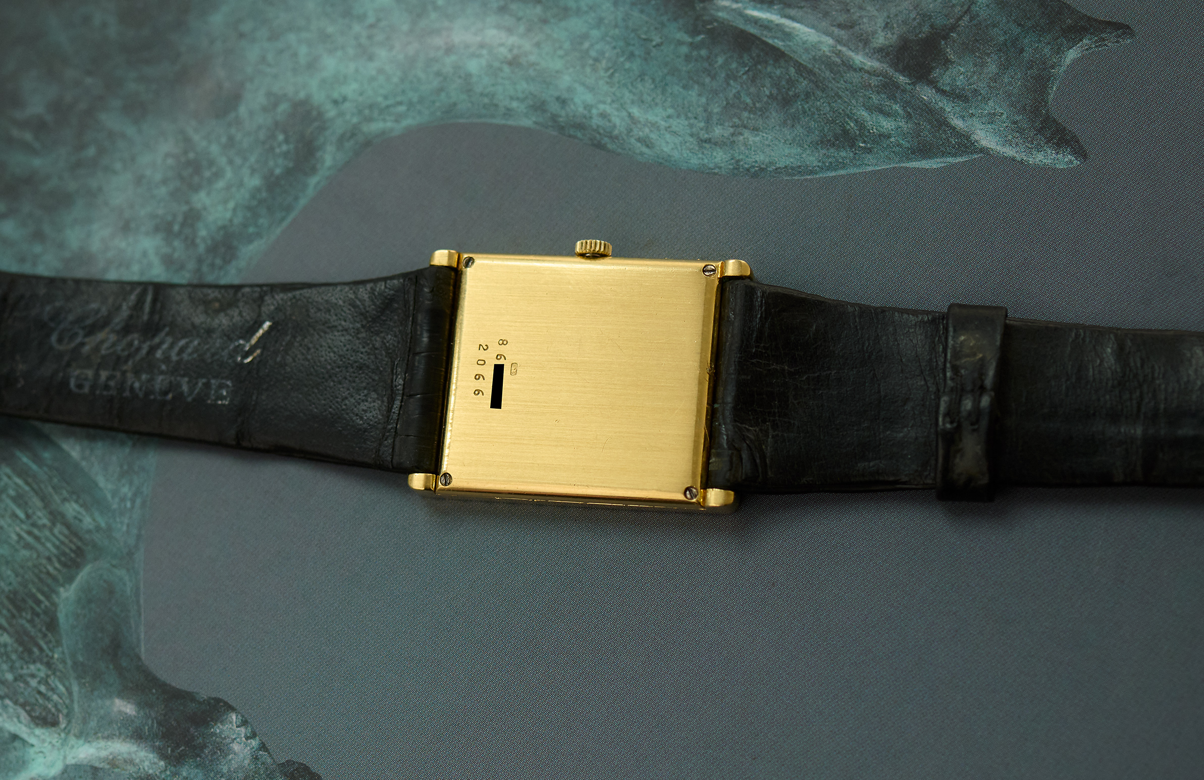 this is a very beautiful and rare Chopard Tank from the 1970s in 18k yellowgold. The unpolished 23 x 31mm case, featuring a ribbed design, shows both numbers and a hallmark engraved and stamped on the caseback and also several signs of wearing. The original crown is signed L.U.C. as well as the buckle. At Chopard, the initials L.U.C stand for the company founder Louis-Ulysse Chopard and denote the brand’s most exclusive watch line, representing the pinnacle of Swiss watchmaking, the ‘Haute Horlogerie’. The used croco-leatherband is also still the original one by Chopard and will fit wrists up to 18cm circumference. There is already a small tear at the bottom. Please be aware that for shippings to outside of the European Union this band needs to be exchanged to a generic one in cowleather regarding customs reasons. The glossy black dial with golden indicies and hands is in untouched and damagefree condition. It´s handwinding caliber is running very well and accurately, not being in the need for a service soon.