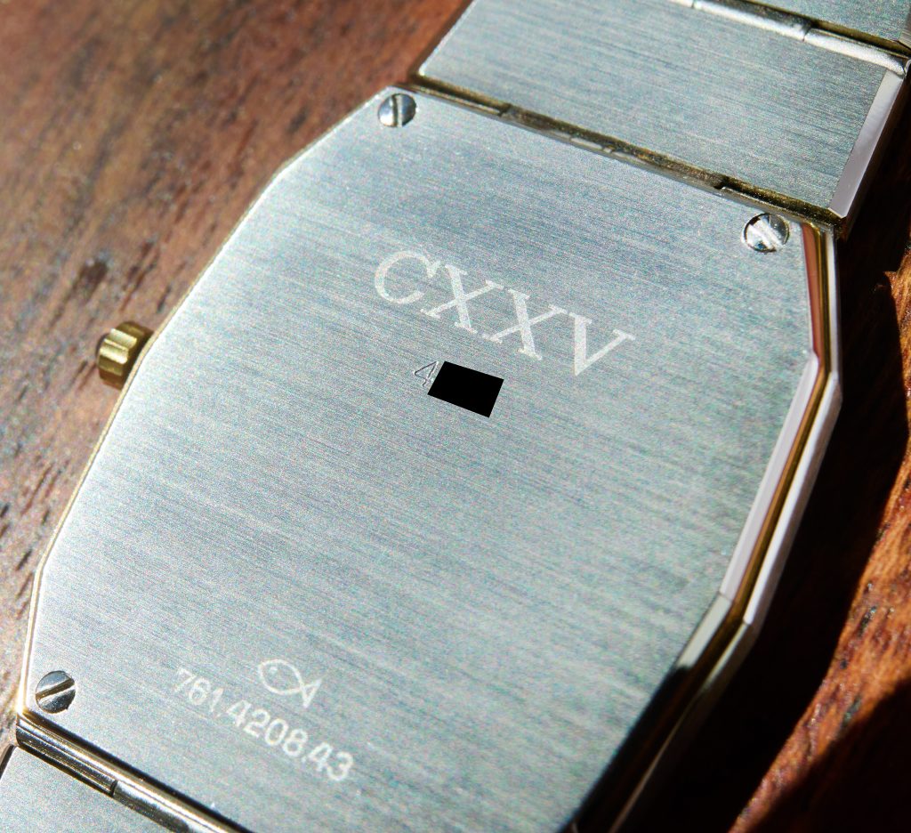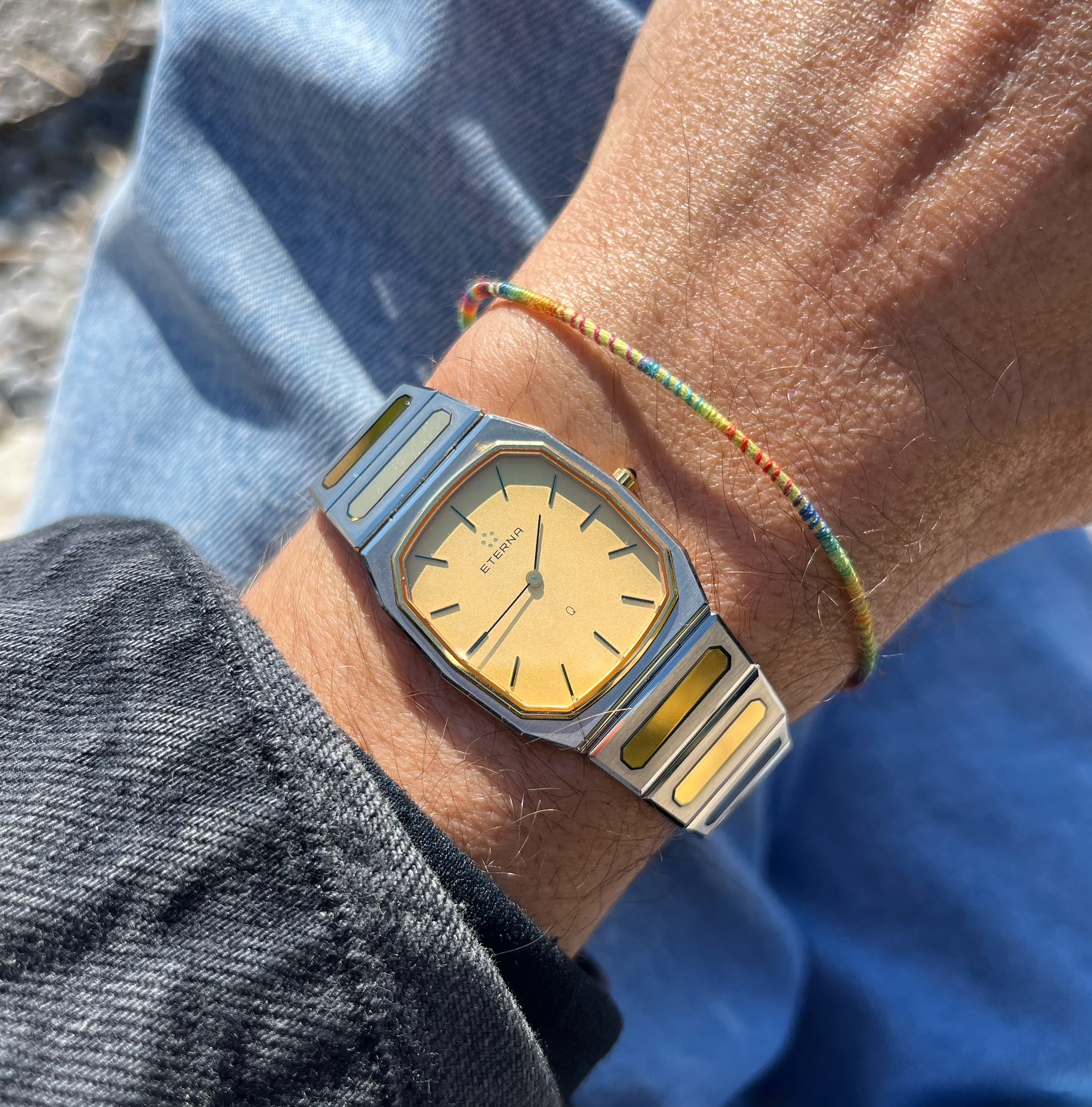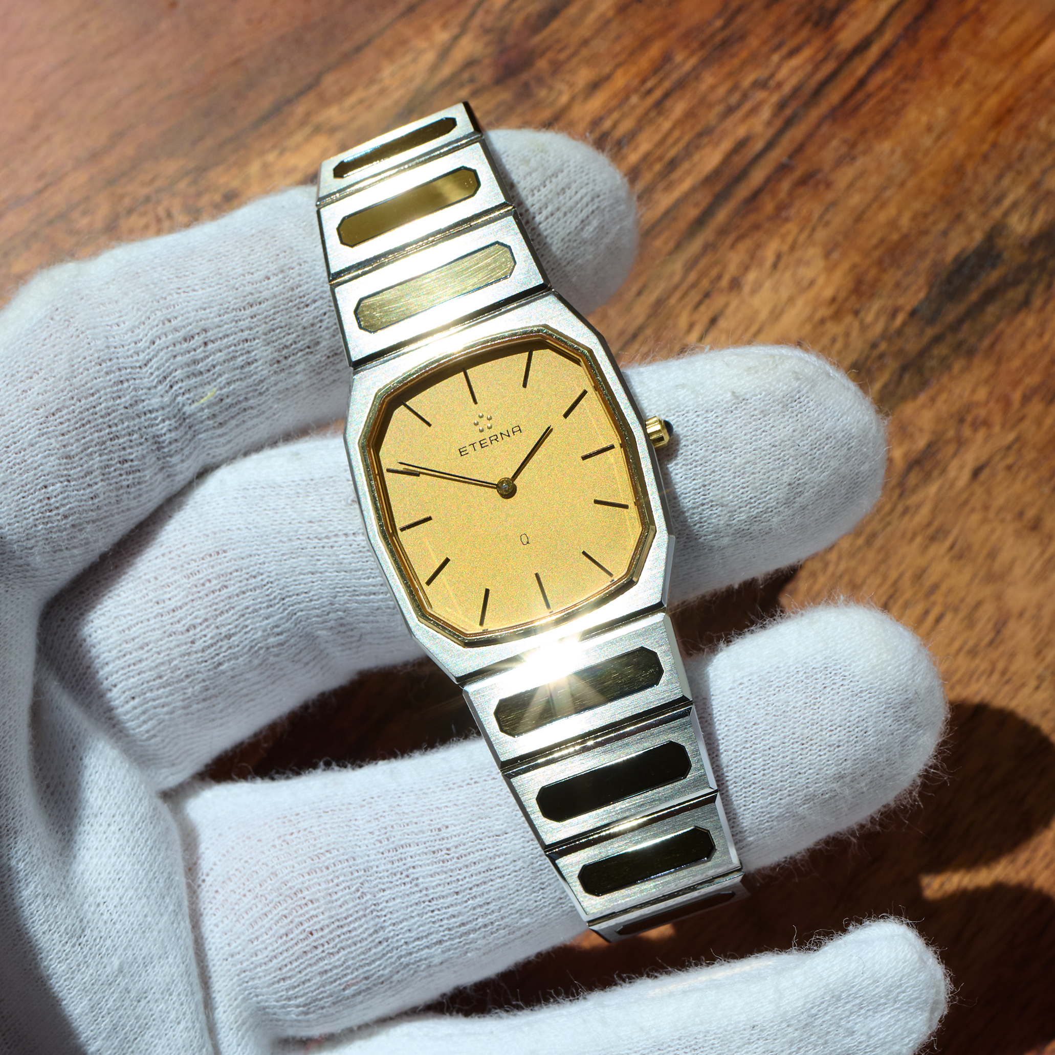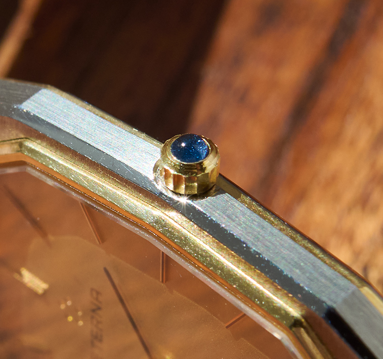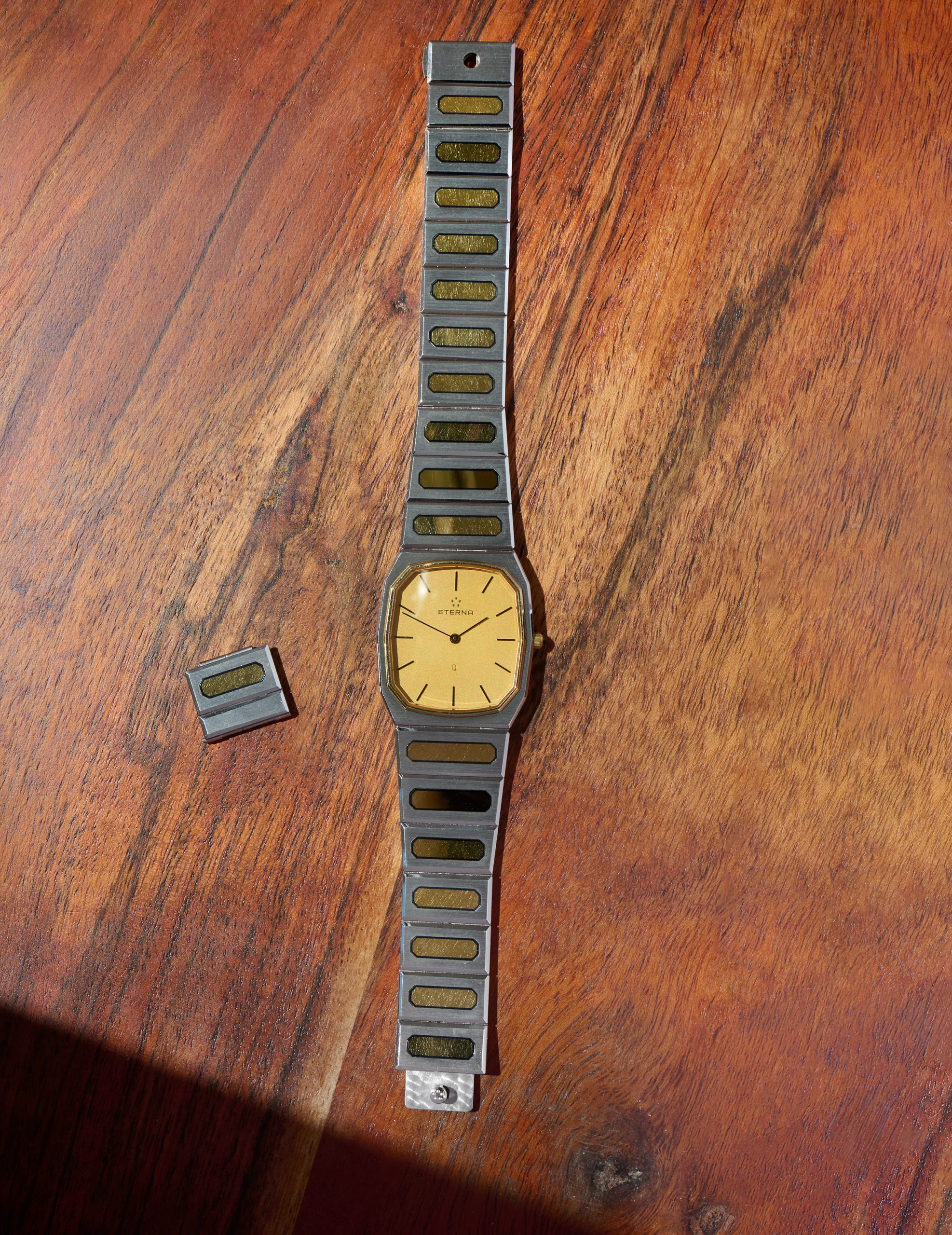 This is the Eterna CXXV, released in 1981 in a limited edition of just 1000 pieces, to mark Eterna’s 125th anniversary. The 28 x 31 mm men’s version, crafted from steel and gold, is in new-old-stock condition. Its quartz movement runs flawlessly. The Eterna features the rarely seen lemon-yellow dial. It currently fits wrists with a circumference of up to 19 cm or less. A beautiful and exclusive summer watch with an integrated bracelet.