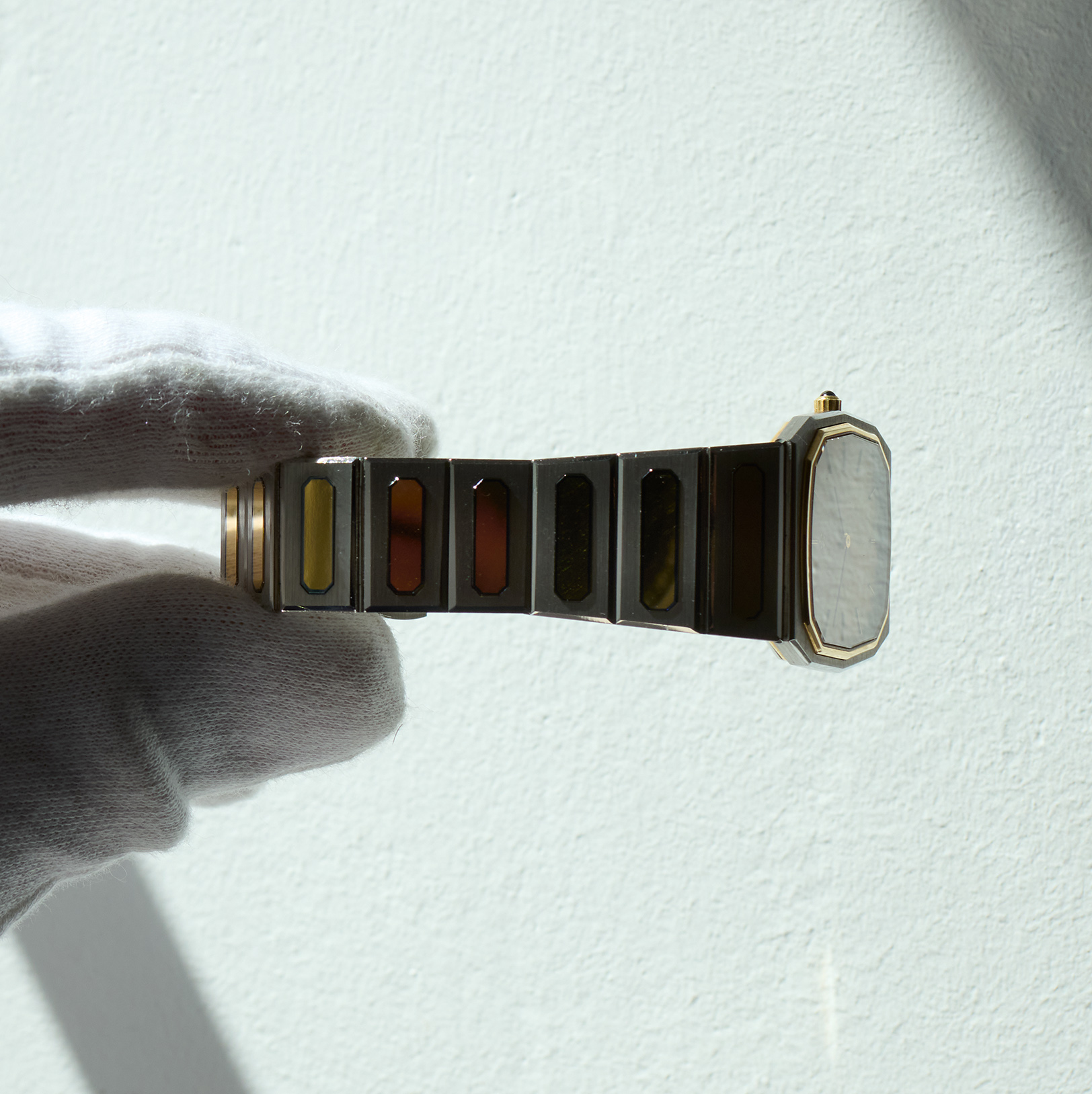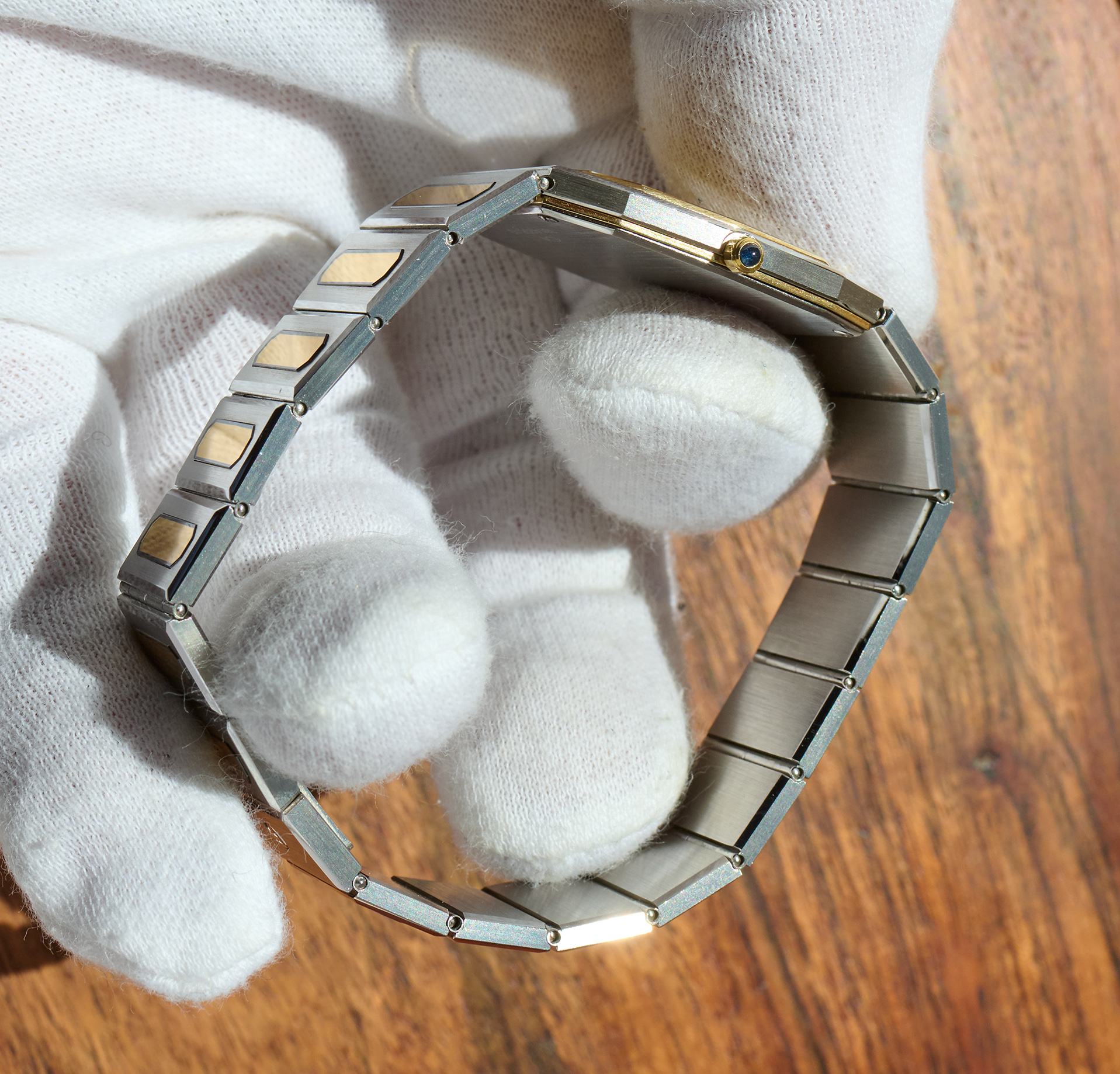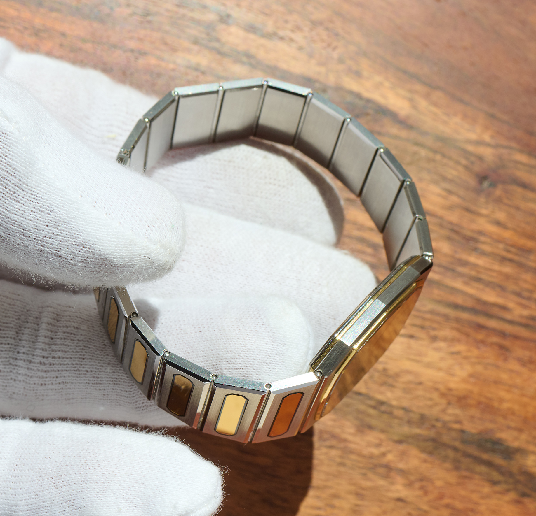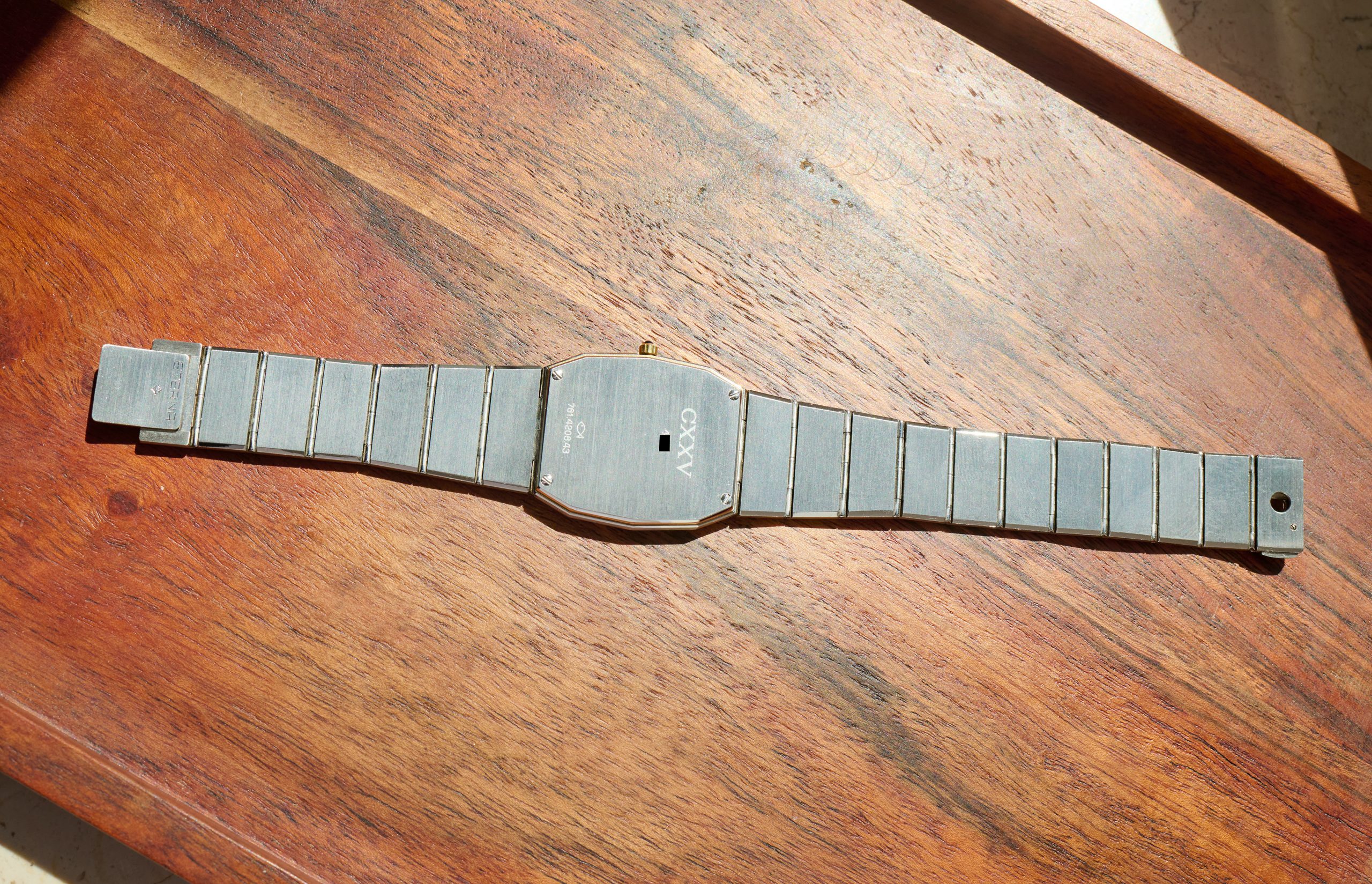 This is the Eterna CXXV, released in 1981 in a limited edition of just 1000 pieces, to mark Eterna’s 125th anniversary. The 28 x 31 mm men’s version, crafted from steel and gold, is in new-old-stock condition. Its quartz movement runs flawlessly. The Eterna features the rarely seen lemon-yellow dial. It currently fits wrists with a circumference of up to 19 cm or less. A beautiful and exclusive summer watch with an integrated bracelet.