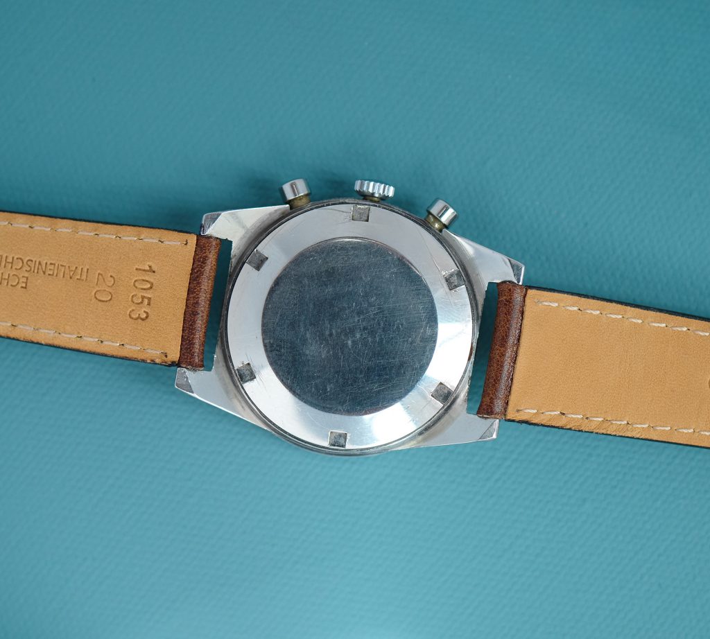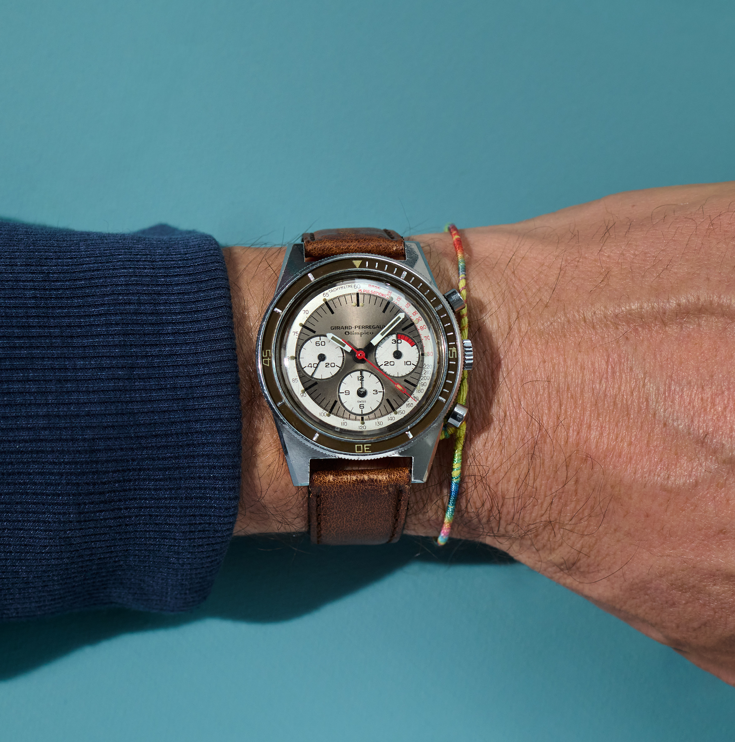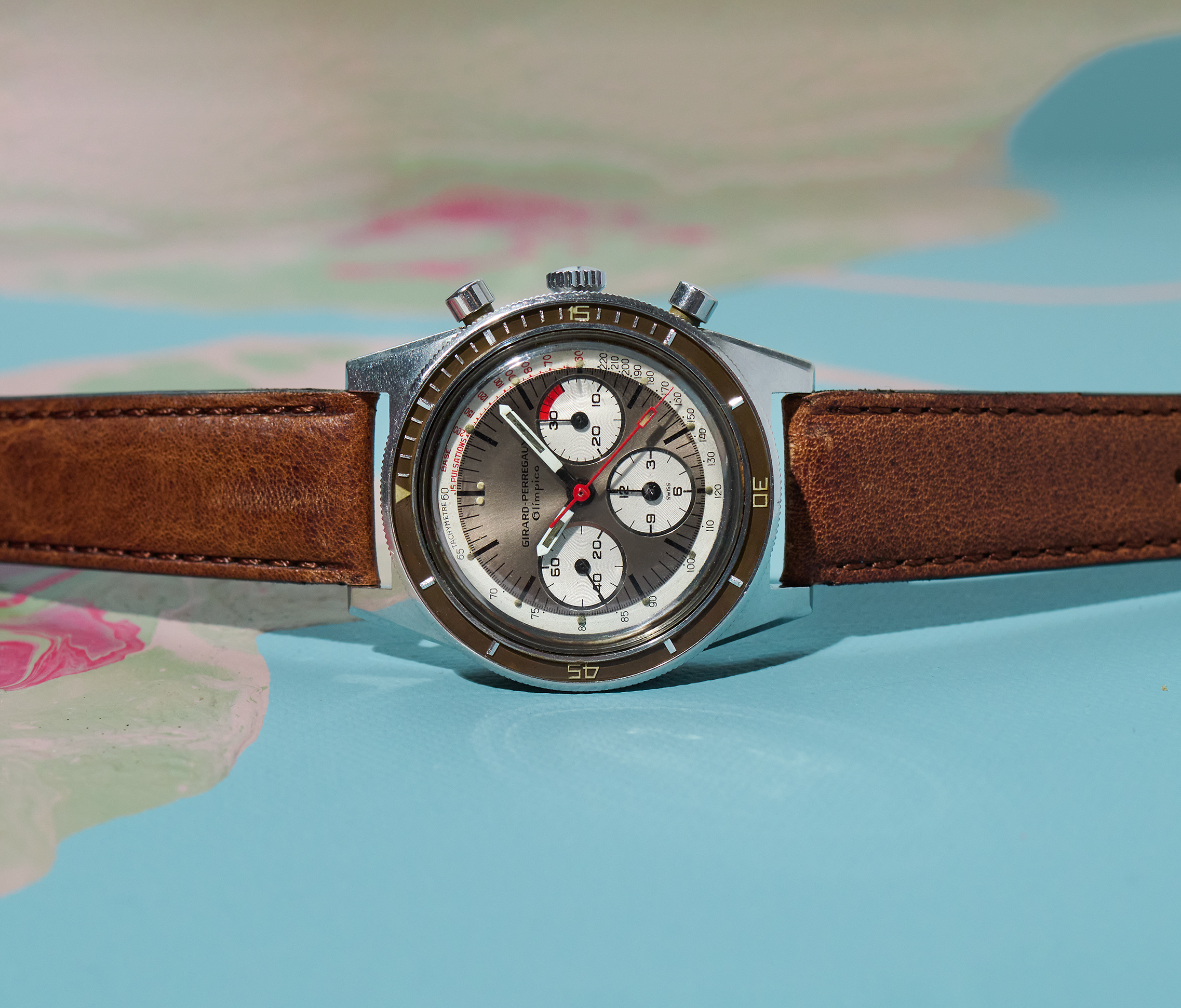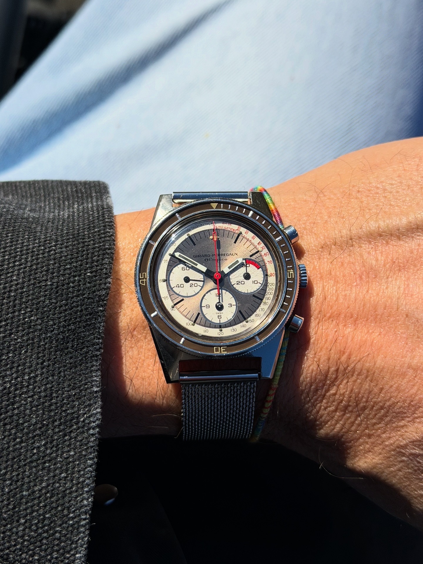 this is a very rare 9075 af olimpico by girard perregaux from the late 1960s. the brand used to release chronographs for all the olympic games in the past, and this reference has reached wider fame amongst collectors regarding it´s outstanding detailed 1960s design. Stylewise it can be seen in a line with Zenith A386 or the mid 1960s Universal Geneve Compax line, like the Nina Rindt execution and even more the rarer exotic dial versions. It is in any case one of the most iconic designed sport chronographs of the golden era. The 39mm steelcase has never been polished and shows all numbers between the lugs and engraved in the caseback. the gorgeous, girard perregaux refined and engraved, excelsior park caliber 40 was checked through, works perfectly in all functions and will not be in the need for a service soon. the fume-color-dial, the handset and of course the beautiful crackfree bakelit bezel are unmolested and appear with the original tritium in and on it. the GP olimpico will be delivered with two new leatherstraps in different brown tones which match the watch both perfectly, each in it´s own wonderful way.