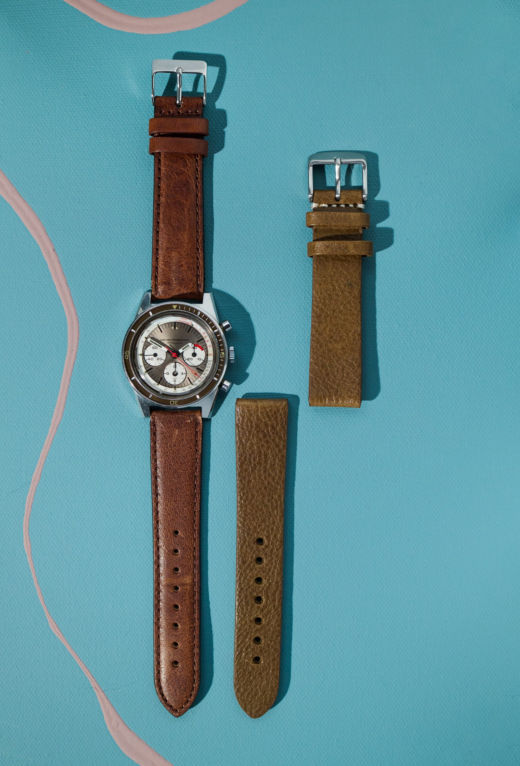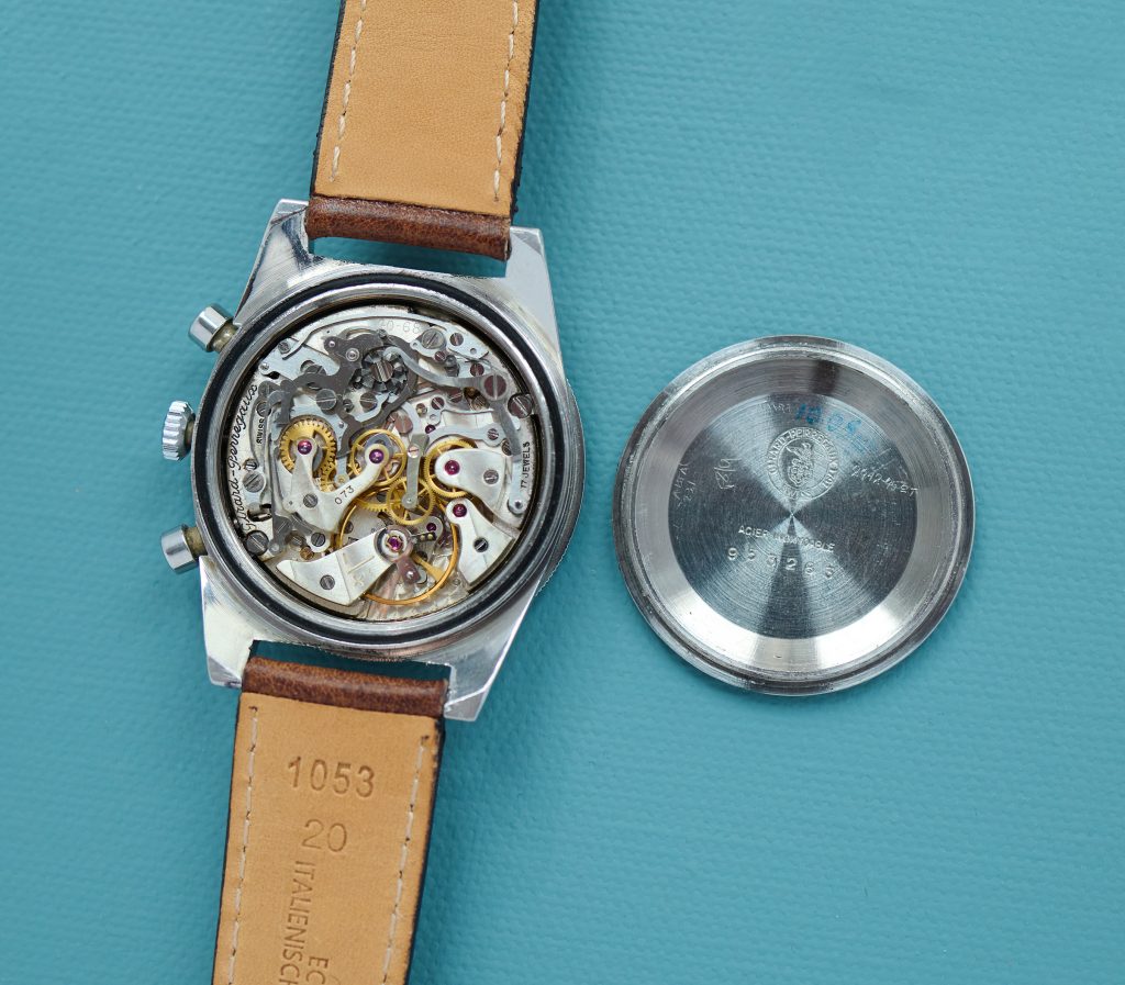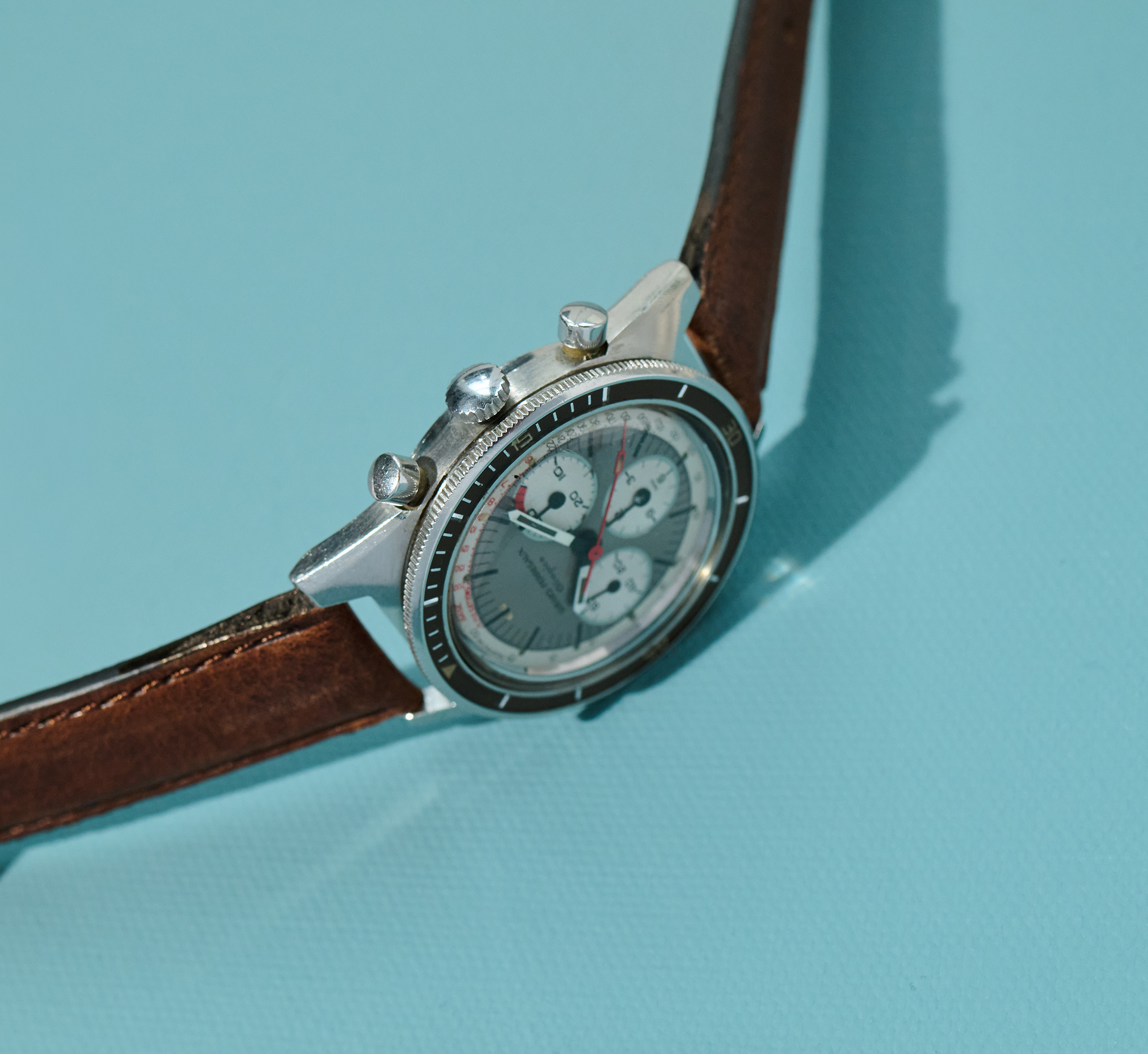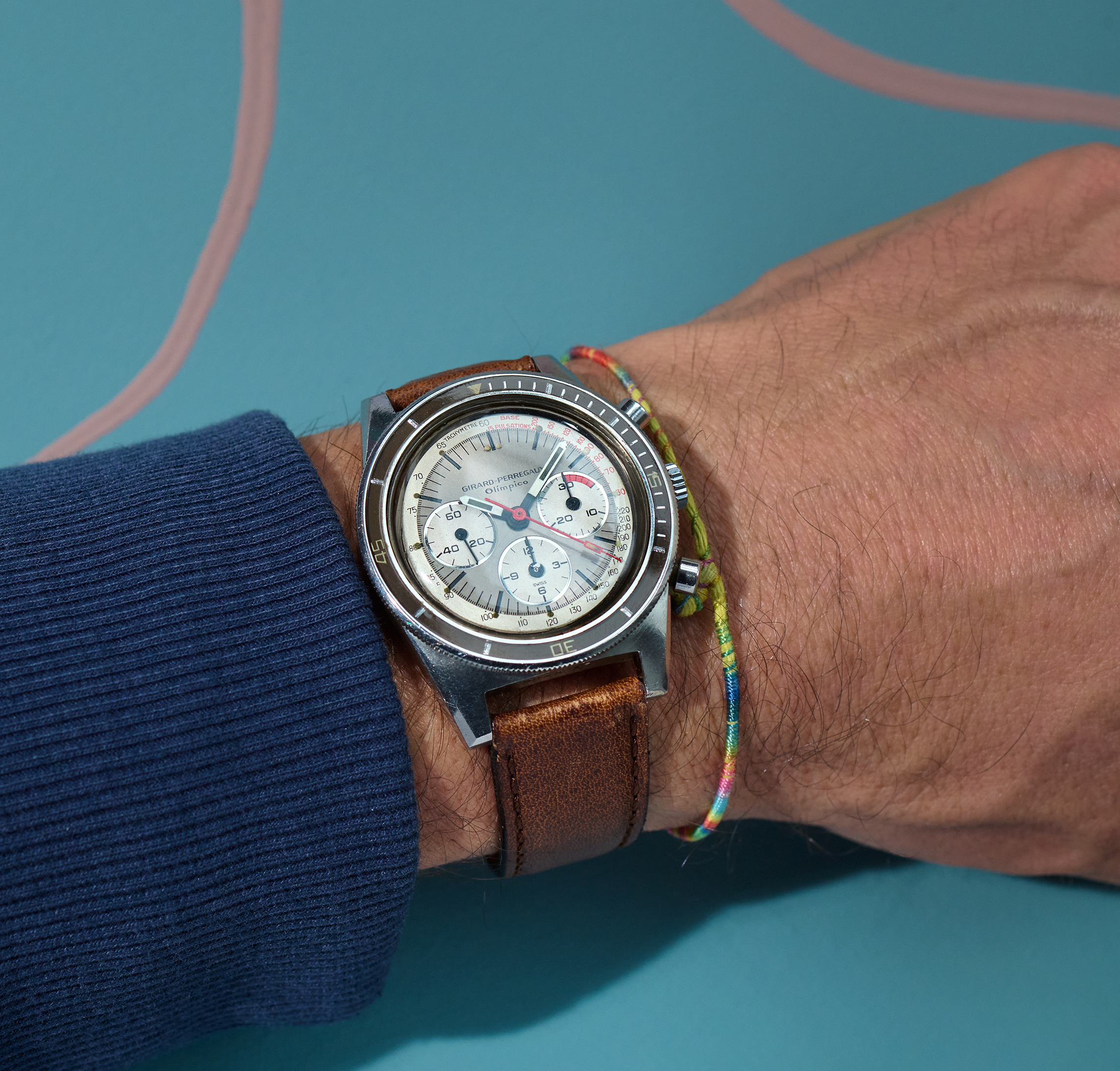 this is a very rare 9075 af olimpico by girard perregaux from the late 1960s. the brand used to release chronographs for all the olympic games in the past, and this reference has reached wider fame amongst collectors regarding it´s outstanding detailed 1960s design. Stylewise it can be seen in a line with Zenith A386 or the mid 1960s Universal Geneve Compax line, like the Nina Rindt execution and even more the rarer exotic dial versions. It is in any case one of the most iconic designed sport chronographs of the golden era. The 39mm steelcase has never been polished and shows all numbers between the lugs and engraved in the caseback. the gorgeous, girard perregaux refined and engraved, excelsior park caliber 40 was checked through, works perfectly in all functions and will not be in the need for a service soon. the fume-color-dial, the handset and of course the beautiful crackfree bakelit bezel are unmolested and appear with the original tritium in and on it. the GP olimpico will be delivered with two new leatherstraps in different brown tones which match the watch both perfectly, each in it´s own wonderful way.