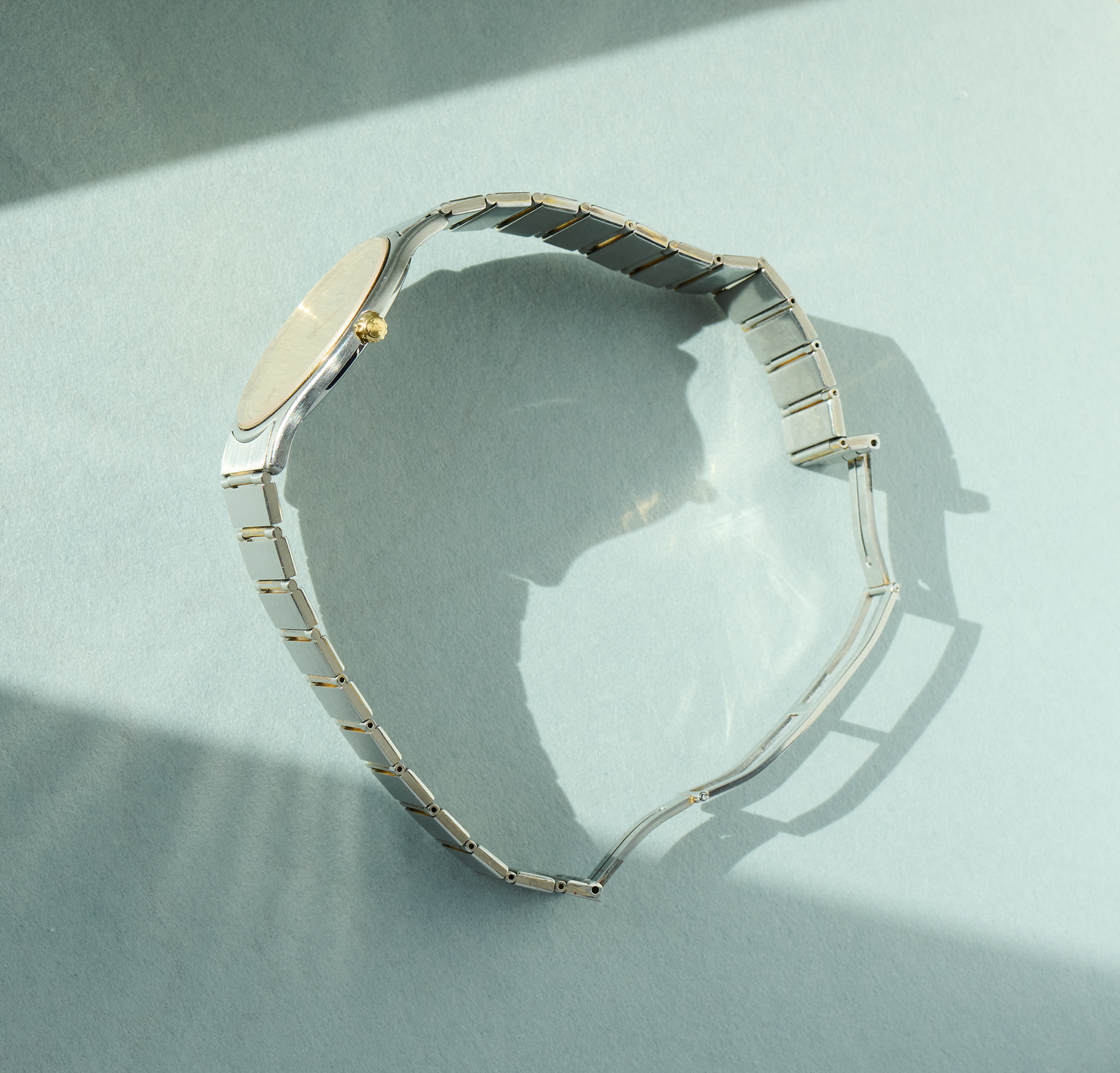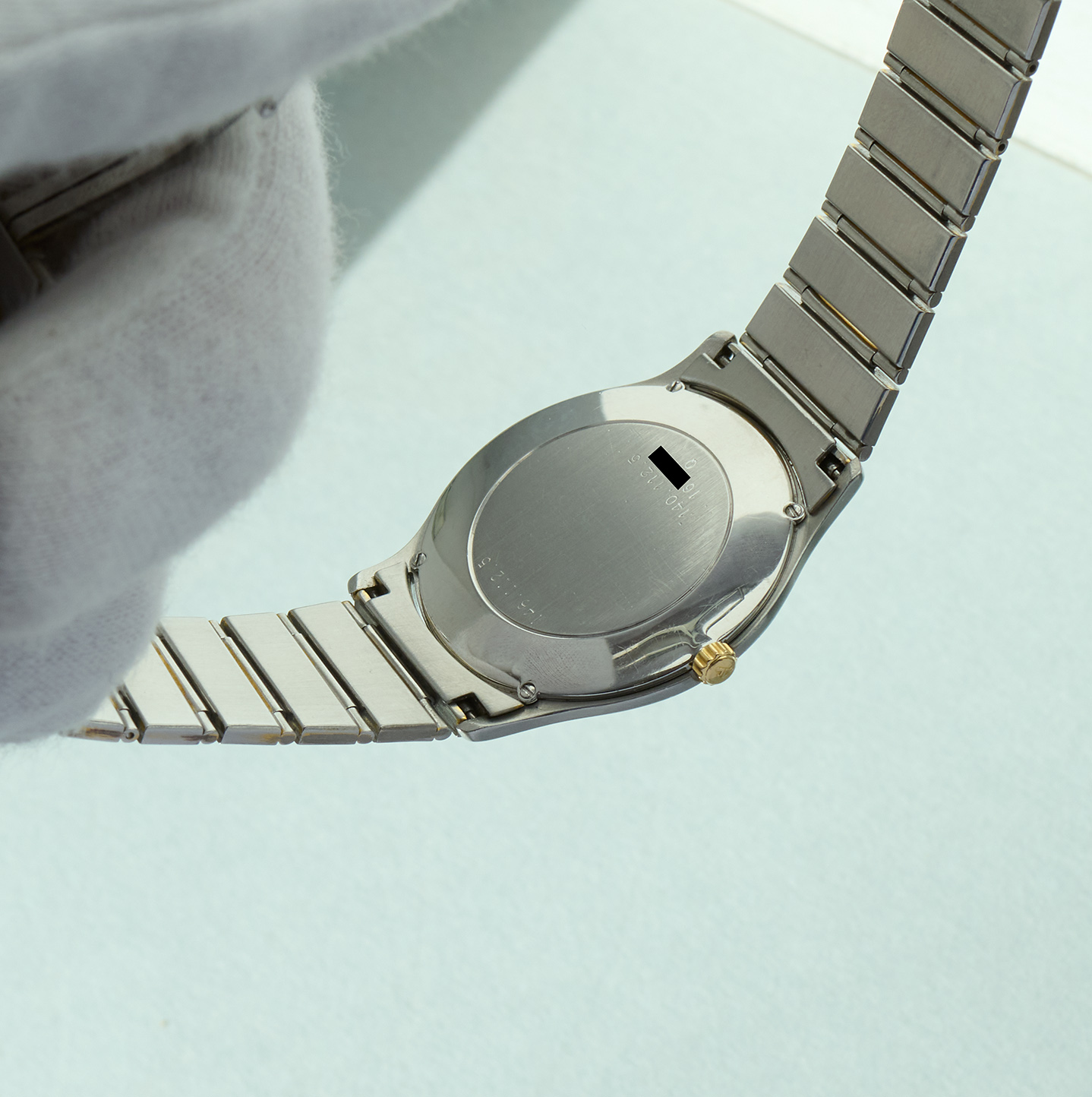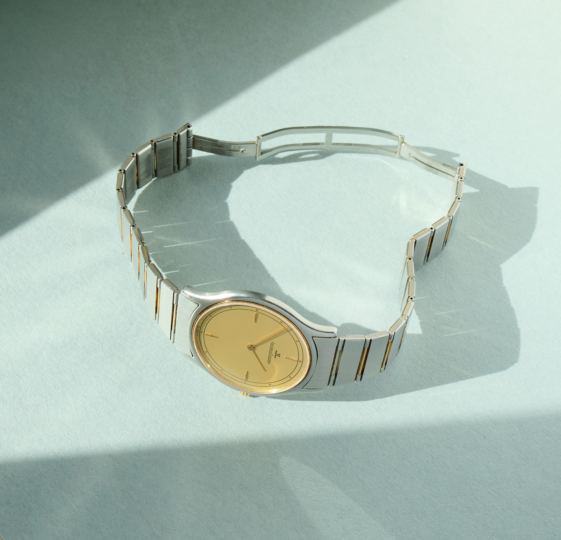 this is a superstylish Jaeger Lecoultre dresswatch from around 1989 in steel and 18k gold. The extraslim 33mm case with goldbezel is powered by the JLC quartz caliber 609 and has just received a new battery from us. The reference 145.112.5 can only be found very rarely with it´s original steelbracelet. It will currently fit wrists up to 18,2cm circumference. Links can be taken out easily. With its beautiful lemon yellow dial, it is the perfect watch for the first days of spring, which are just around the corner.