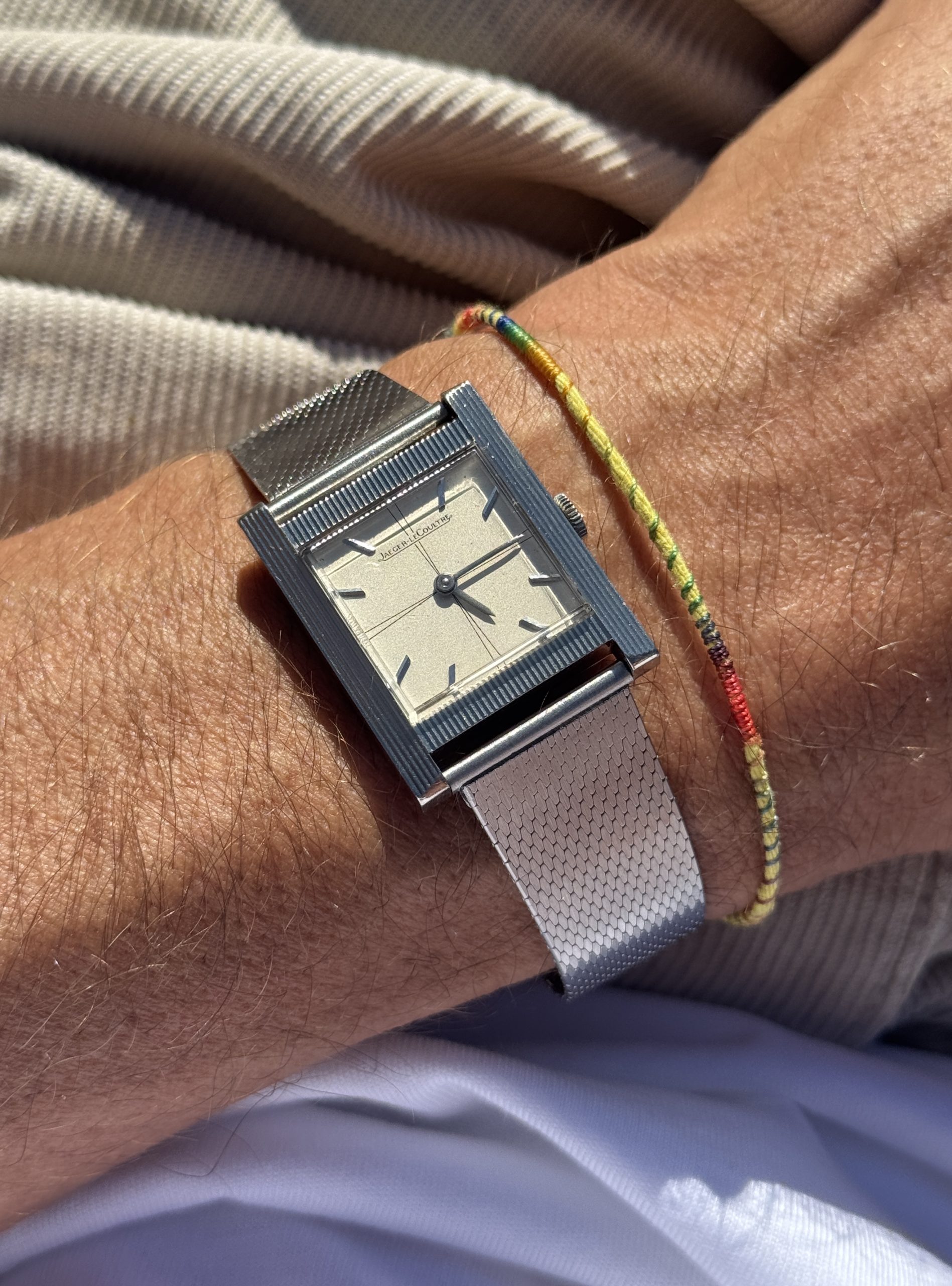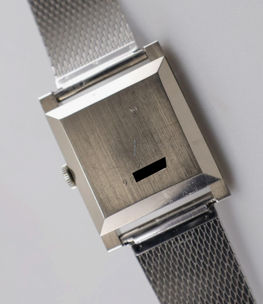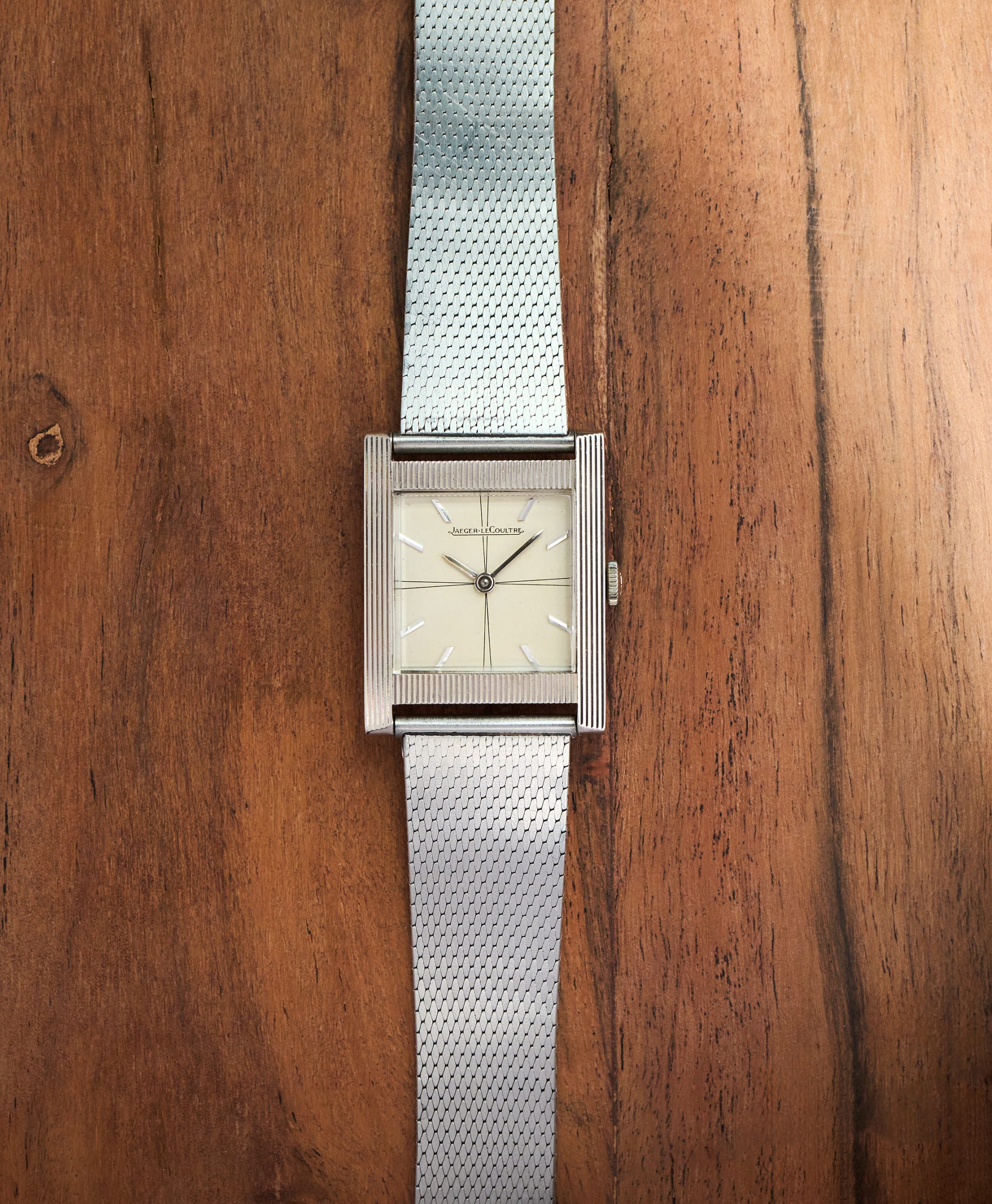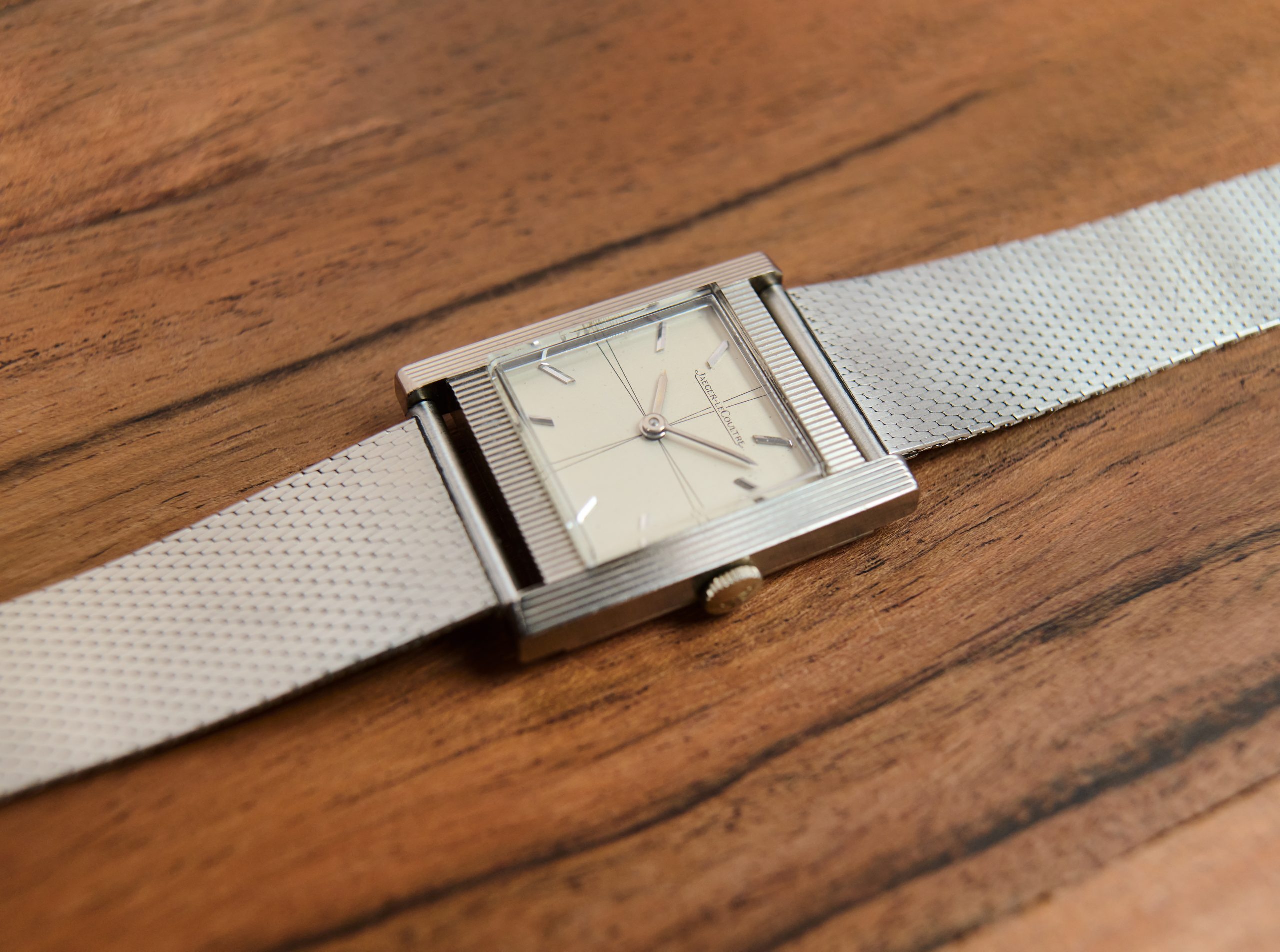 this is an extremely rare Jaeger LeCoultre Tank in 18k whitegold with an overwhelmingly beautiful eggshell colored dial with propeller sector layout. The watch from ca 1963 comes on a vintage milanese bracelet in steel which matches the color of the whitegold perfectly. The 25,5 x 32 mm case has never been polished before and features a beautiful line pattern. The elevated plexi as well as the JLC signed crown are the original ones. The handwound JLC caliber P480/C was serviced this year and runs perfectly and even in chronometer norm.