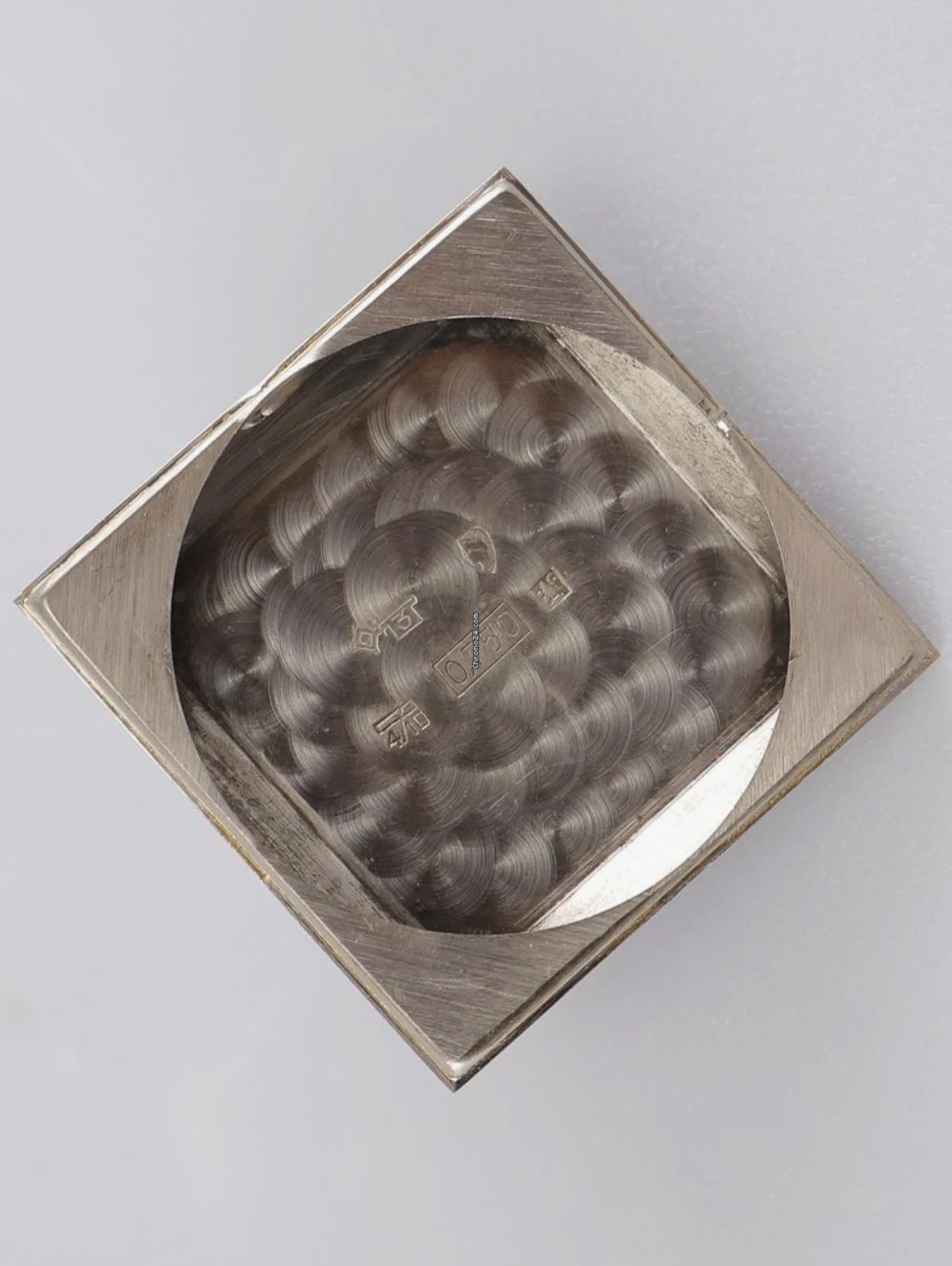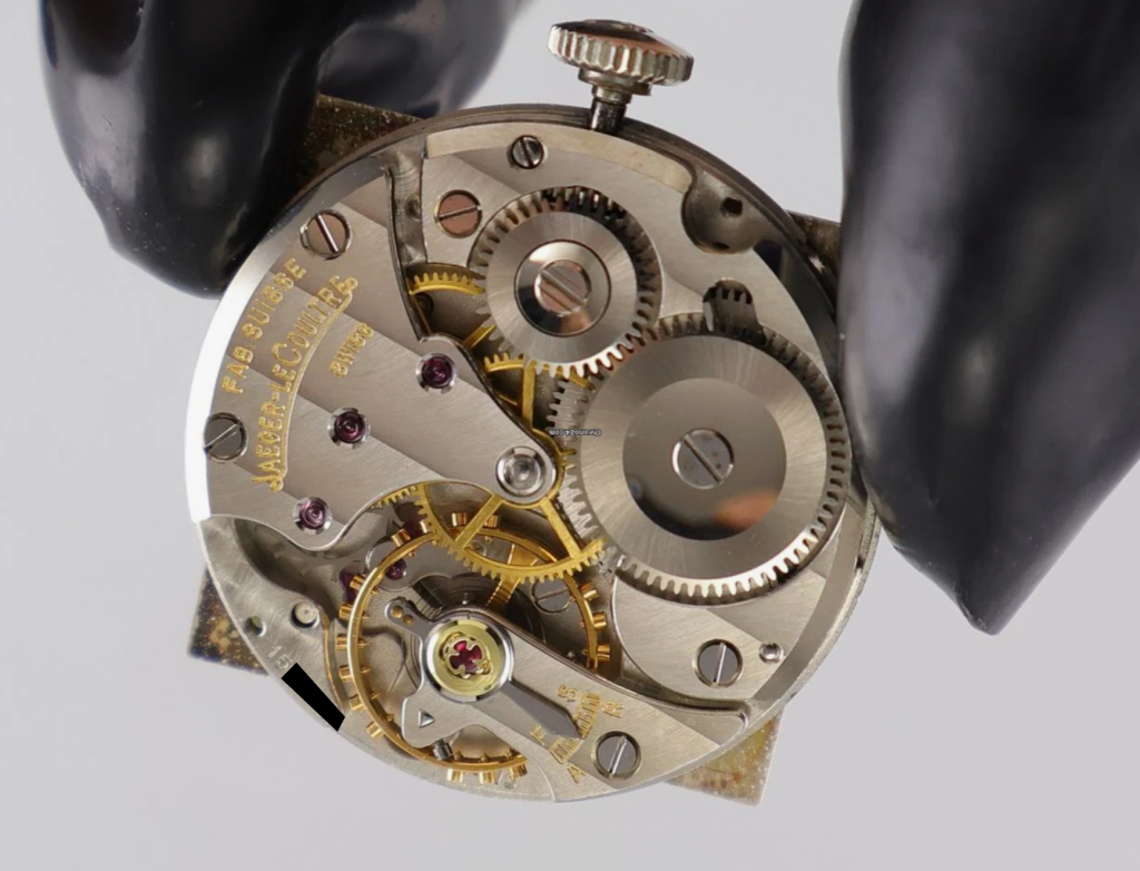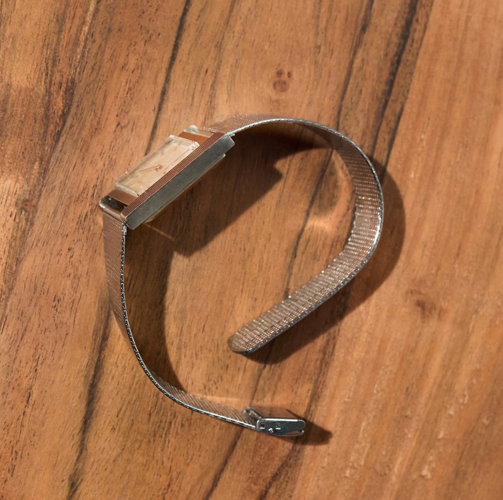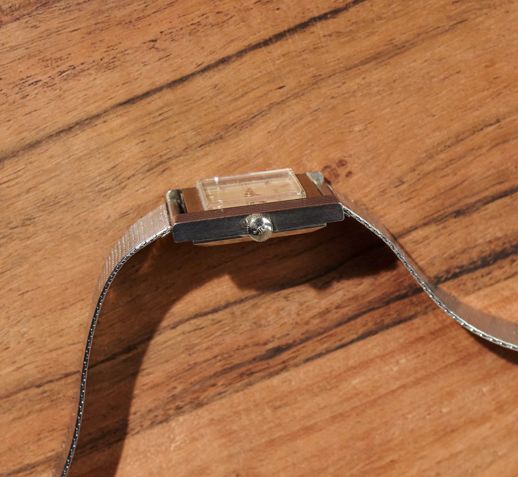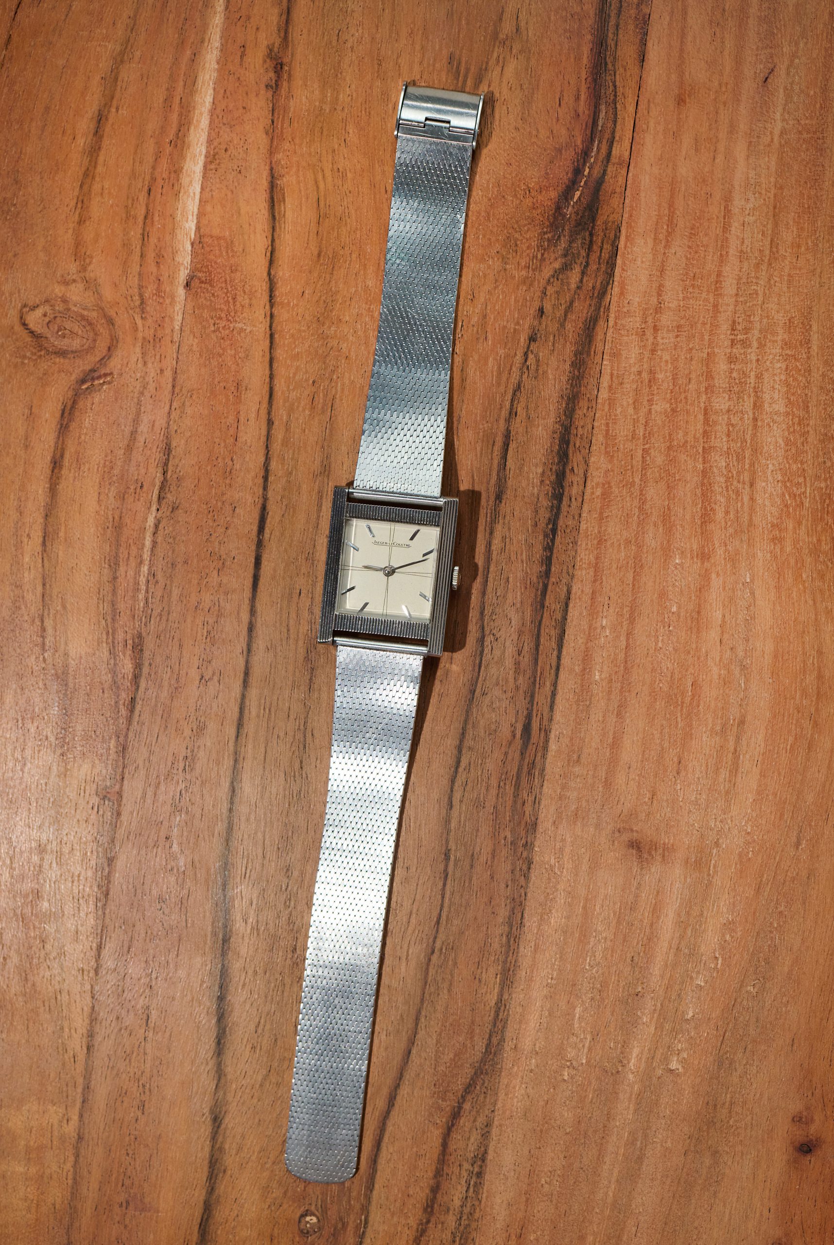 this is an extremely rare Jaeger LeCoultre Tank in 18k whitegold with an overwhelmingly beautiful eggshell colored dial with propeller sector layout. The watch from ca 1963 comes on a vintage milanese bracelet in steel which matches the color of the whitegold perfectly. The 25,5 x 32 mm case has never been polished before and features a beautiful line pattern. The elevated plexi as well as the JLC signed crown are the original ones. The handwound JLC caliber P480/C was serviced this year and runs perfectly and even in chronometer norm.