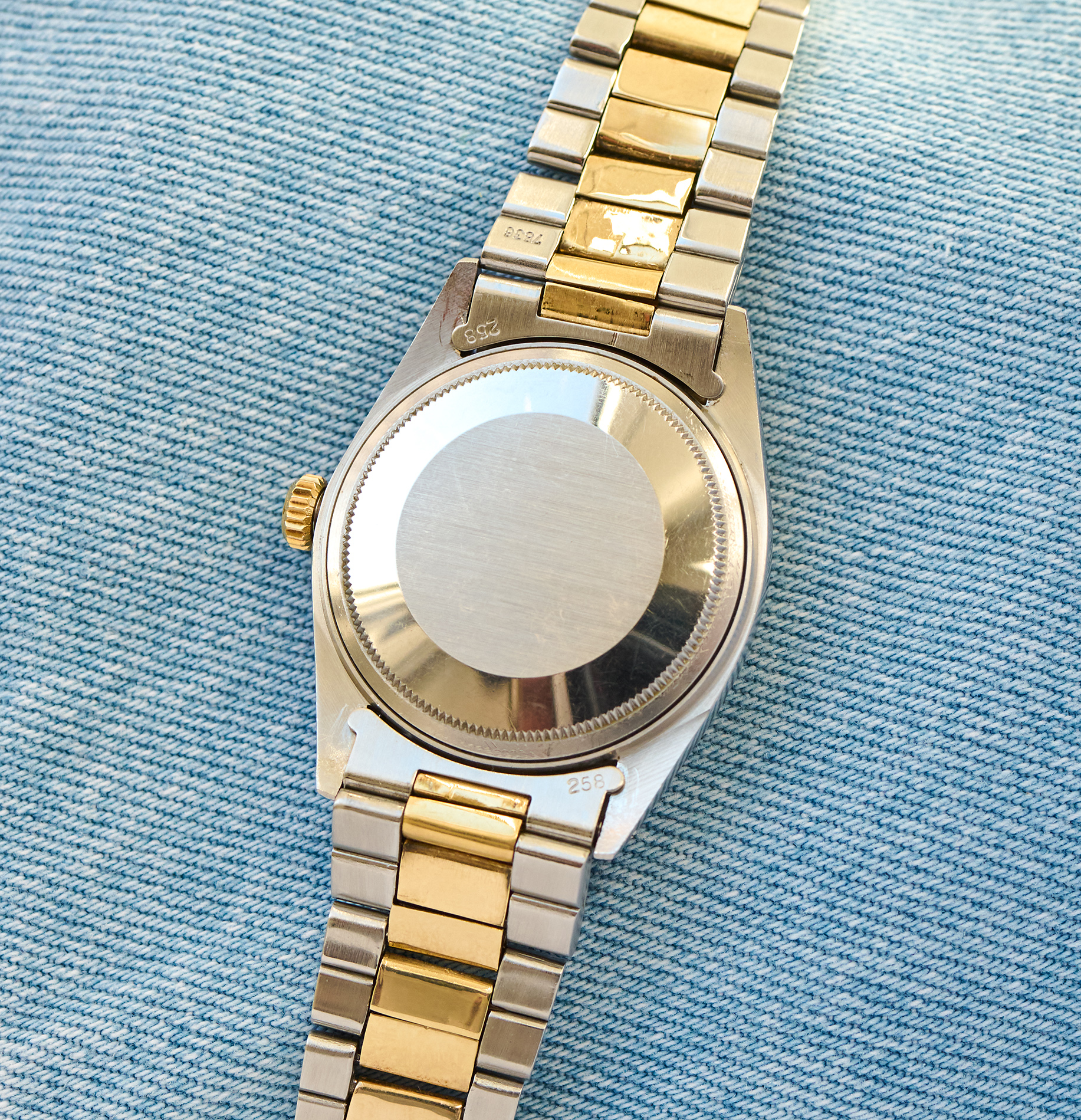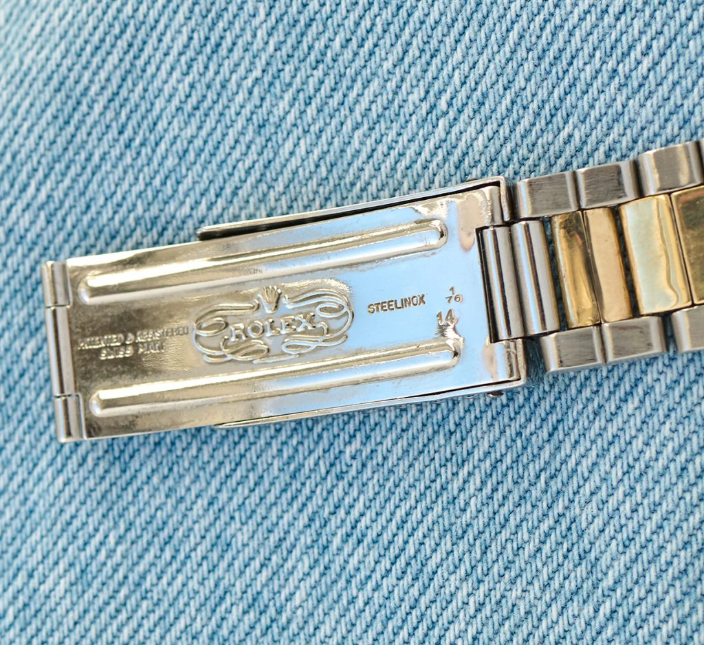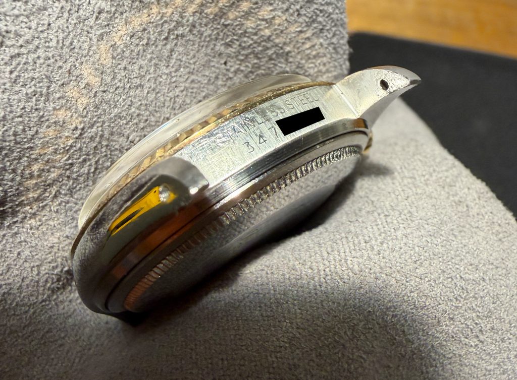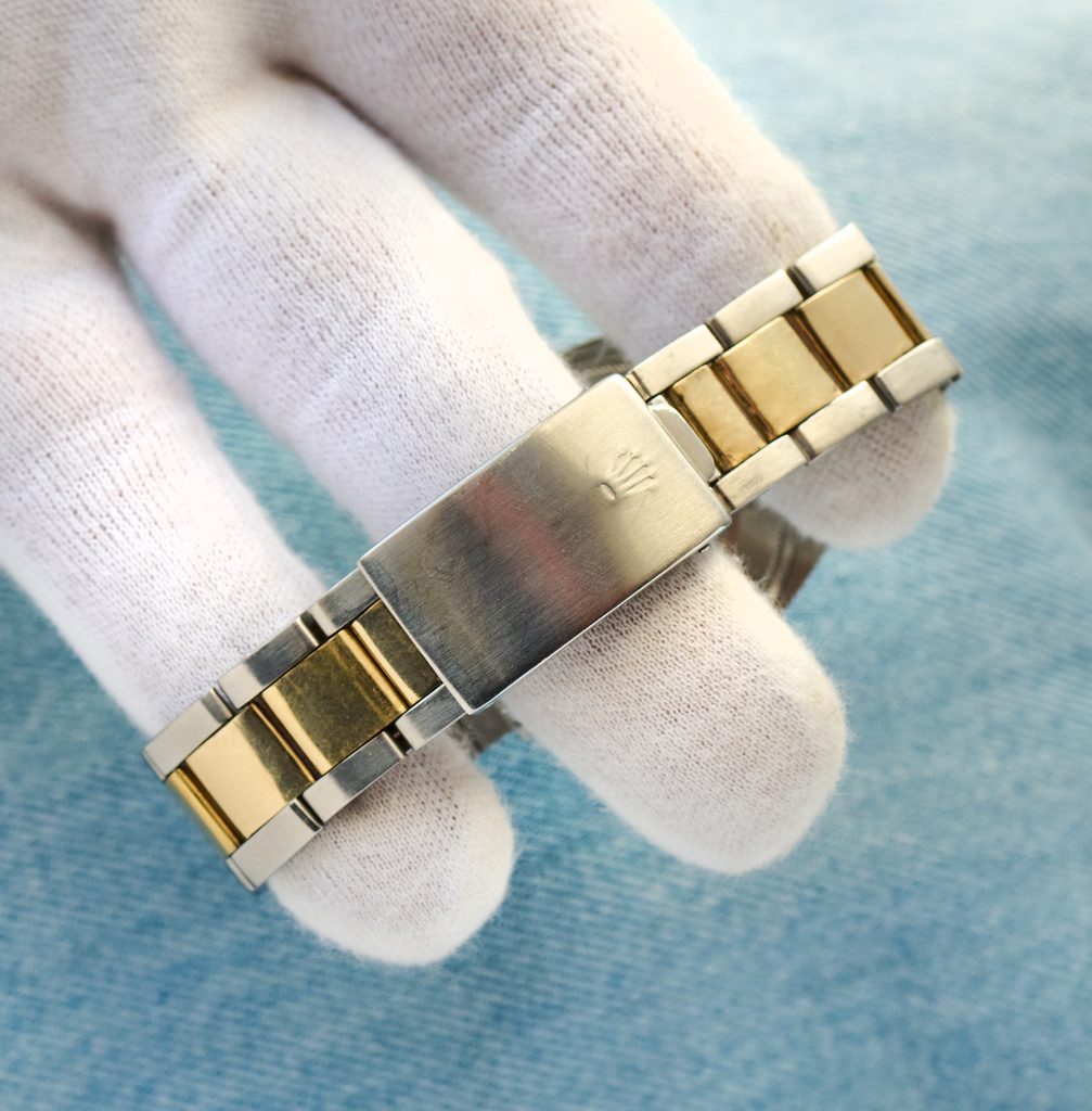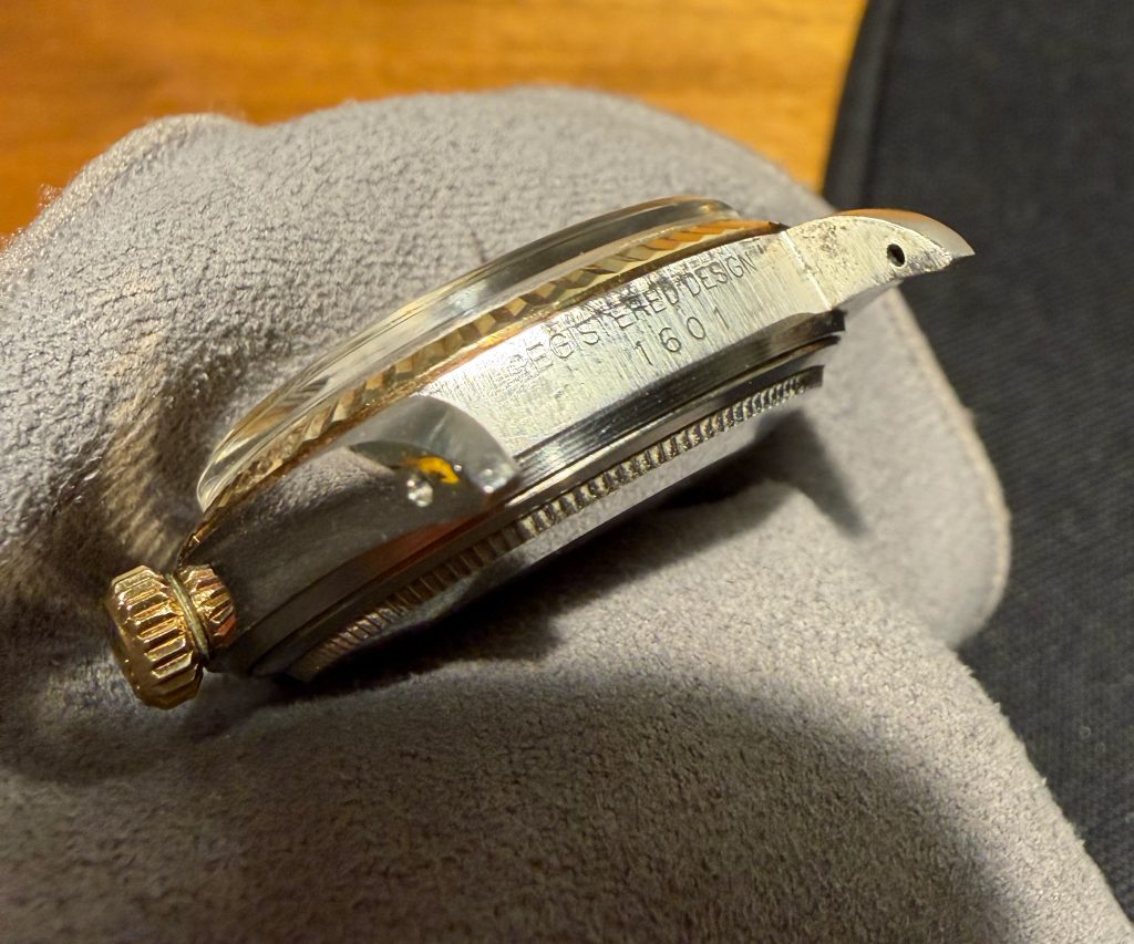 this is a beautiful Rolex 1601 datejust from 1973 in steel and gold, featuring a stunning gold linen dial. The 36mm steelcase with gold bezel seems to have never been polished yet and clearly shows both numbers between the lugs (serial 347xxxx). The rolex automatic caliber 1570 was checked through and is running strongly and exactly, not being in the need for a service soon. The flawless Sigma „pie-pan-linen-dial“ still carries all it´s original tritium, just as the handset does. The Rolex comes on it´s original folded 7836 steel-gold bracelet and with 258 steel endlinks. It will currently fit wrists up to a circumference of 18cm and smaller.