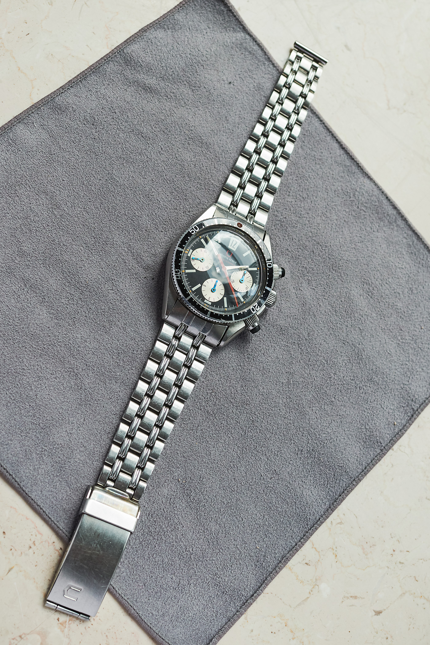 This is a rare Universal Geneve spacecompax Mk1 from 1968. The piece is in allover original and very well preserved condition. All parts like u-signed plexi, crown and pushers are the original ones. the flawless inverted panda dial with beautiful warmtoned original tritium is carrying a handset which is matching the tritium color. the 85 signed UG/valjoux 72 was checked through and is running exactly in all functions. the asymmetric case seems to be unpolished and it´s caseback contents the two engraved numbers (serial and reference). this beautiful UG will come on the original U signed „double beads of rice“ Gay Freres bracelet and a black racing leatherstrap in addition.