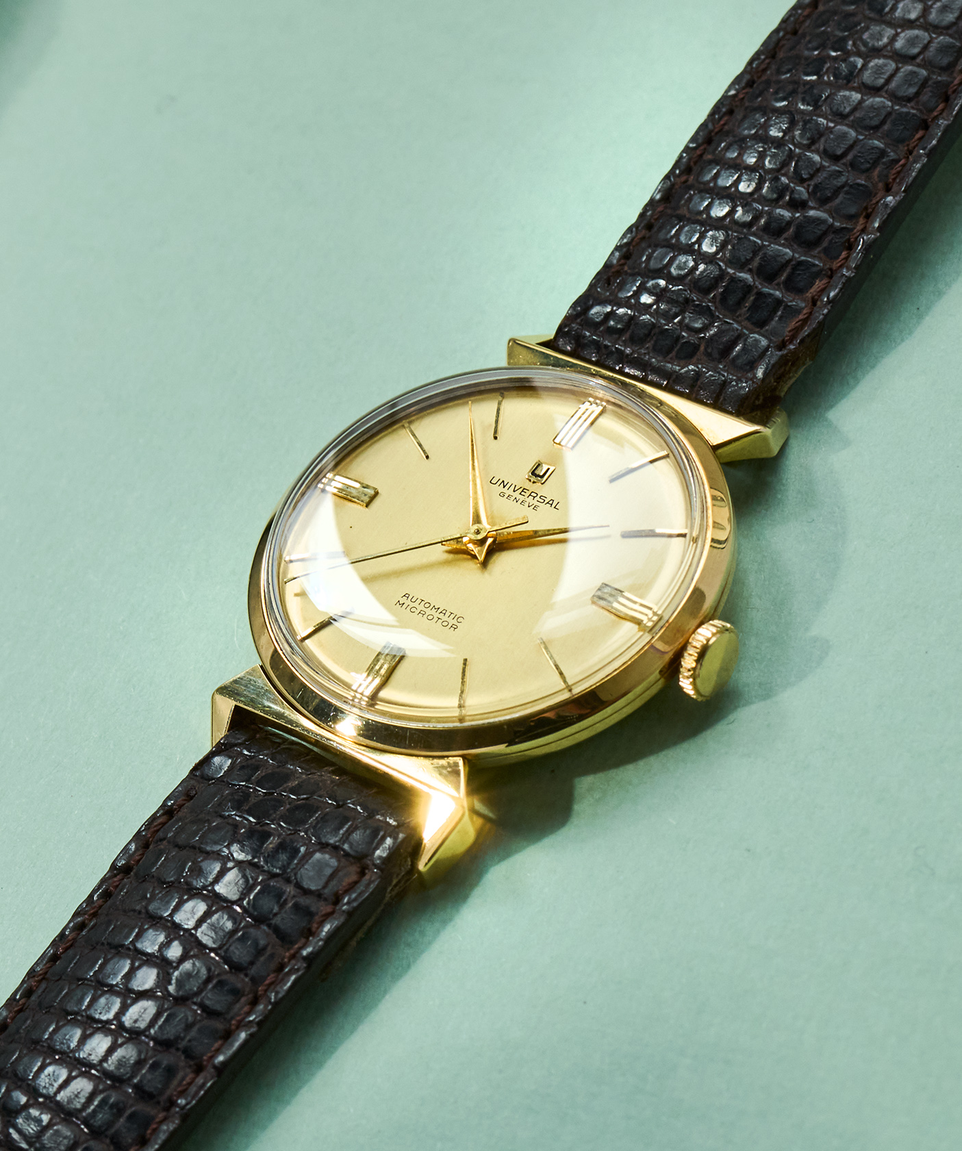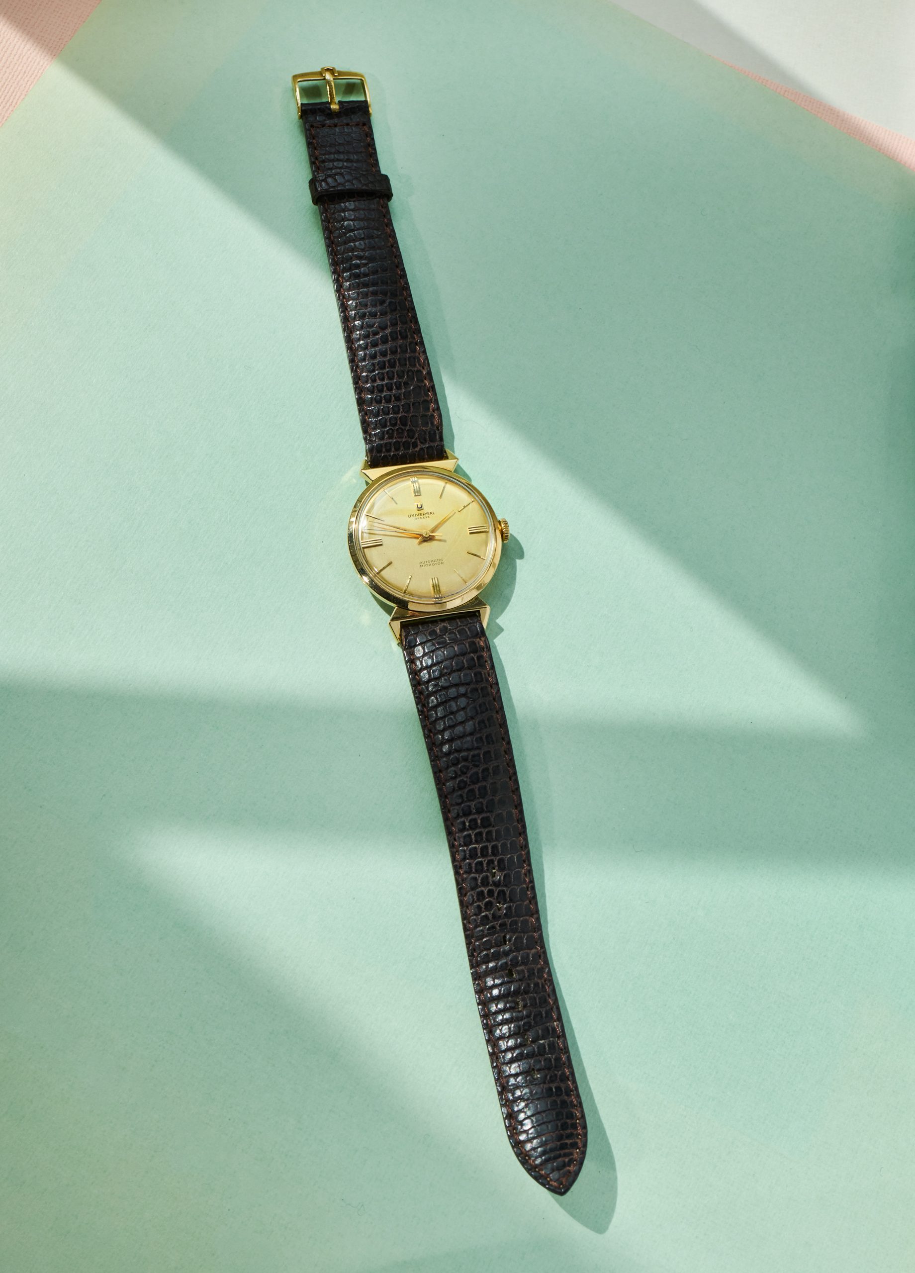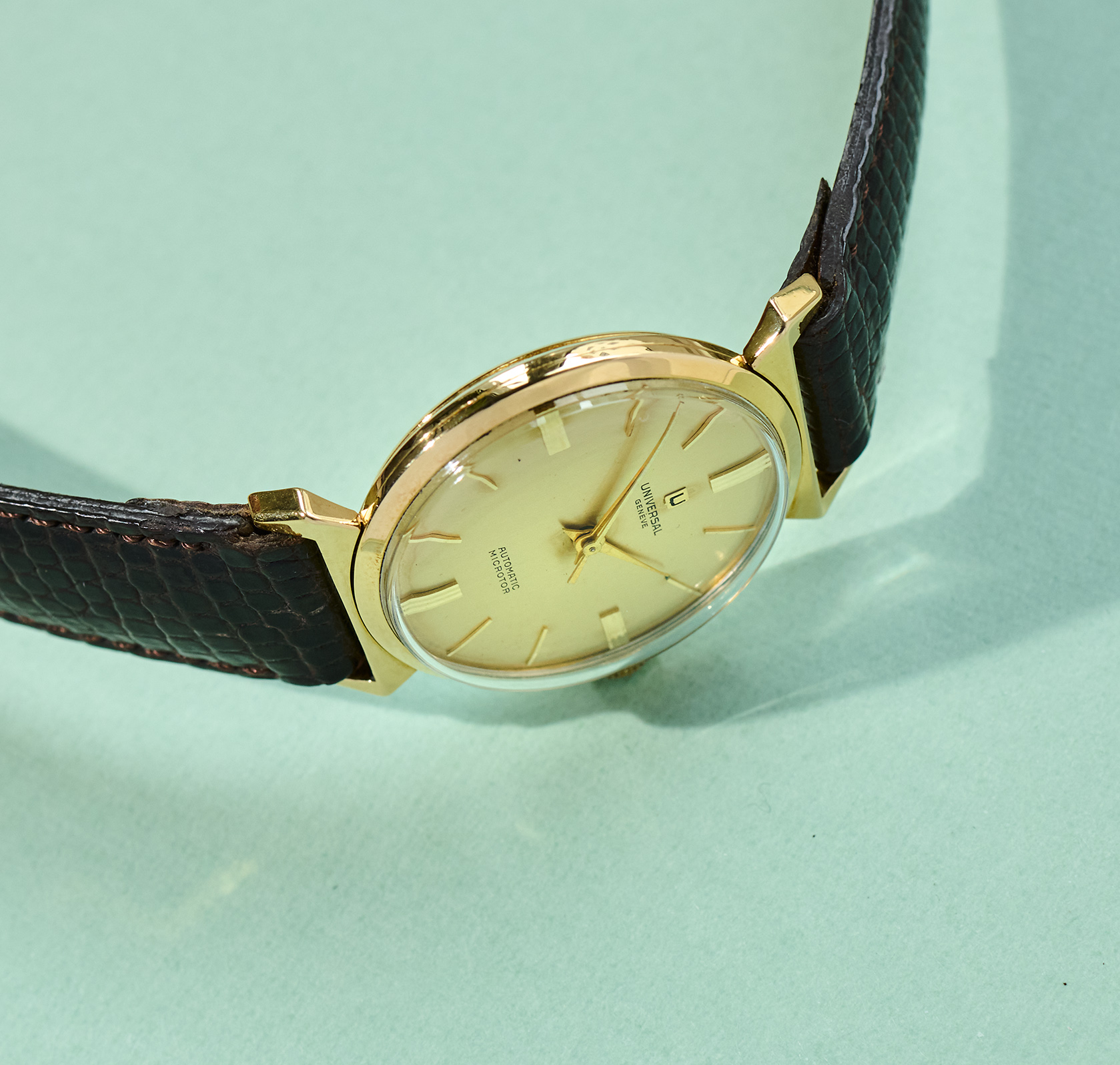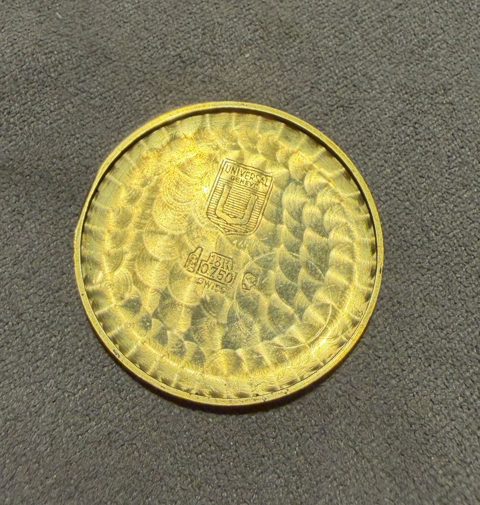 this is a rare UNIVERSAL Geneve dresswatch in 18k yellowgold from the mid 1960s. The 33mm goldcase features an amazing design with „crab-leg-lugs“ and of course shows all necessary hallmarks. The reference 10368 1 is powered by an automatic microtor calibre 215 which is running well, not being in the need for a service currently. It´s the same famous caliber we know from the Polerouters. The UG comes on a brown vintage lizzard leatherstrap (must be disassembled for shipments to outside the European Union). The back cover has two small dents that are only visible when held up to the light. It´s golden dial and handset are in untouched and full original condition.