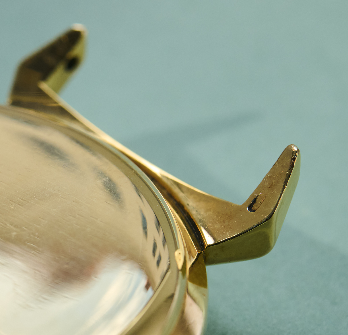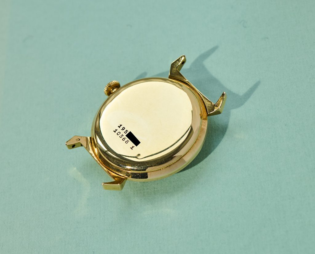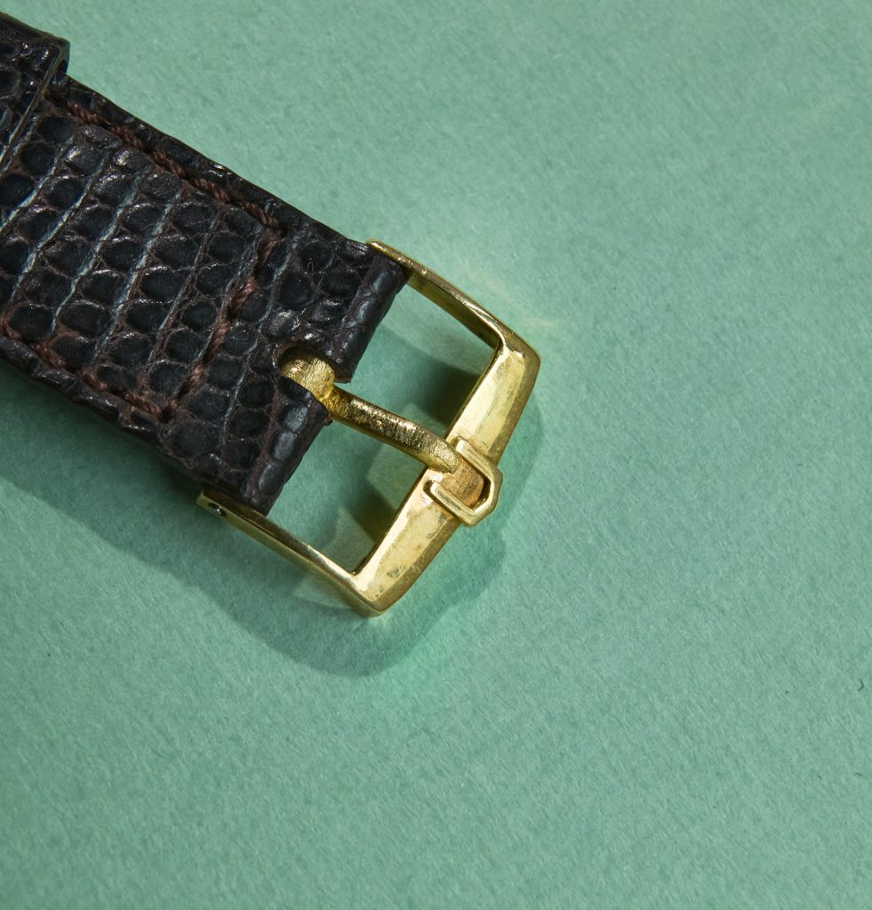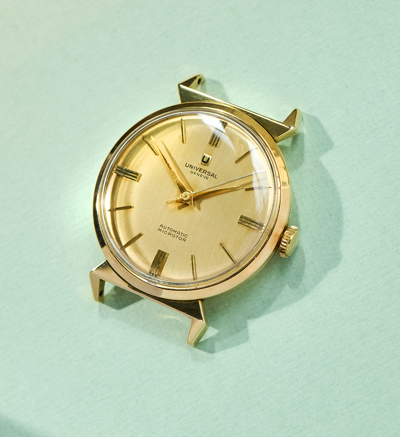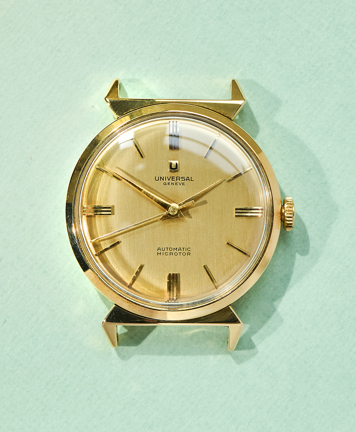 this is a rare UNIVERSAL Geneve dresswatch in 18k yellowgold from the mid 1960s. The 33mm goldcase features an amazing design with „crab-leg-lugs“ and of course shows all necessary hallmarks. The reference 10368 1 is powered by an automatic microtor calibre 215 which is running well, not being in the need for a service currently. It´s the same famous caliber we know from the Polerouters. The UG comes on a brown vintage lizzard leatherstrap (must be disassembled for shipments to outside the European Union). The back cover has two small dents that are only visible when held up to the light. It´s golden dial and handset are in untouched and full original condition.