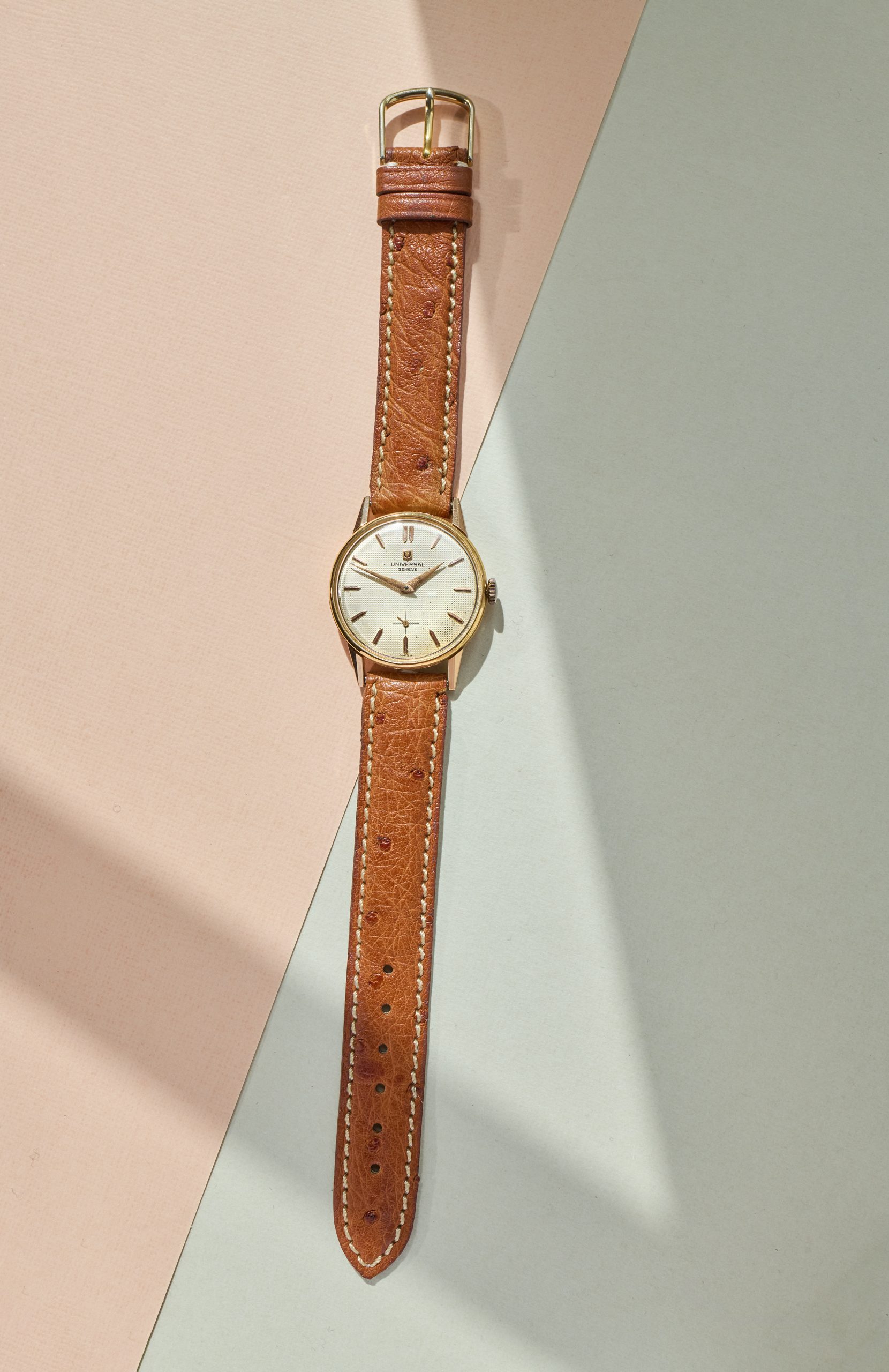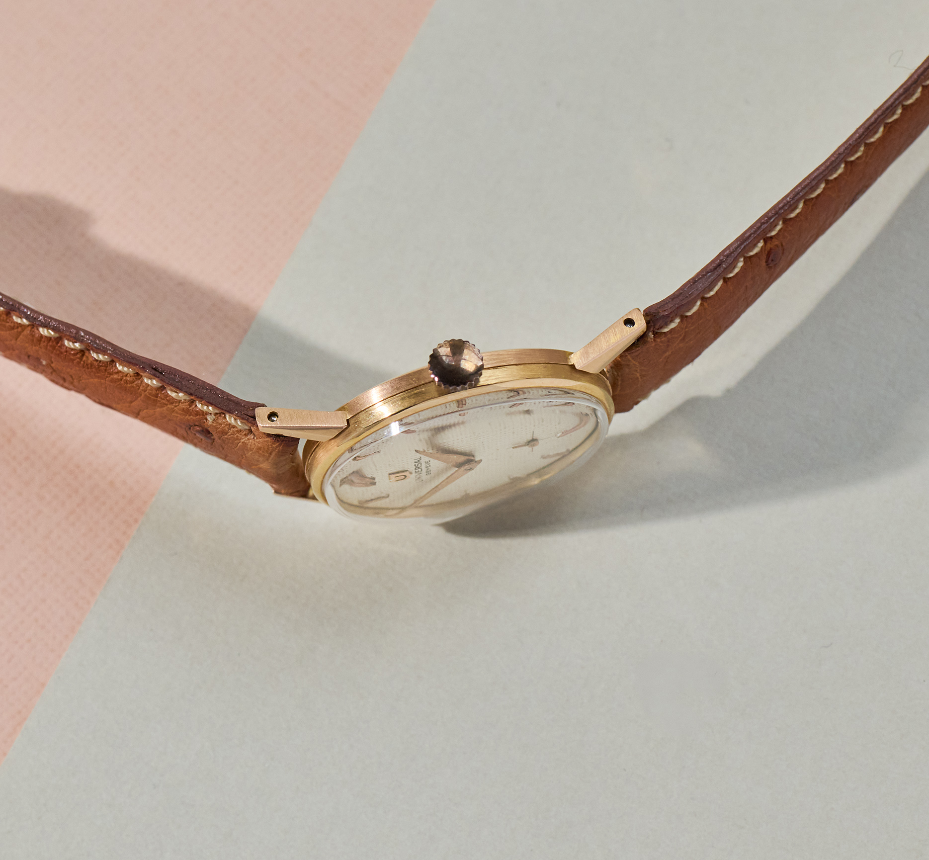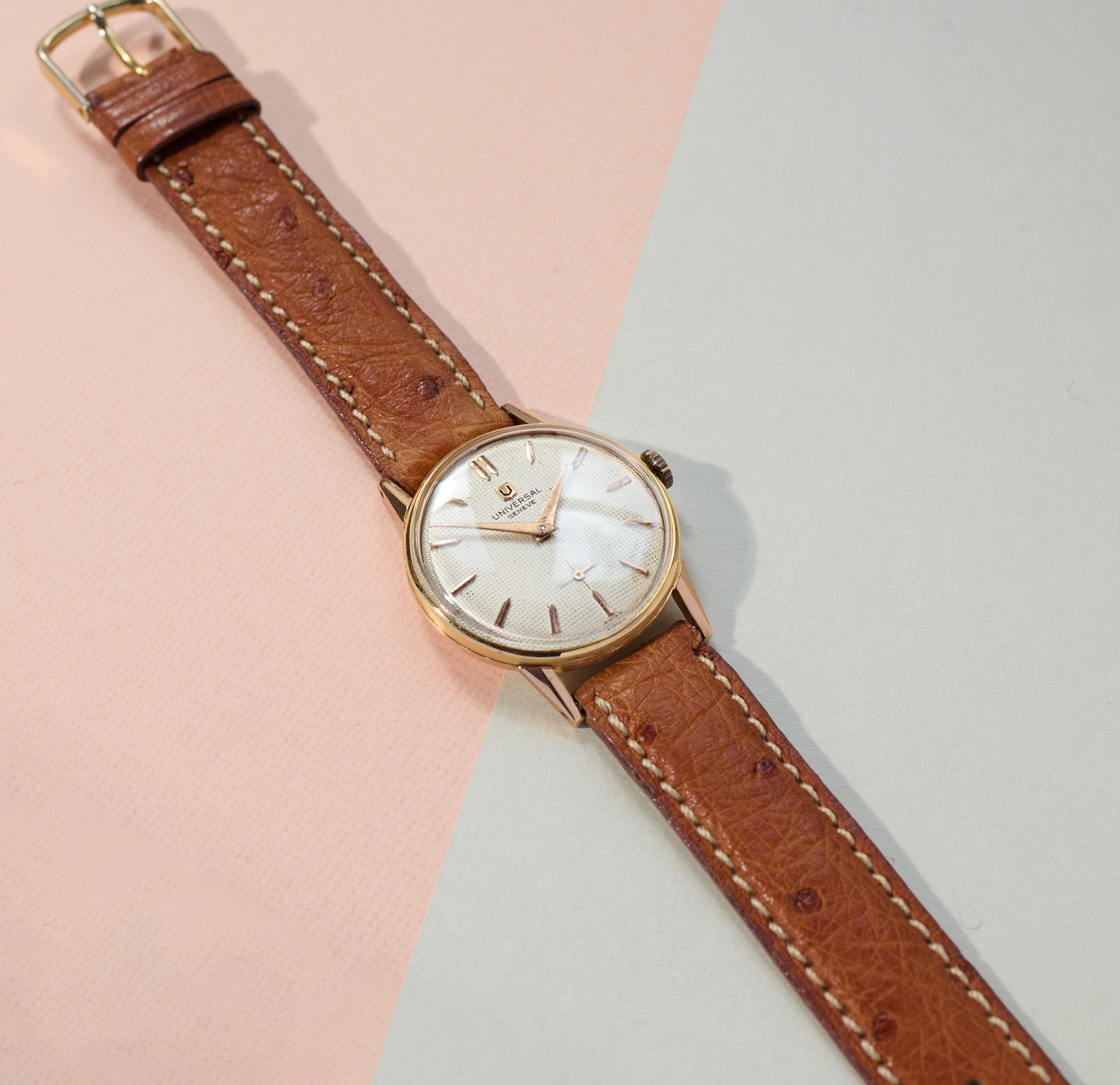 this is a charming Universal Geneve dresswatch from the 1960s in 18k rosegold. The 30mm goldcase is still unpolished and shows all numbers and hallmarks you would want to see. The cremewhite dial with honeycomb pattern shows some patina and is in full original condition. The handwinding UG caliber 330 is in good working order not being in the need for a service currently. This watch comes on a leatherband in cognac-color.