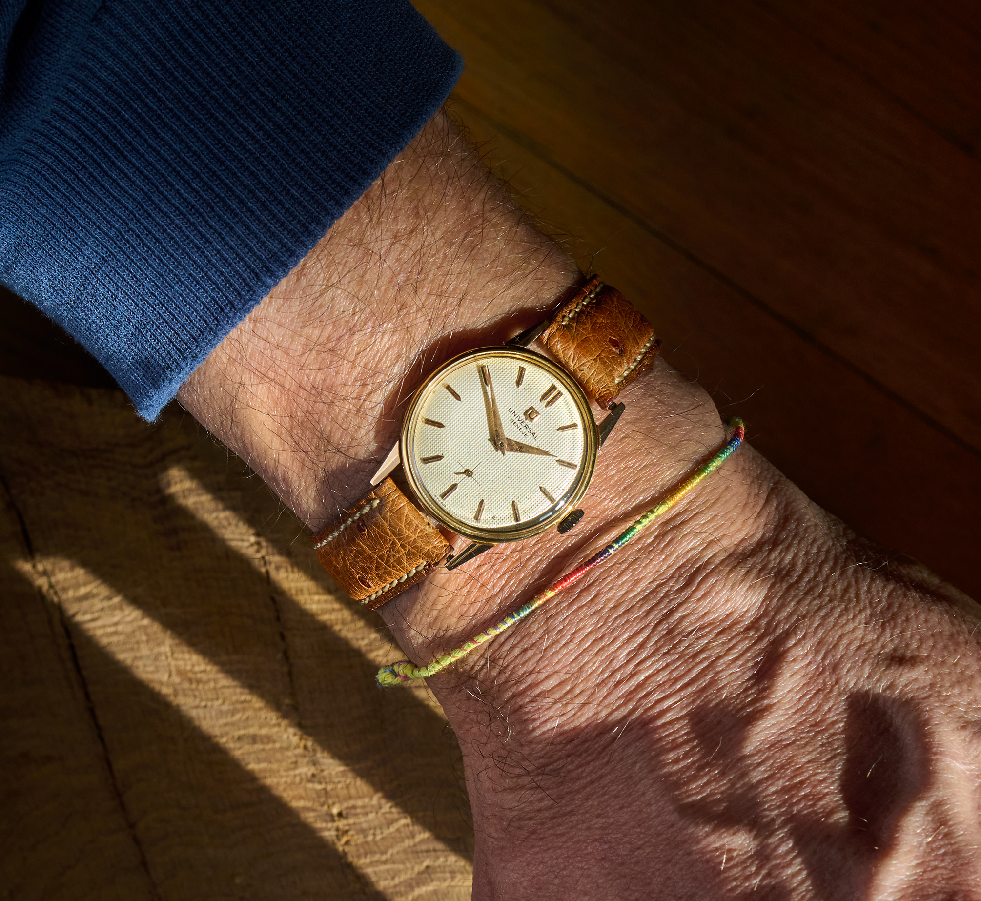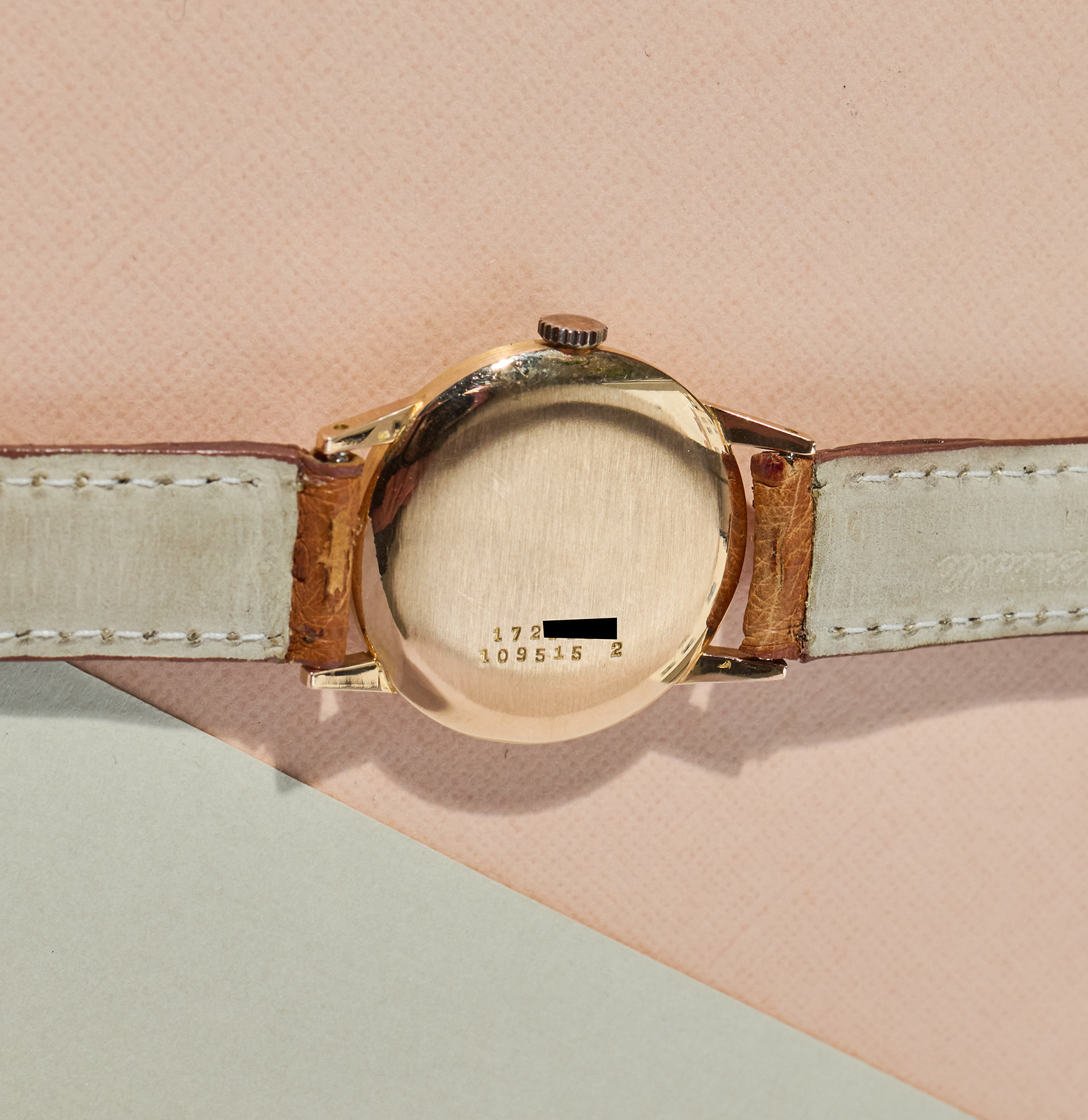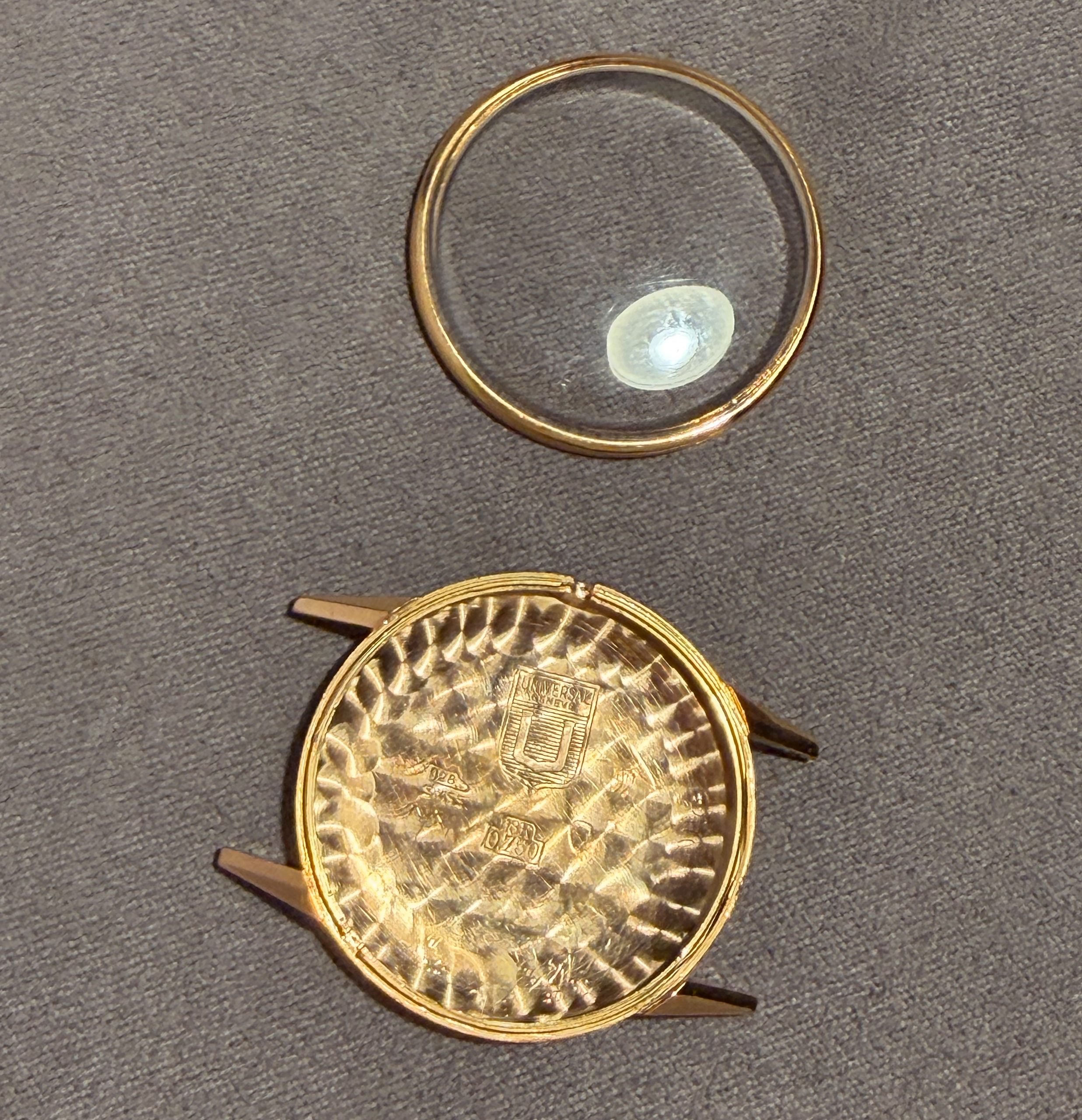this is a charming Universal Geneve dresswatch from the 1960s in 18k rosegold. The 30mm goldcase is still unpolished and shows all numbers and hallmarks you would want to see. The cremewhite dial with honeycomb pattern shows some patina and is in full original condition. The handwinding UG caliber 330 is in good working order not being in the need for a service currently. This watch comes on a leatherband in cognac-color.