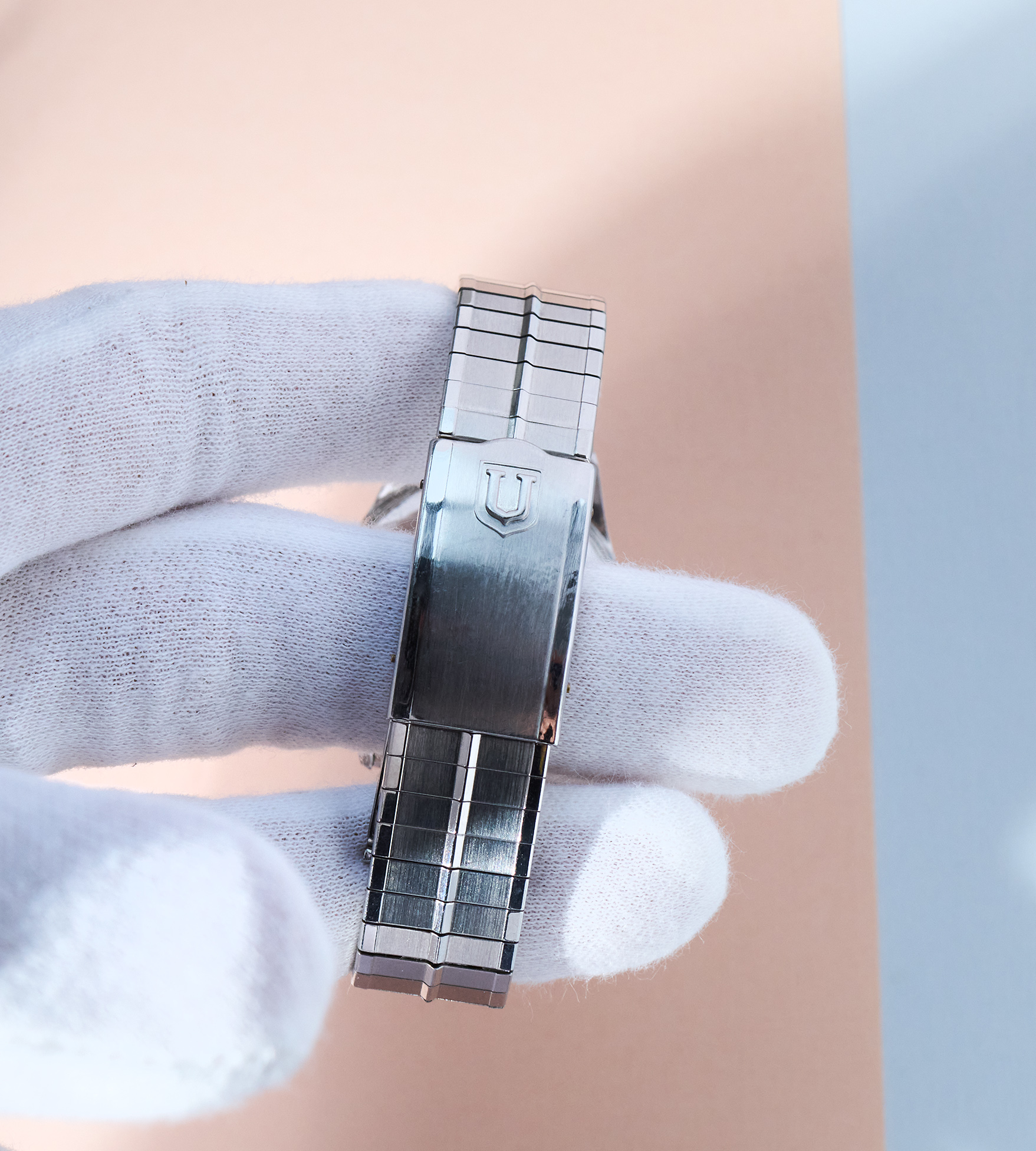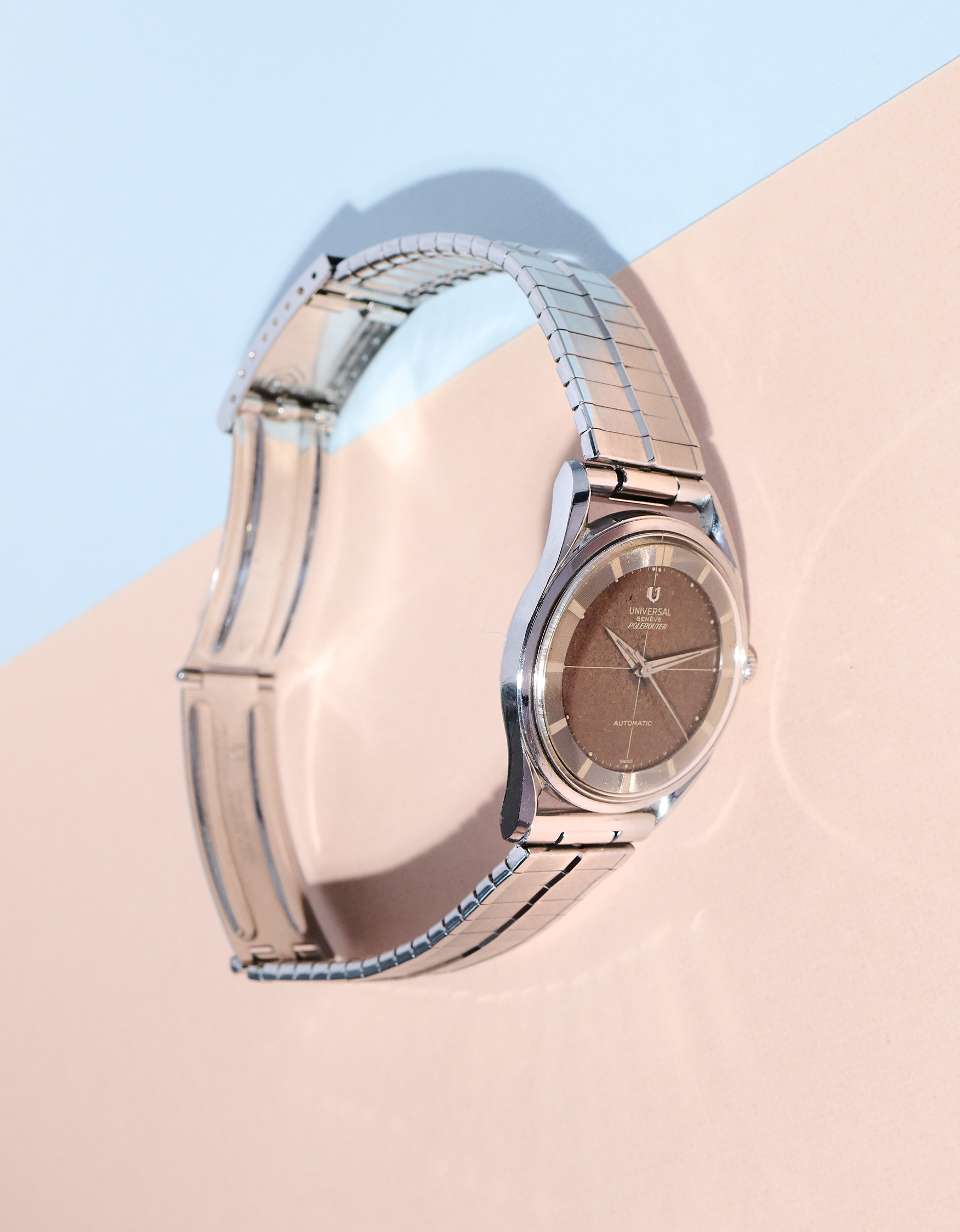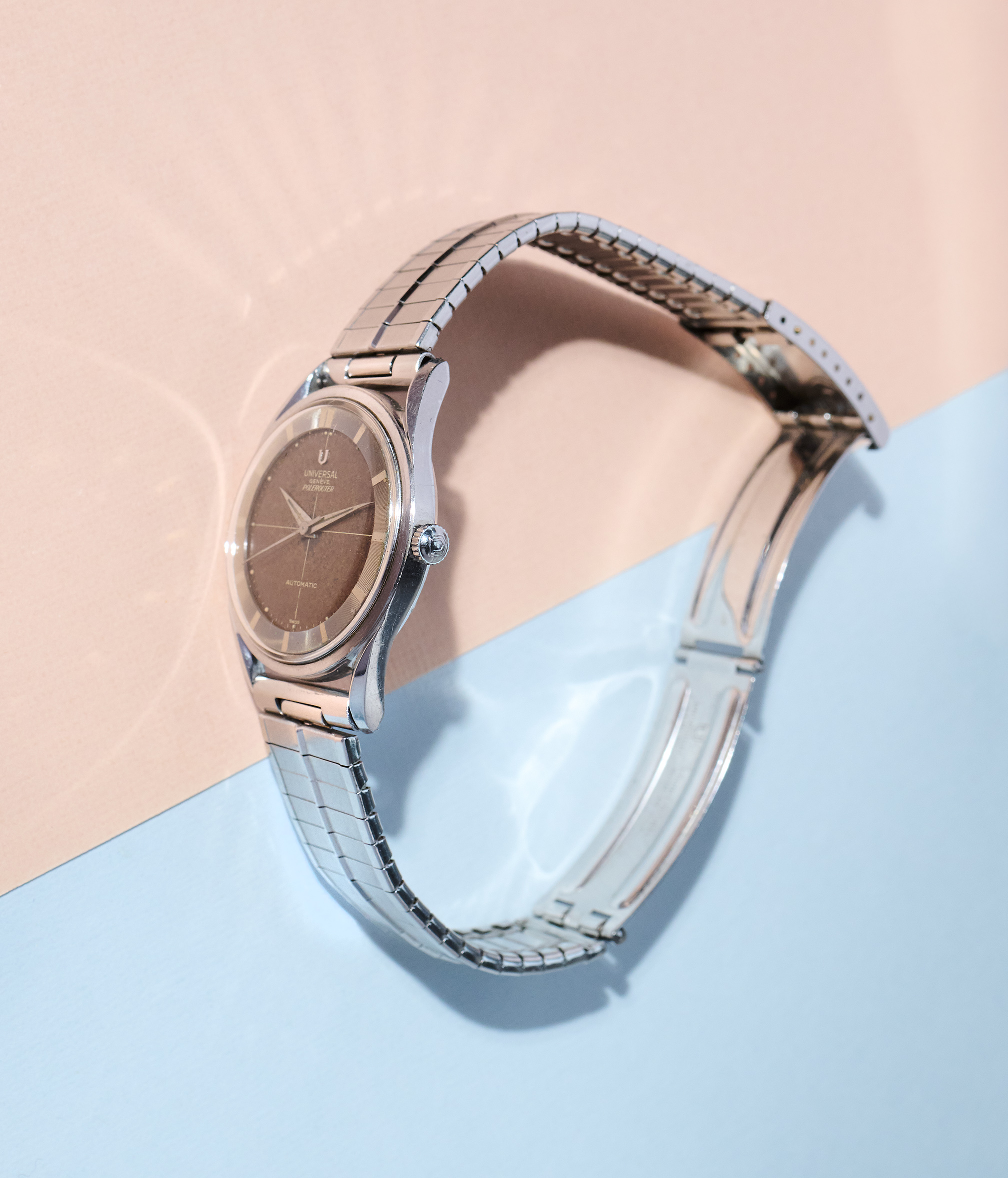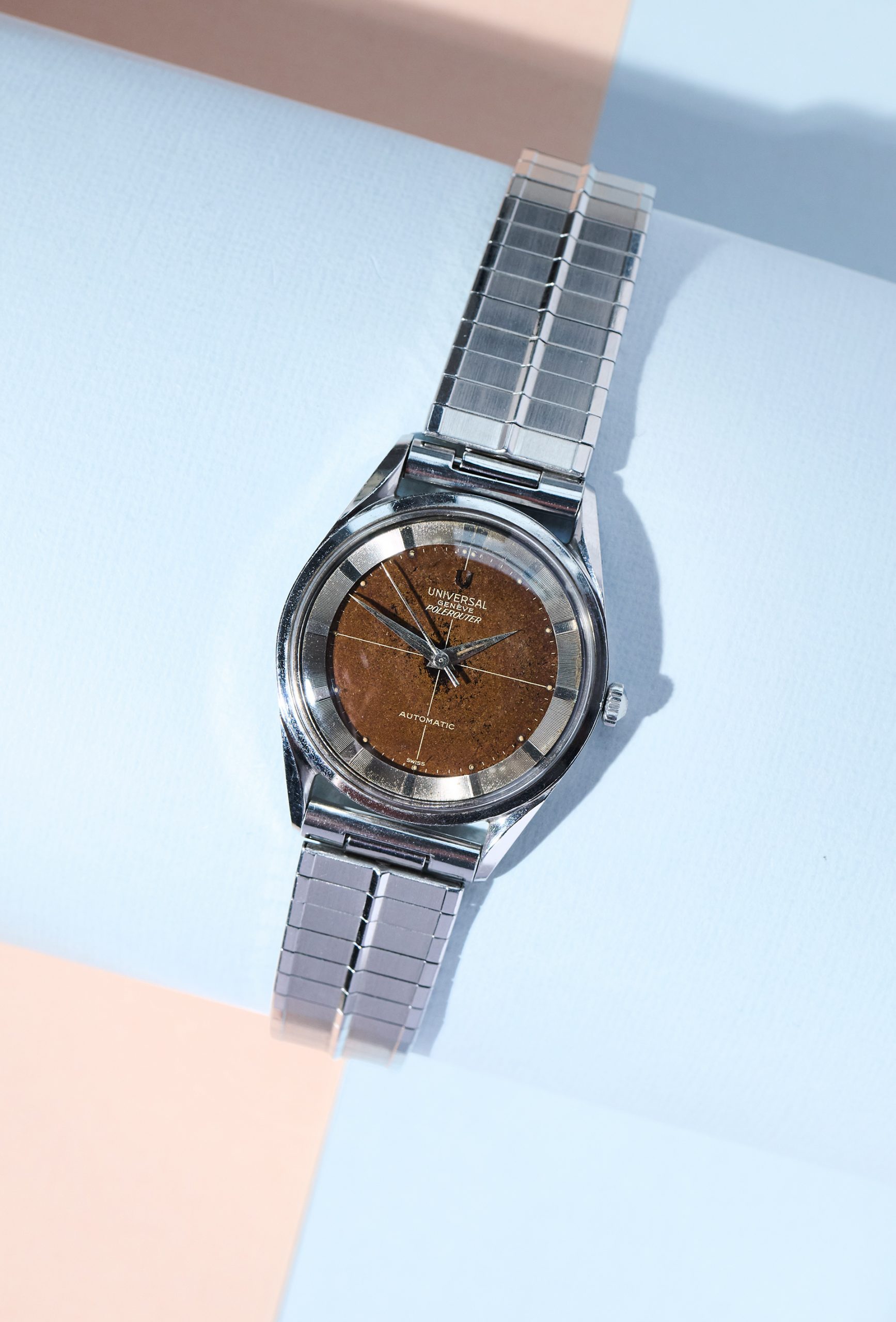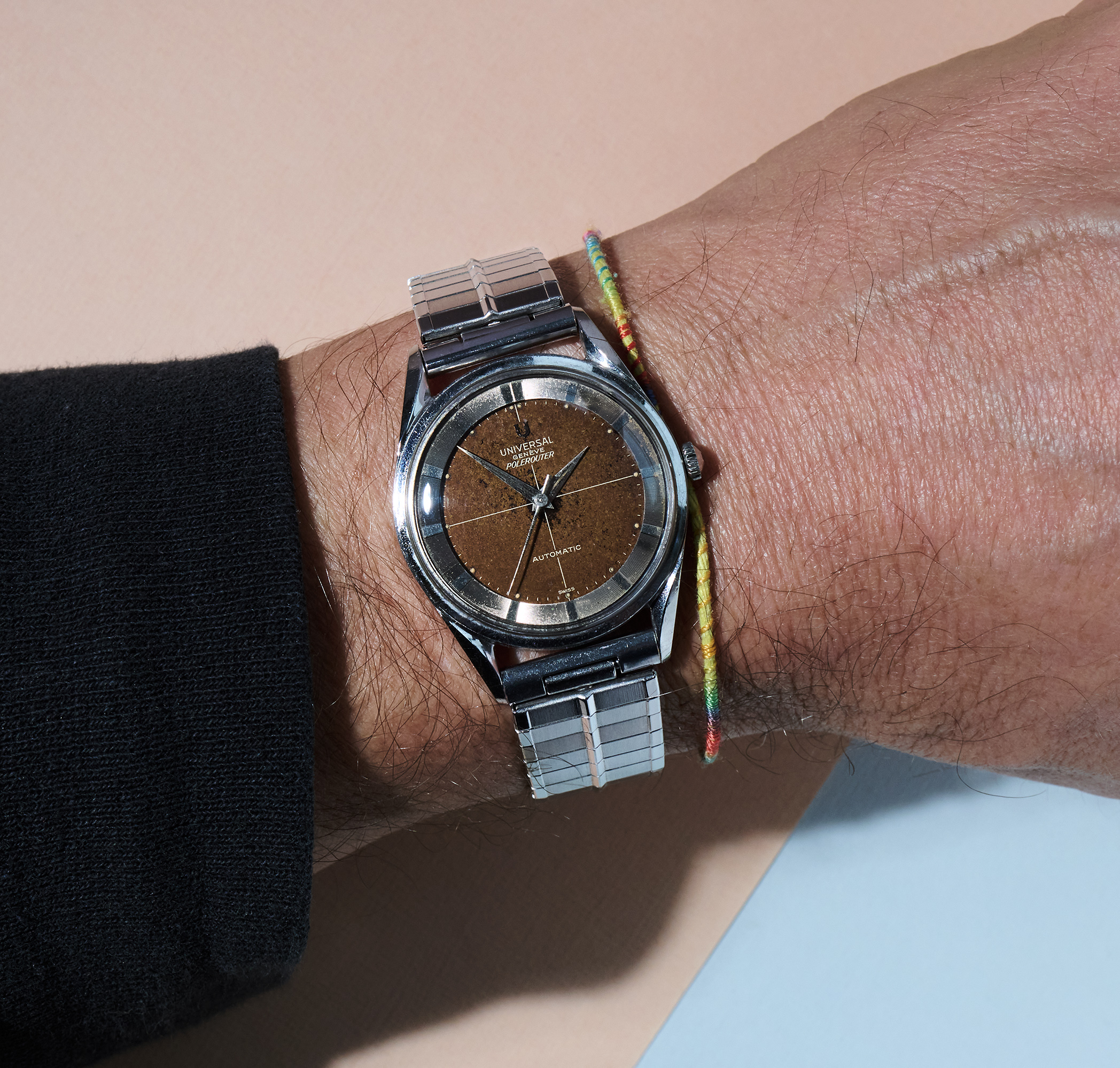 This is a wonderfully patinated Universal Geneve Polerouter from 1963, which was also featured in the famous Polerouter book by Willis & Mazzucchi. The dial with gilt printing and crosshair design still has all its tritium plots and impresses with a beautiful tropical patina. The reference 20368/1 comes with exactly the same UG steel bracelet as shown in the book. The 34 mm steelcase is still unpolished and the automatic microtor caliber 218,9 accuracy is so good that it currently does not need servicing. All parts of the watch, from the signed crown to the signed plexiglass, are original. With the steel bracelet, the watch fits wrists with a circumference up to 18 cm.