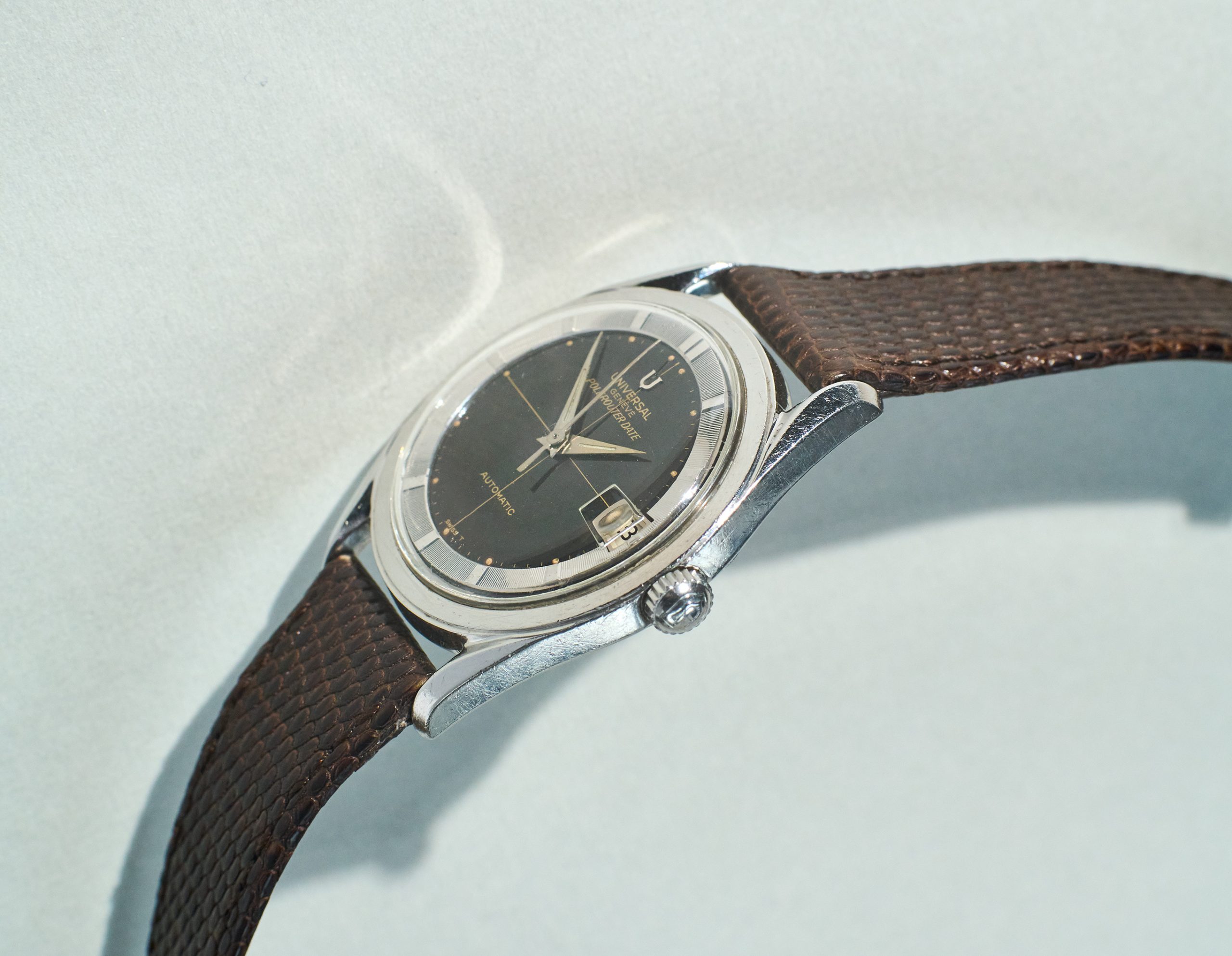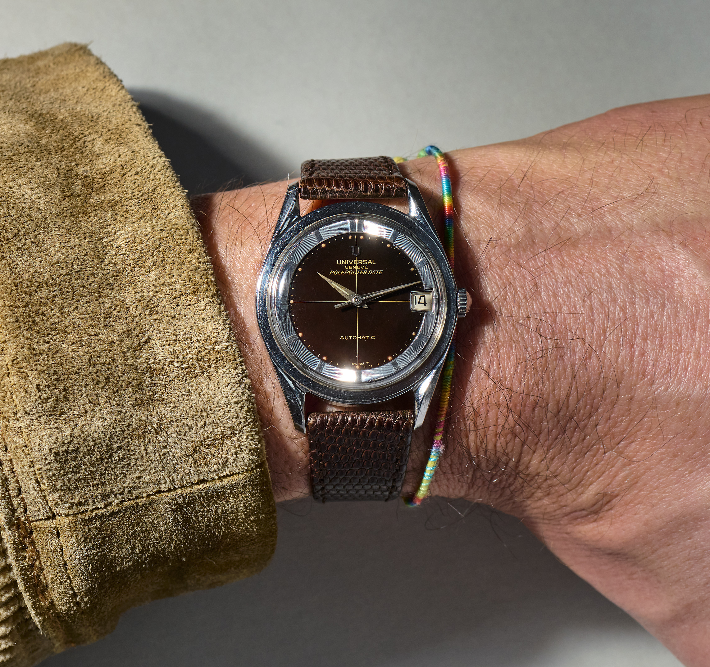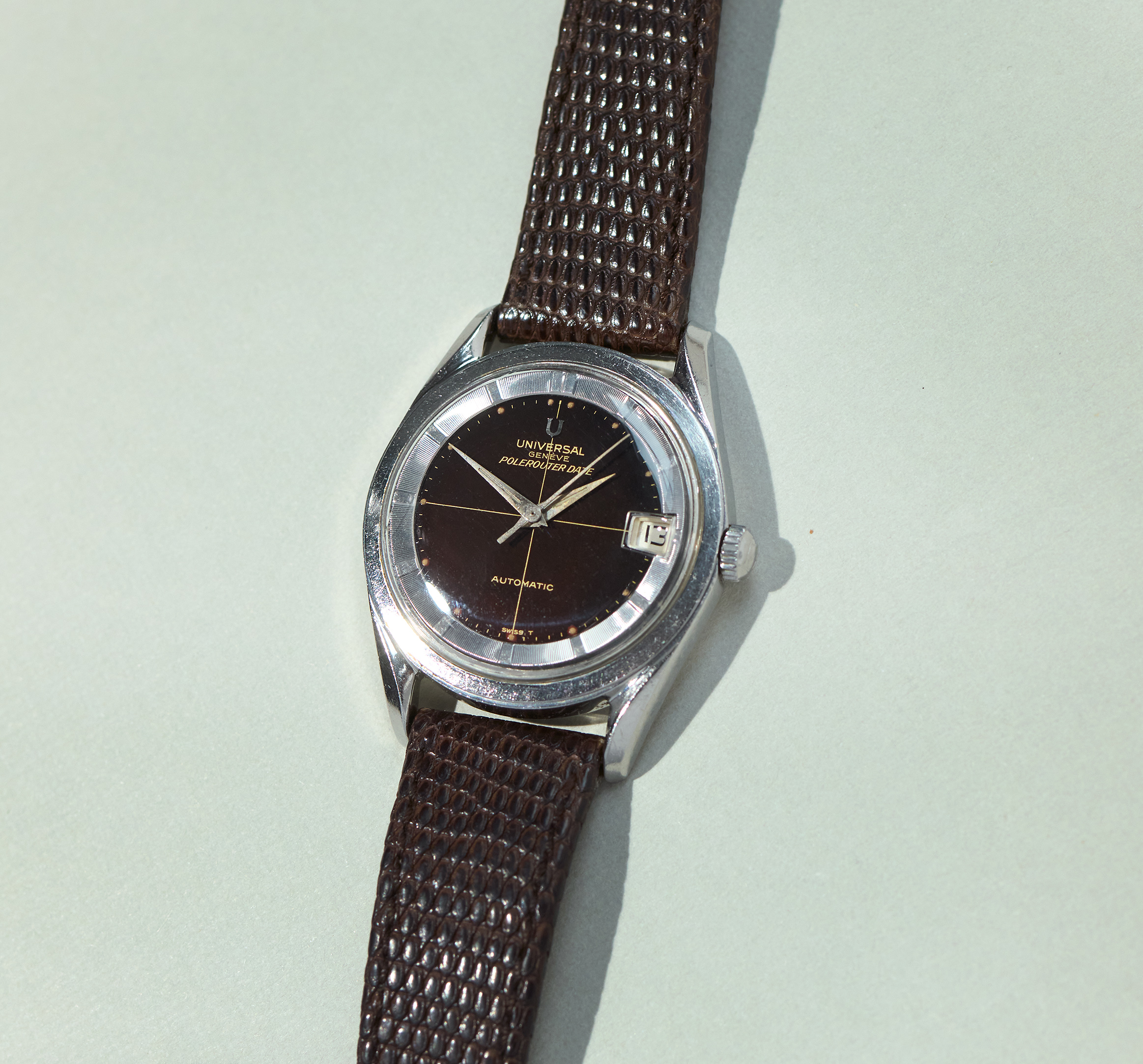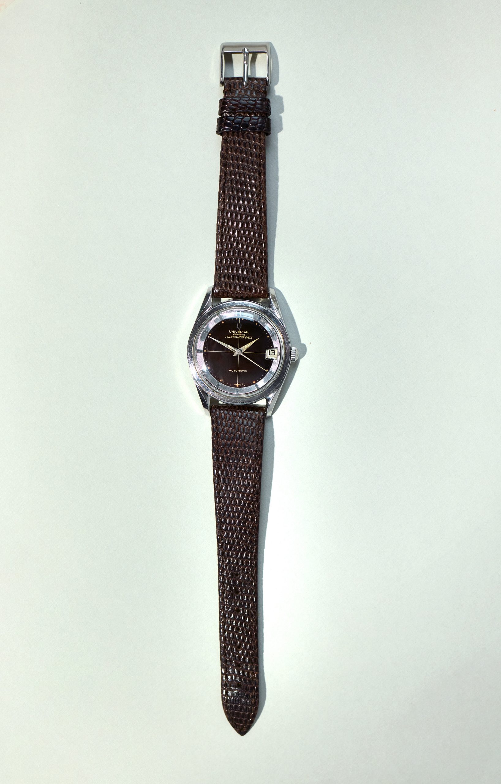 this is an absolutely stunning Universal Geneve Polerouter (ref. 869111/01) from 1965 featuring a glossy tropical dial with gilt printing. The 35,5 mm steelwatch appears to be unpolished, showing all numbers and even the Polerouter-globe-engraving in full original condition. The crown, as well as the plexi, are engraved with the famous „U“. The dial itself is in outstanding good and untouched condition with no blemishes and appears in a beautiful darkbrown hazelnut tone, depending on the angle you hold it. The magic of this dial is very hard to decribe but you will immidiately fall in love when seeing it in real life and even more in sunlight. The UG microtor automatic caliber 69 has just received a full service by our watchmaker and runs perfectly. This is Gerald Genta´s famous Polerouter with one of the most beautifullest faces one could imagine. The UG comes on a matching brown leatherstrap with steel buckle.