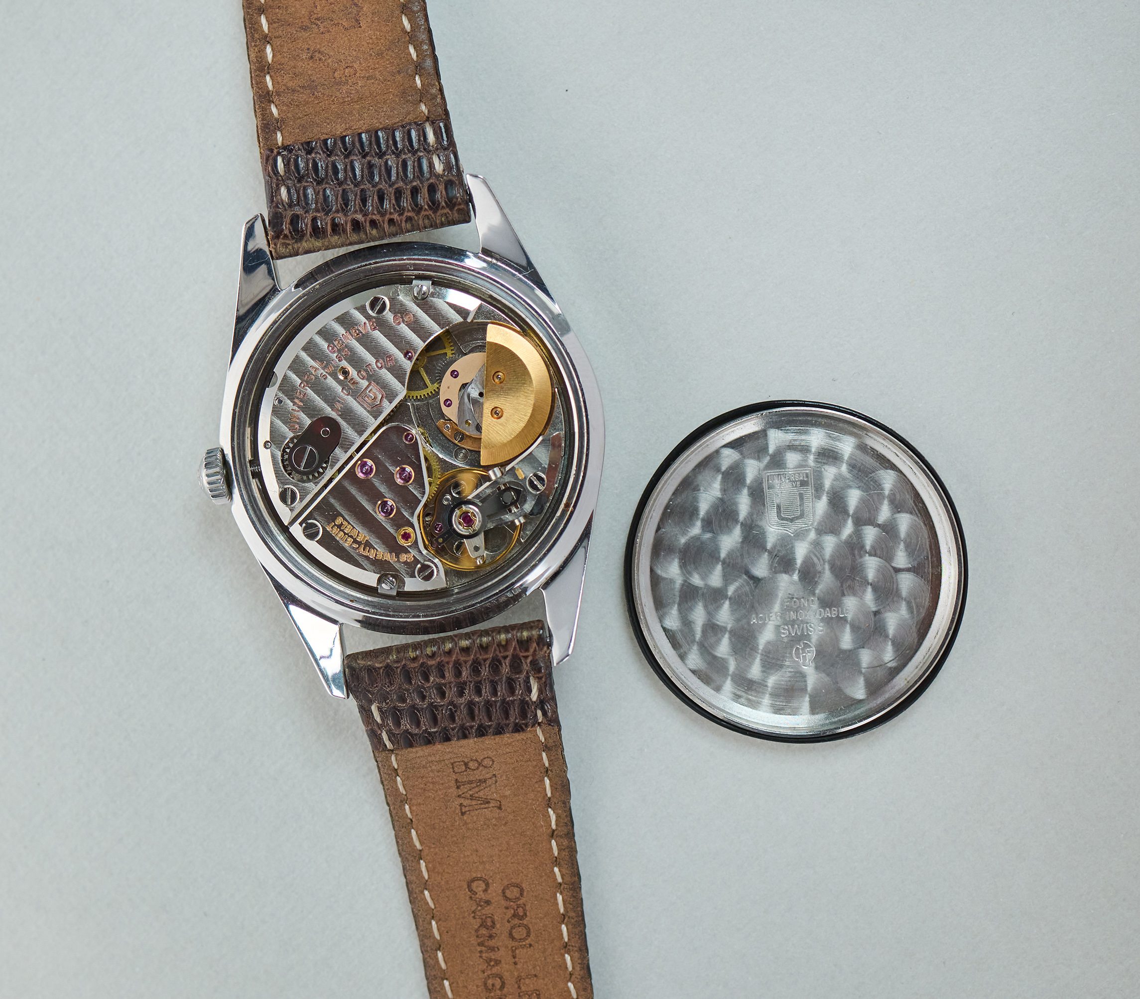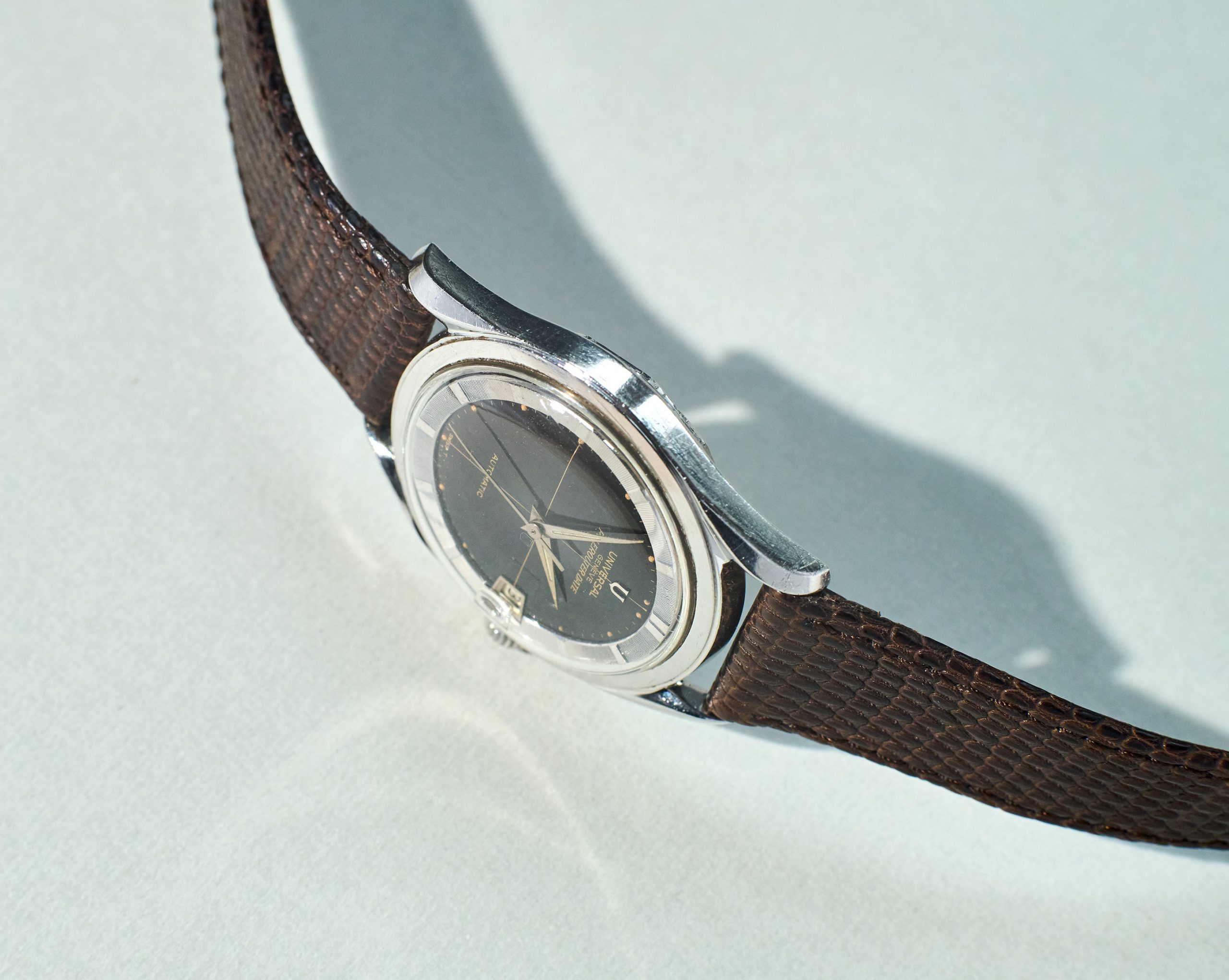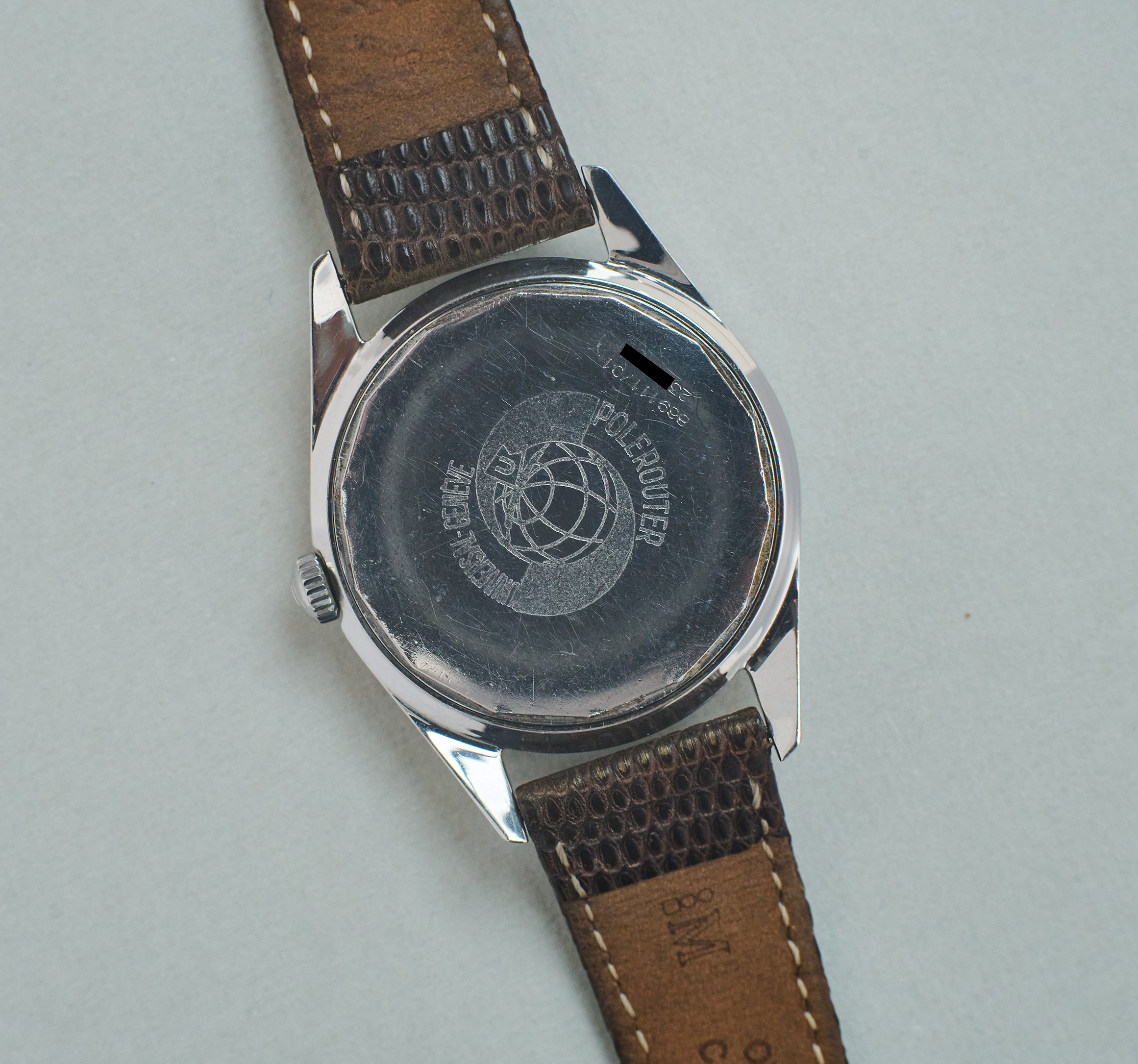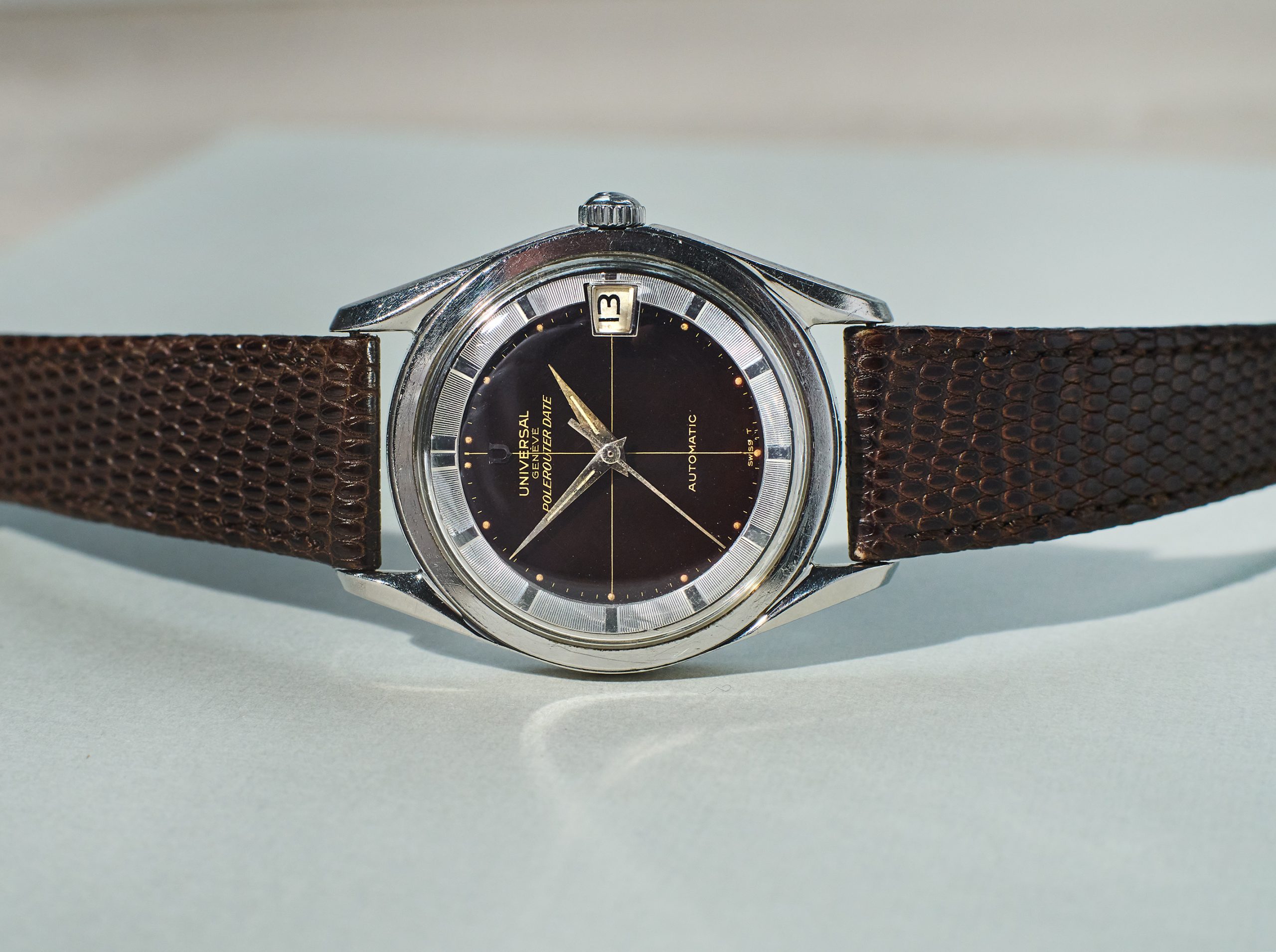 this is an absolutely stunning Universal Geneve Polerouter (ref. 869111/01) from 1965 featuring a glossy tropical dial with gilt printing. The 35,5 mm steelwatch appears to be unpolished, showing all numbers and even the Polerouter-globe-engraving in full original condition. The crown, as well as the plexi, are engraved with the famous „U“. The dial itself is in outstanding good and untouched condition with no blemishes and appears in a beautiful darkbrown hazelnut tone, depending on the angle you hold it. The magic of this dial is very hard to decribe but you will immidiately fall in love when seeing it in real life and even more in sunlight. The UG microtor automatic caliber 69 has just received a full service by our watchmaker and runs perfectly. This is Gerald Genta´s famous Polerouter with one of the most beautifullest faces one could imagine. The UG comes on a matching brown leatherstrap with steel buckle.