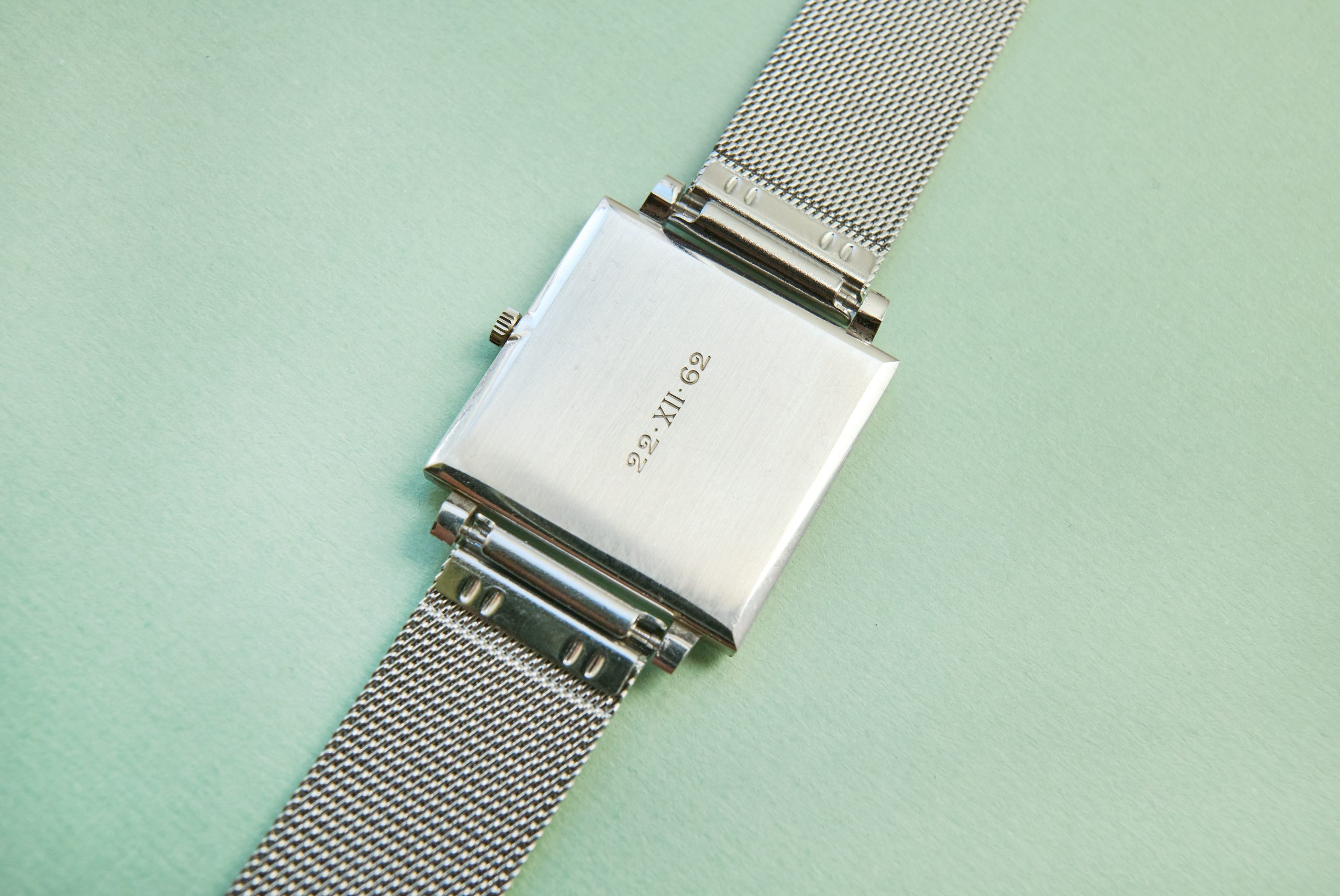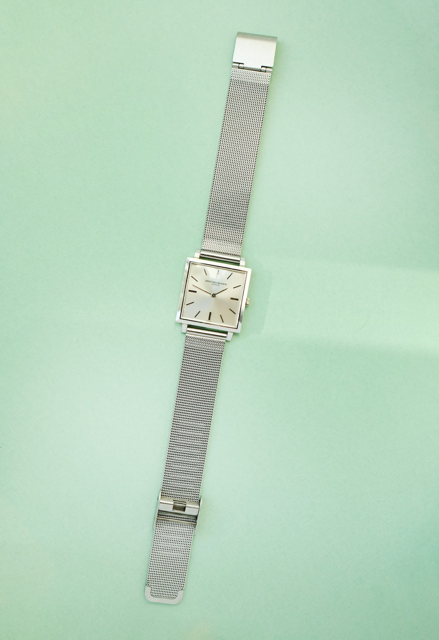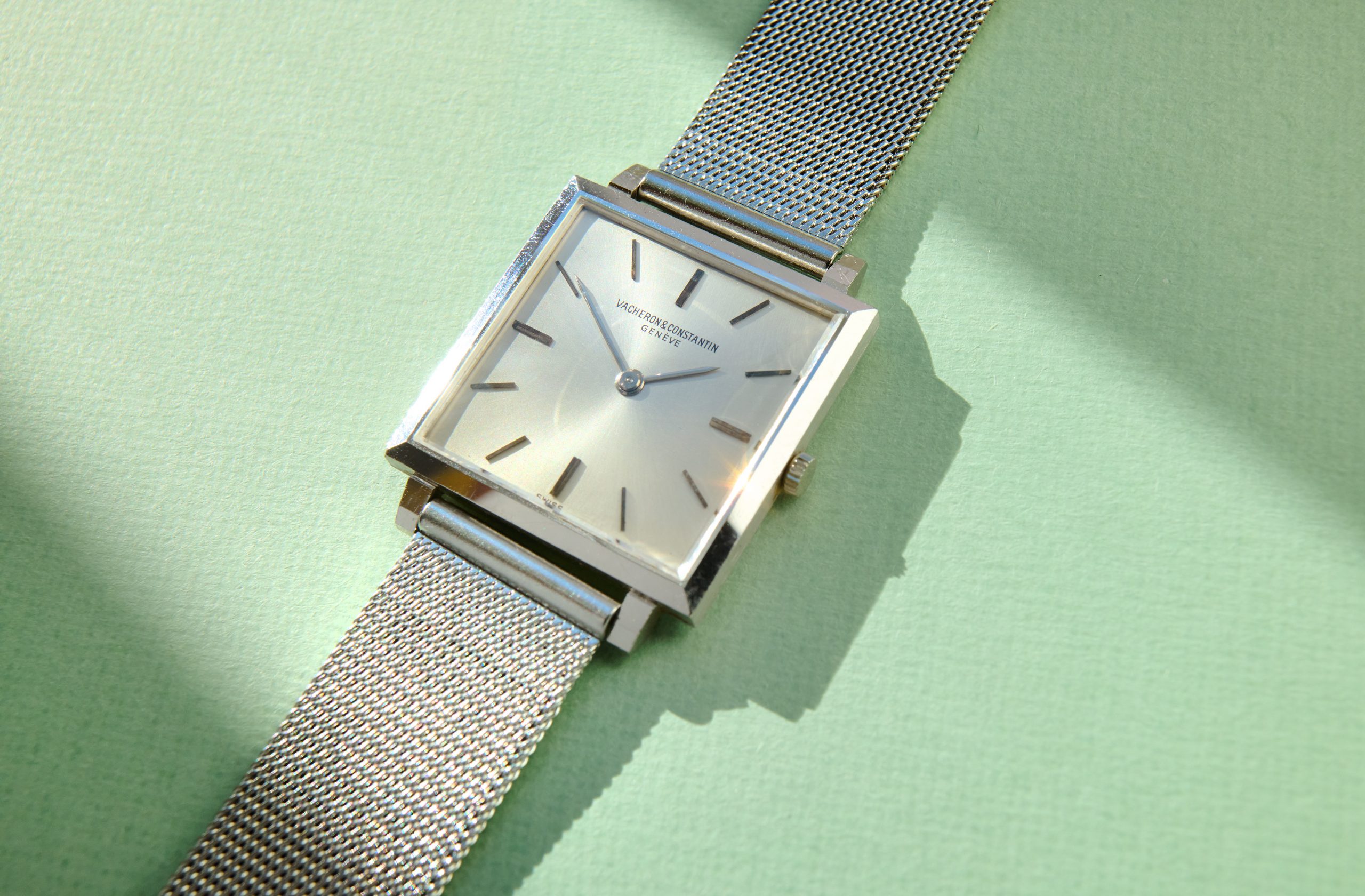 this is a beautiful and rare Vacheron Constantin dresswatch from the early 1960s in 18k whitegold. The reference 6290 with a 25,5 mm square case appears to be unpolished and with a flawless champaign-color dial. We offer it on a steel milanese bracelet (worldwide) or a black croco-leatherstrap (only EU market). The superflat handwinding VC caliber 1003 is in perfectly working order and not in the need for a service currently. The movement is engraved with the seal of geneva, the official quality hallmark awarded only to watch movements that meet strict standards of craftsmanship, origin, and reliability. The caseback features a charming engraving, writing „22. XII. 62“. Compared to other square dress watches from this period, this VC is slightly larger and looks wonderful and balanced on the wrist. Its ultra-flat design makes it an exclusive example of the highest quality and most elegant watchmaking craftsmanship.