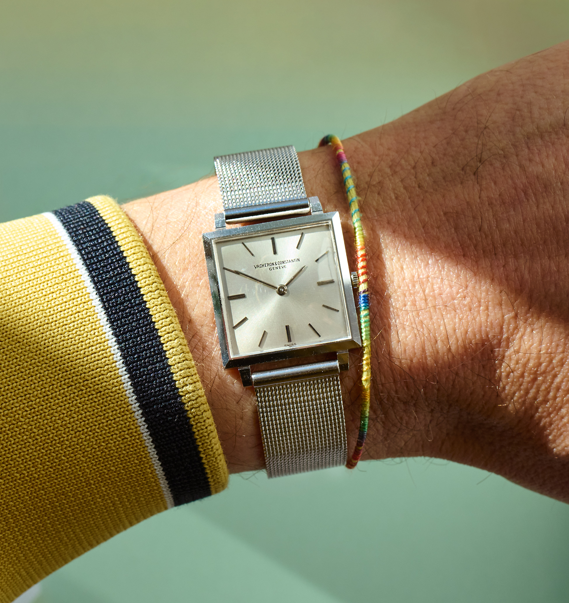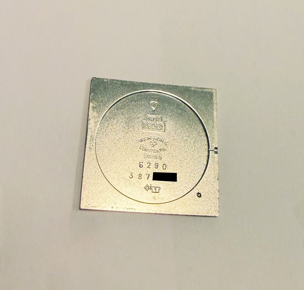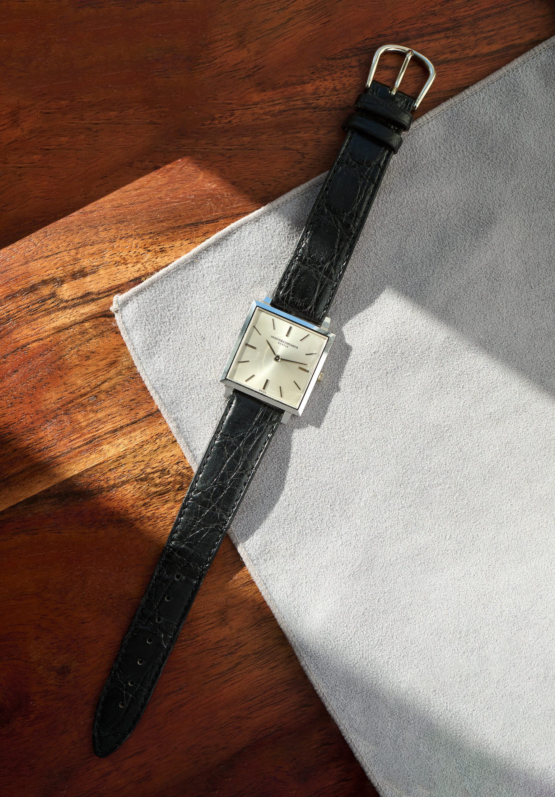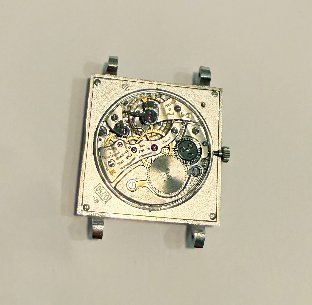 this is a beautiful and rare Vacheron Constantin dresswatch from the early 1960s in 18k whitegold. The reference 6290 with a 25,5 mm square case appears to be unpolished and with a flawless champaign-color dial. We offer it on a steel milanese bracelet (worldwide) or a black croco-leatherstrap (only EU market). The superflat handwinding VC caliber 1003 is in perfectly working order and not in the need for a service currently. The movement is engraved with the seal of geneva, the official quality hallmark awarded only to watch movements that meet strict standards of craftsmanship, origin, and reliability. The caseback features a charming engraving, writing „22. XII. 62“. Compared to other square dress watches from this period, this VC is slightly larger and looks wonderful and balanced on the wrist. Its ultra-flat design makes it an exclusive example of the highest quality and most elegant watchmaking craftsmanship.