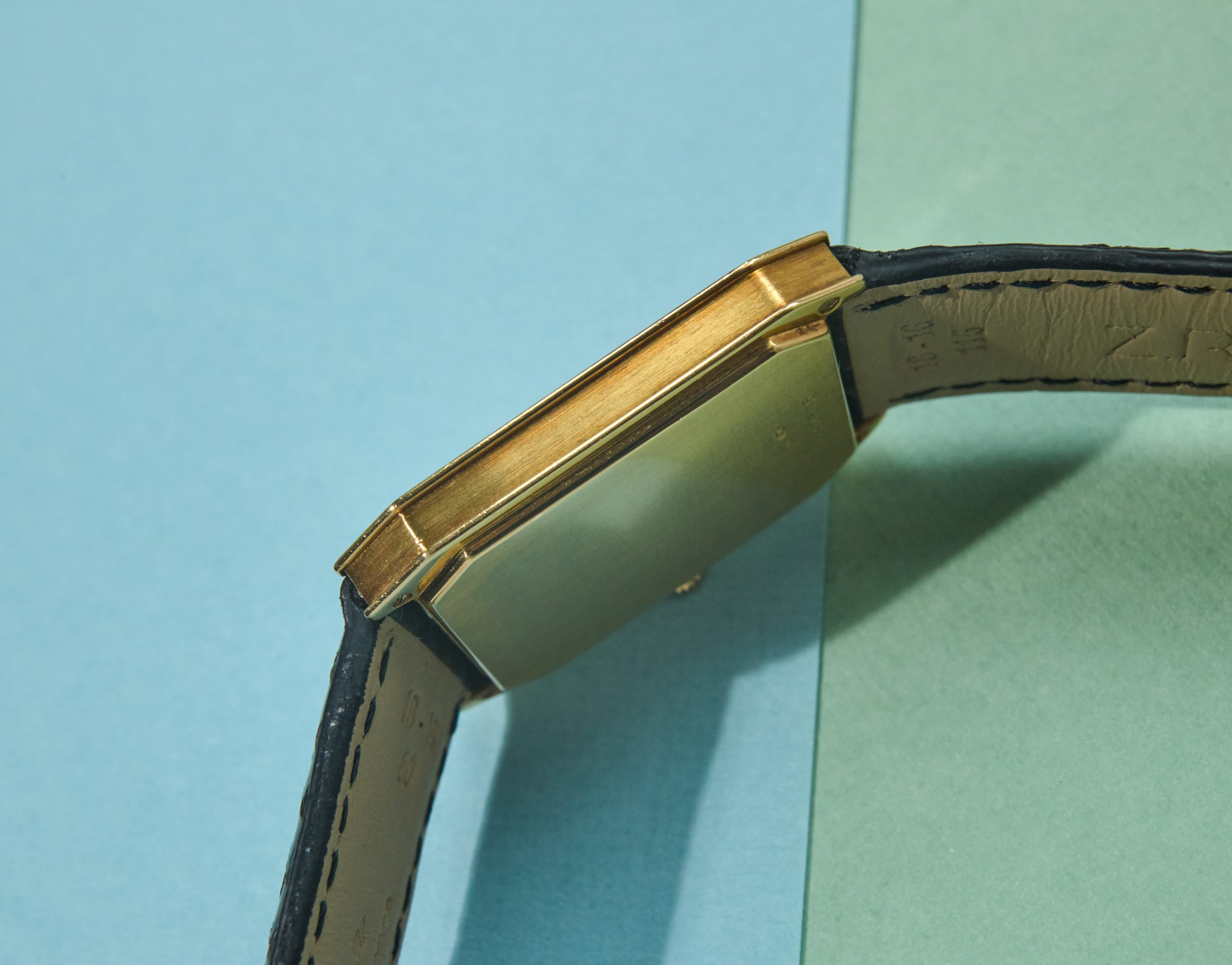 this is a rare and very interesting Vacheron Constantin, ref 39201, from the early 1980s in 18k yellowgold. The 25,2 x 28,2 mm (without crown or lugs) Tank-style case features a beautifully designed and sharp shape. the handwinding vc caliber 1015 was just serviced and even runs in chronometer norm. the golden „o swiss o“ signed sigma dial is flawless and the watch features all it‘s original parts, like handset and vc signed crown. It comes with a grey/blue leather band (only within the EU) and a brown buffalo strap in addition.